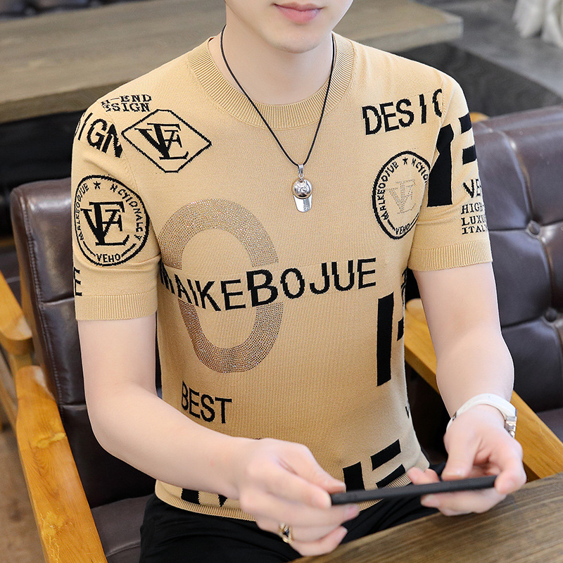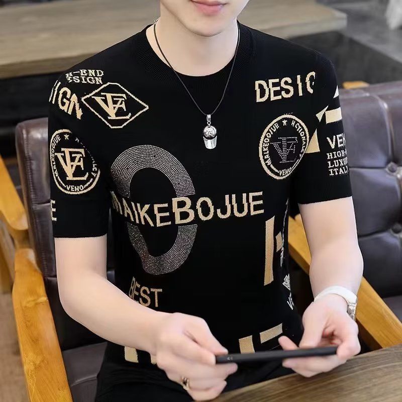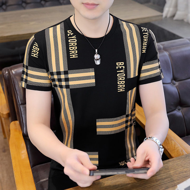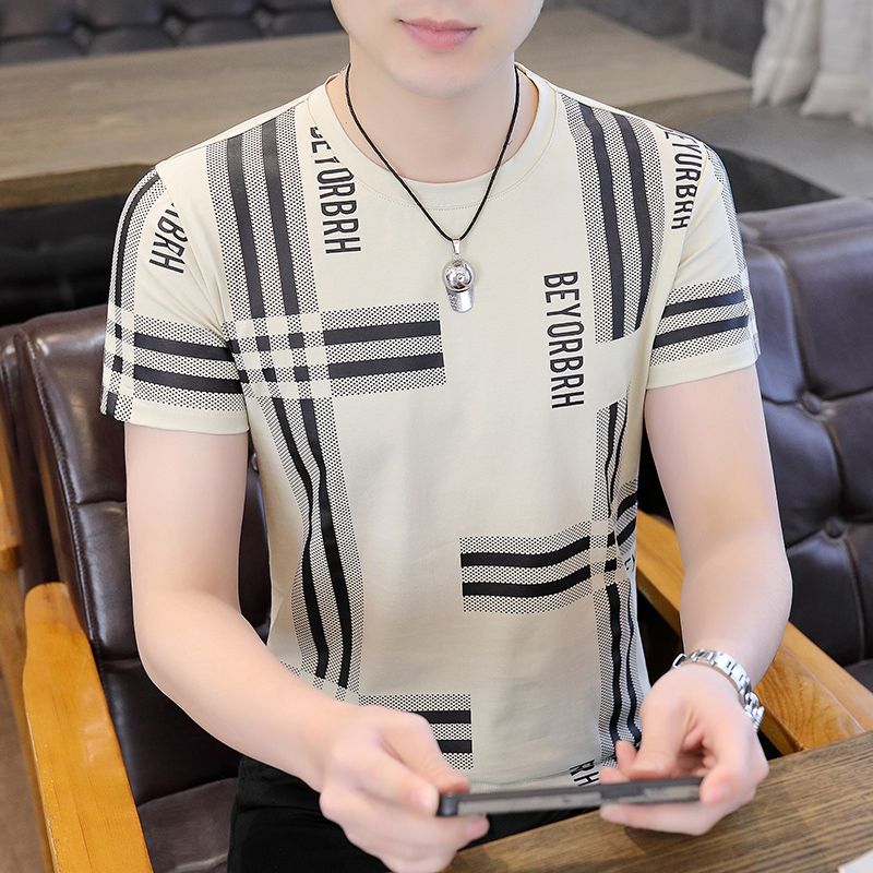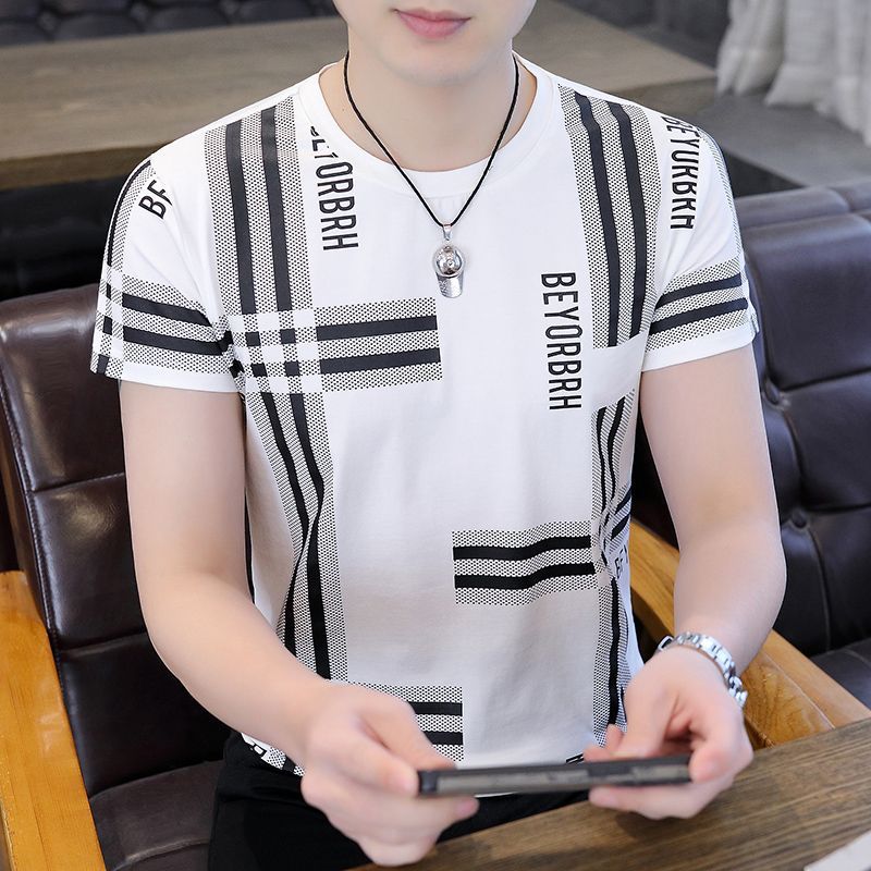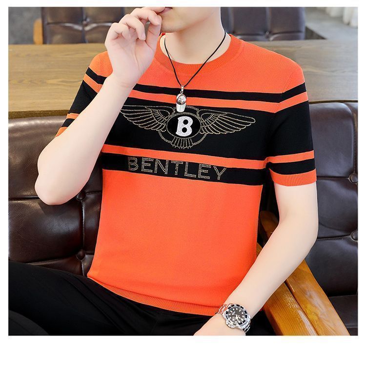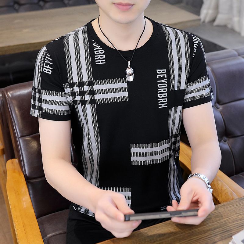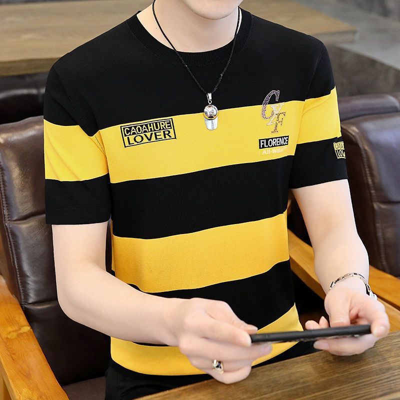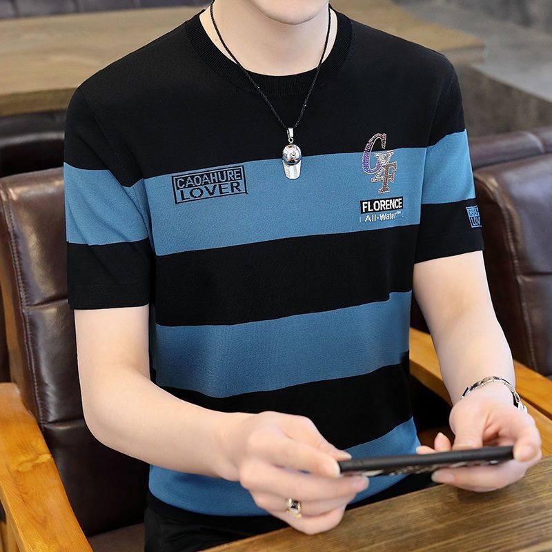 아이스 실크 반팔 티셔츠 남자 여름 라운드 넥 캐주얼 올매치 베이스 셔츠 잘 생긴 줄무늬 티셔츠 남자 탑 대비스토어 가기