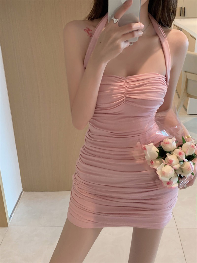 드레스 여름 2024 새로운 순수한 욕망 스타일 핫 소녀 허리 슬리밍 기질 섹시한 홀터넥 주름 엉덩이 커버 스커트스토어 가기
