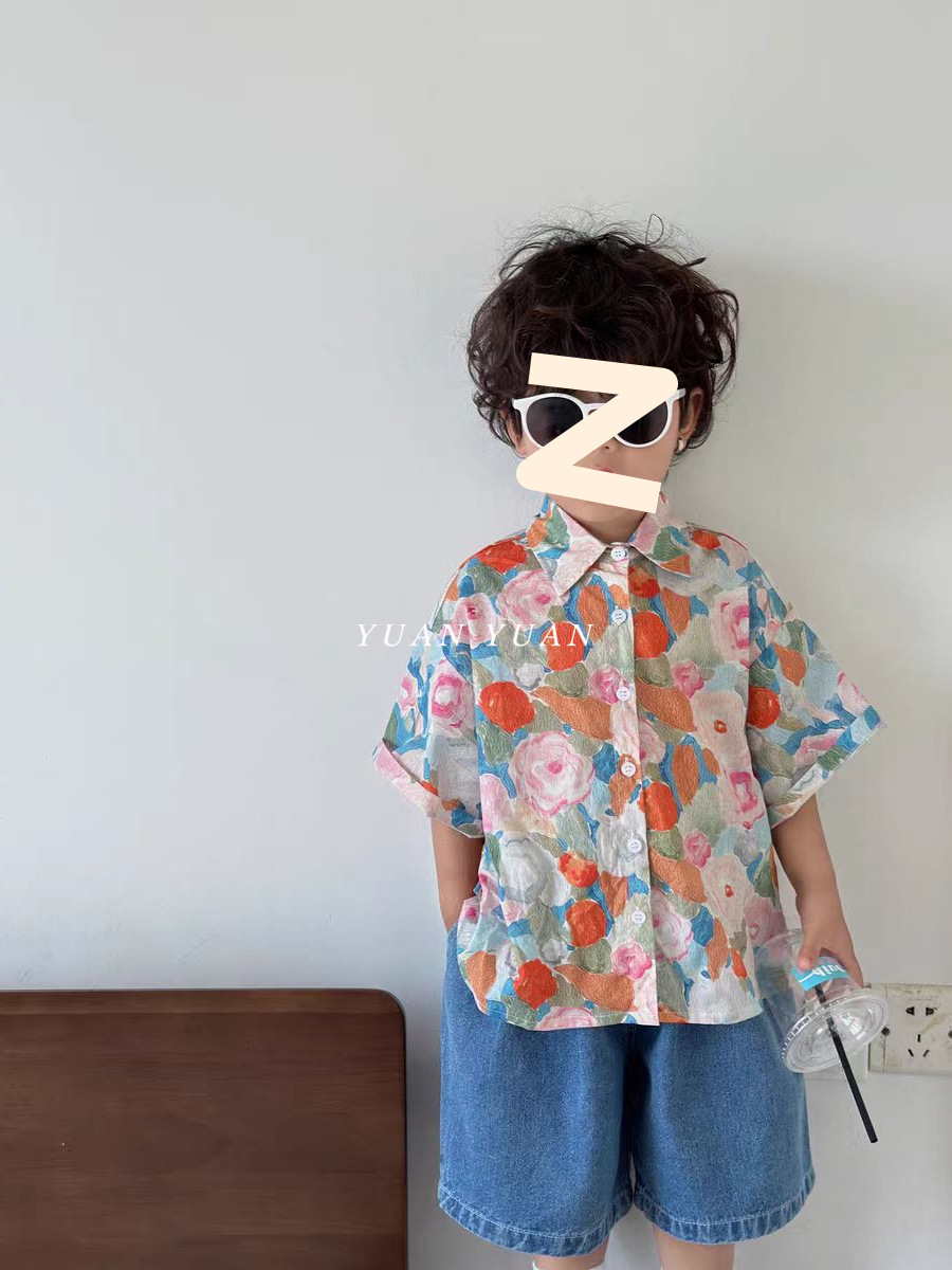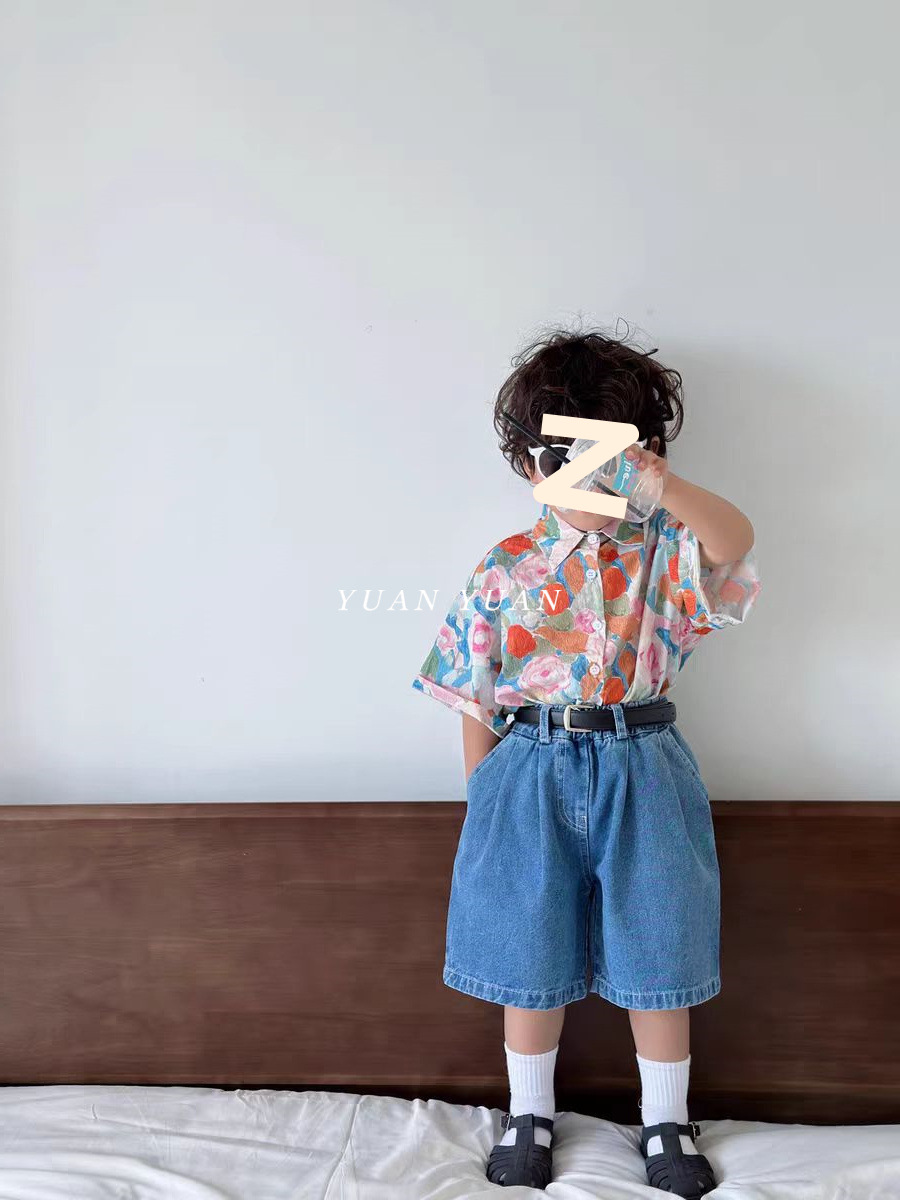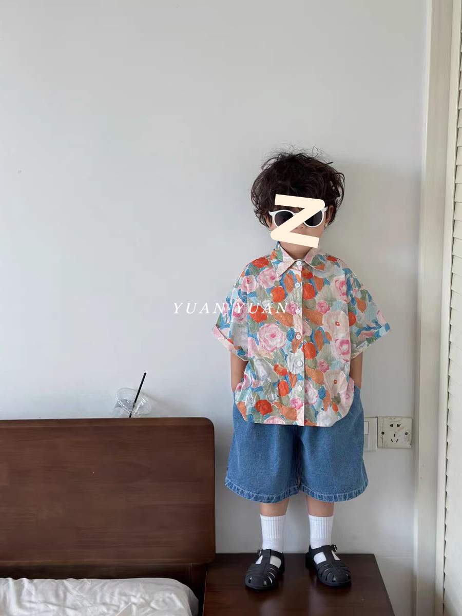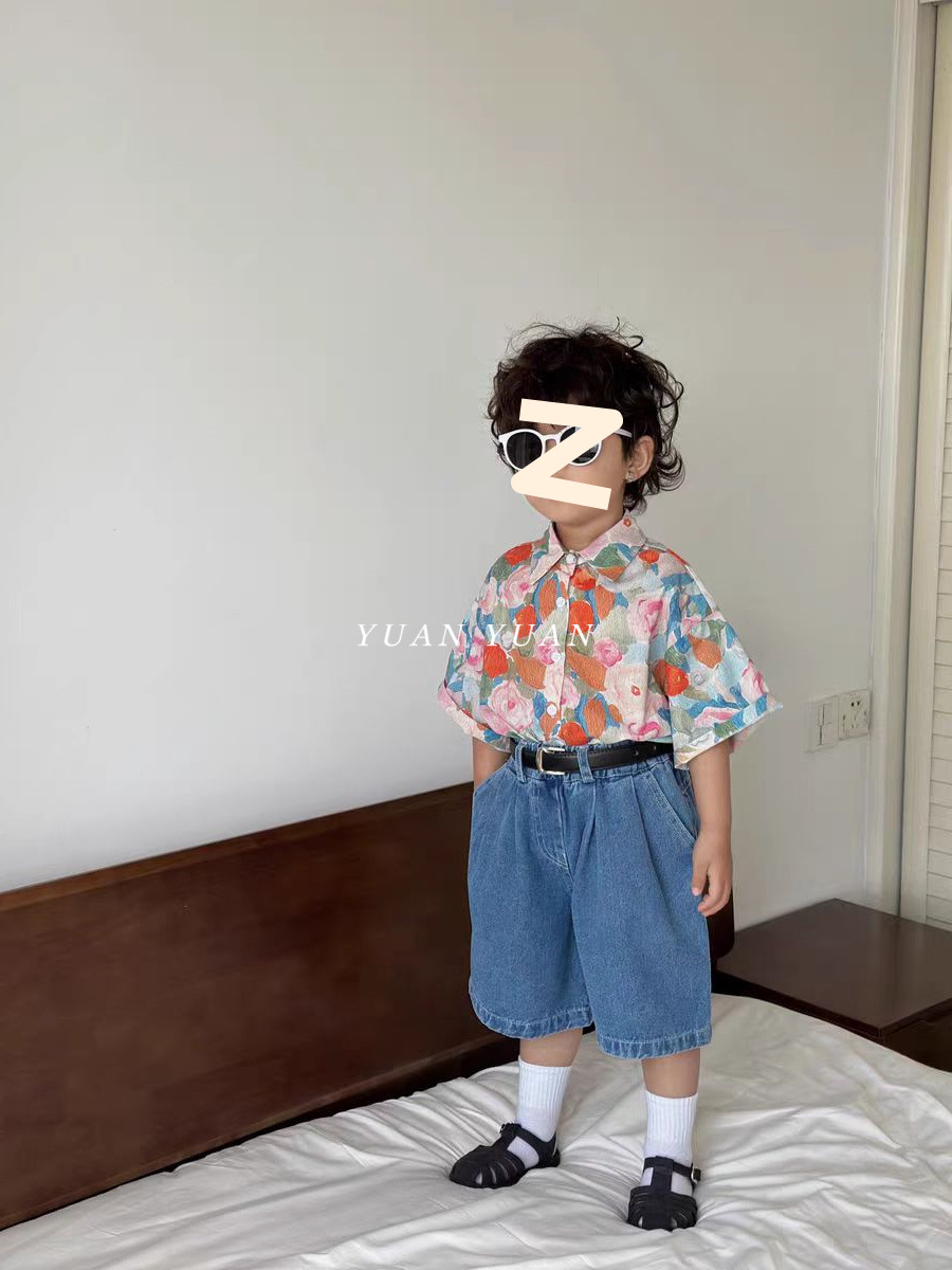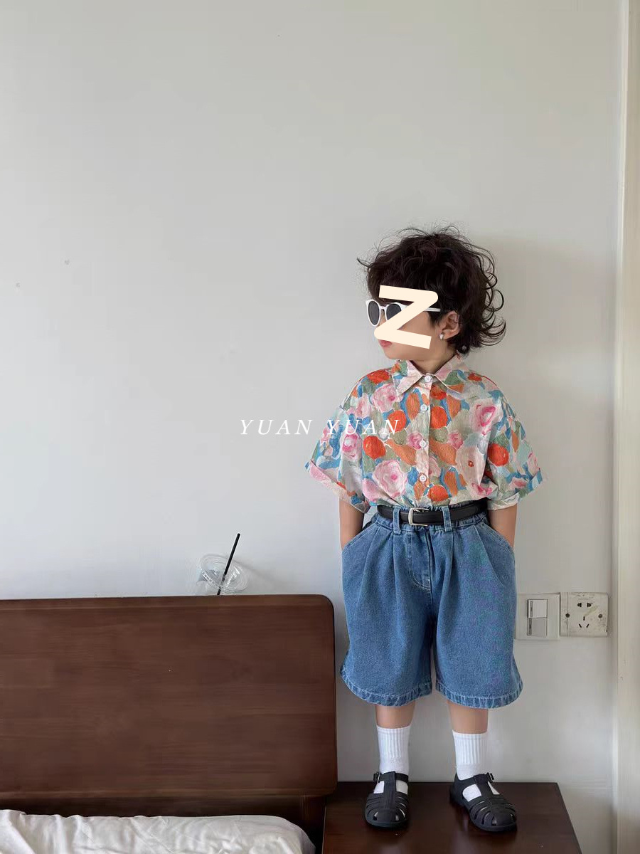 소년 꽃 셔츠 세트 2024 년 여름 새로운 어린이 반팔 셔츠 아기의 잘 생긴 청바지 투피스 세트 트렌디스토어 가기