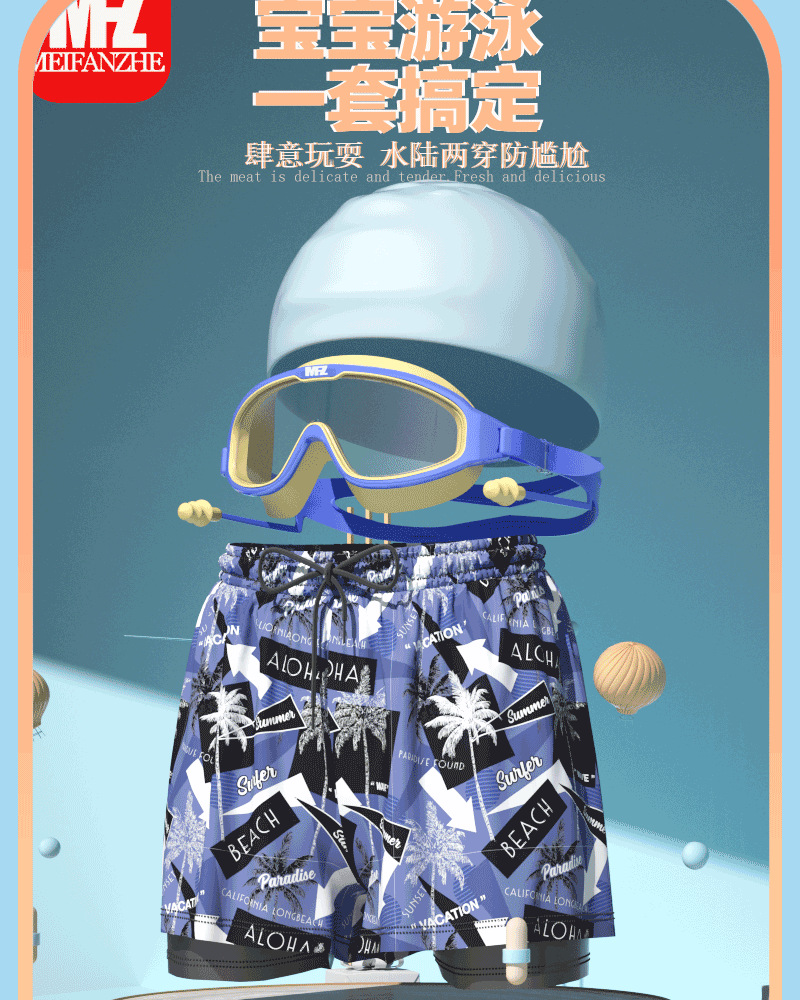 • 실버 그레이 아동용 수영 트렁크 + 수영 고글 + 수영 모자 (3 종 세트)