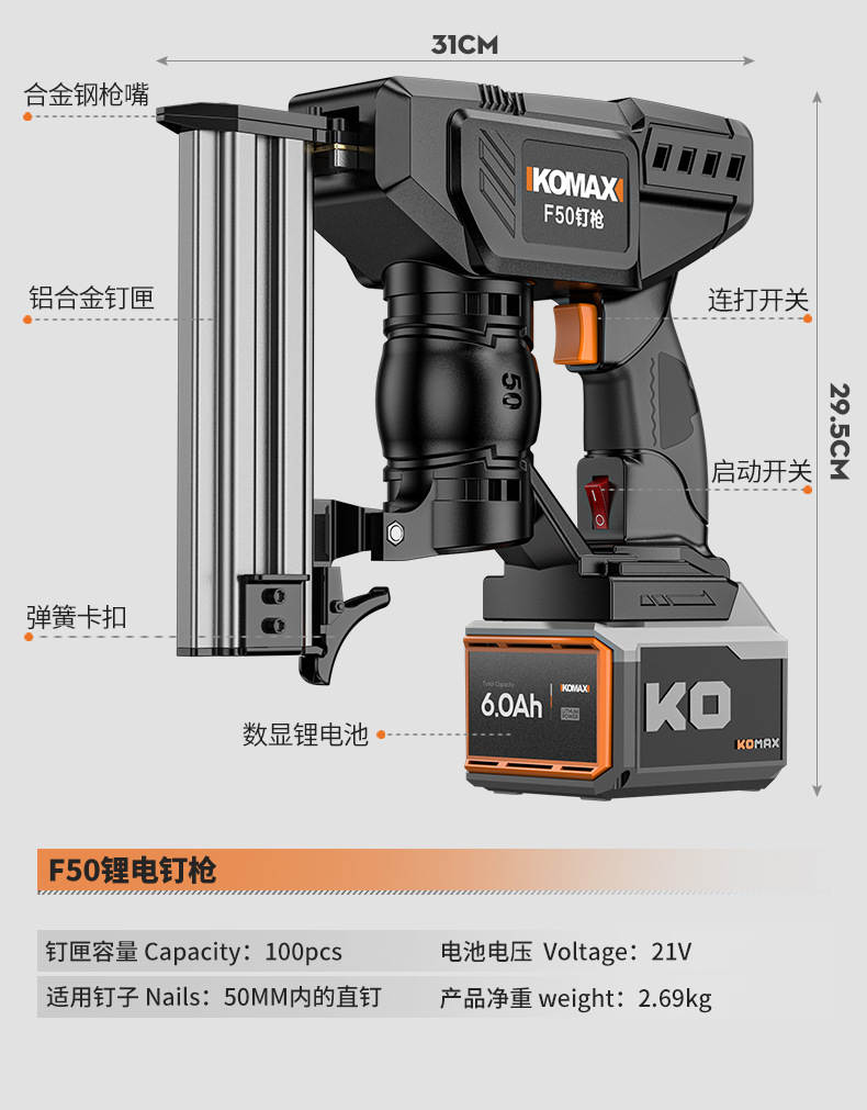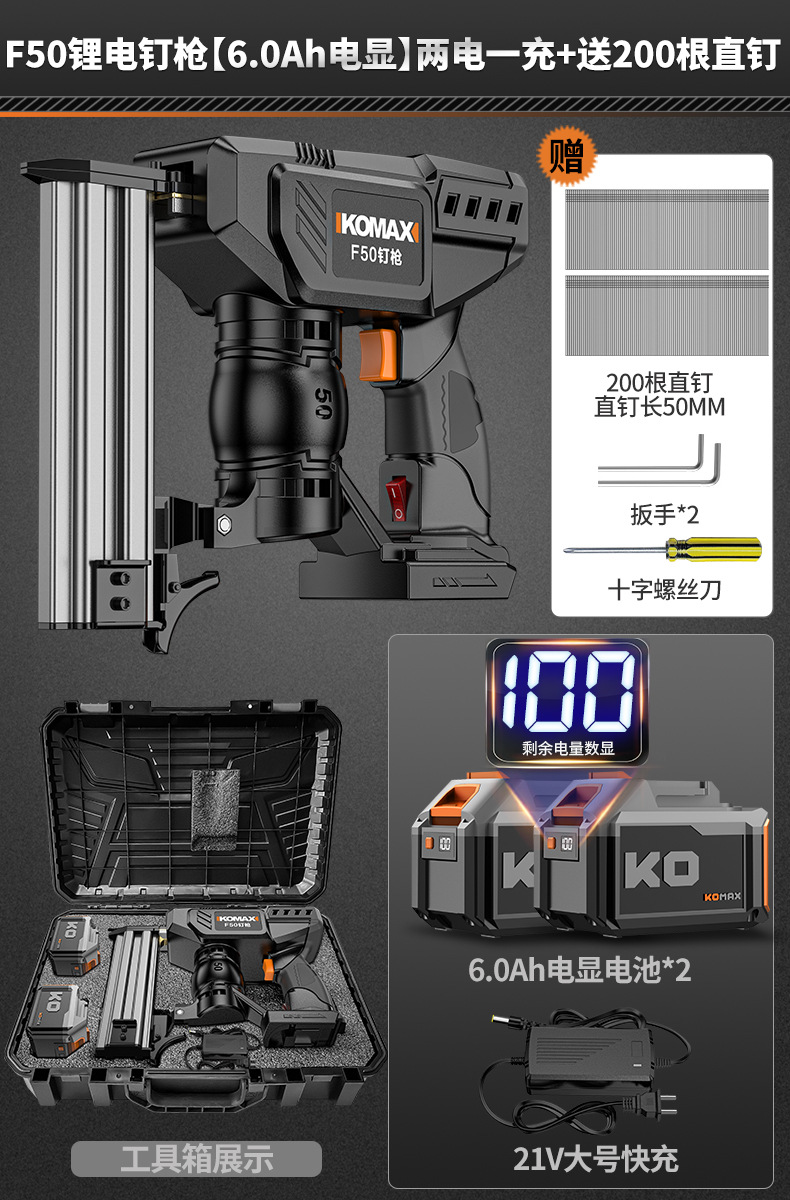 • F50 리튬 배터리 네일건 [6.0Ah 전자 디스플레이] 배터리 1개, 충전 1개 + 무료 직선 손톱 200개