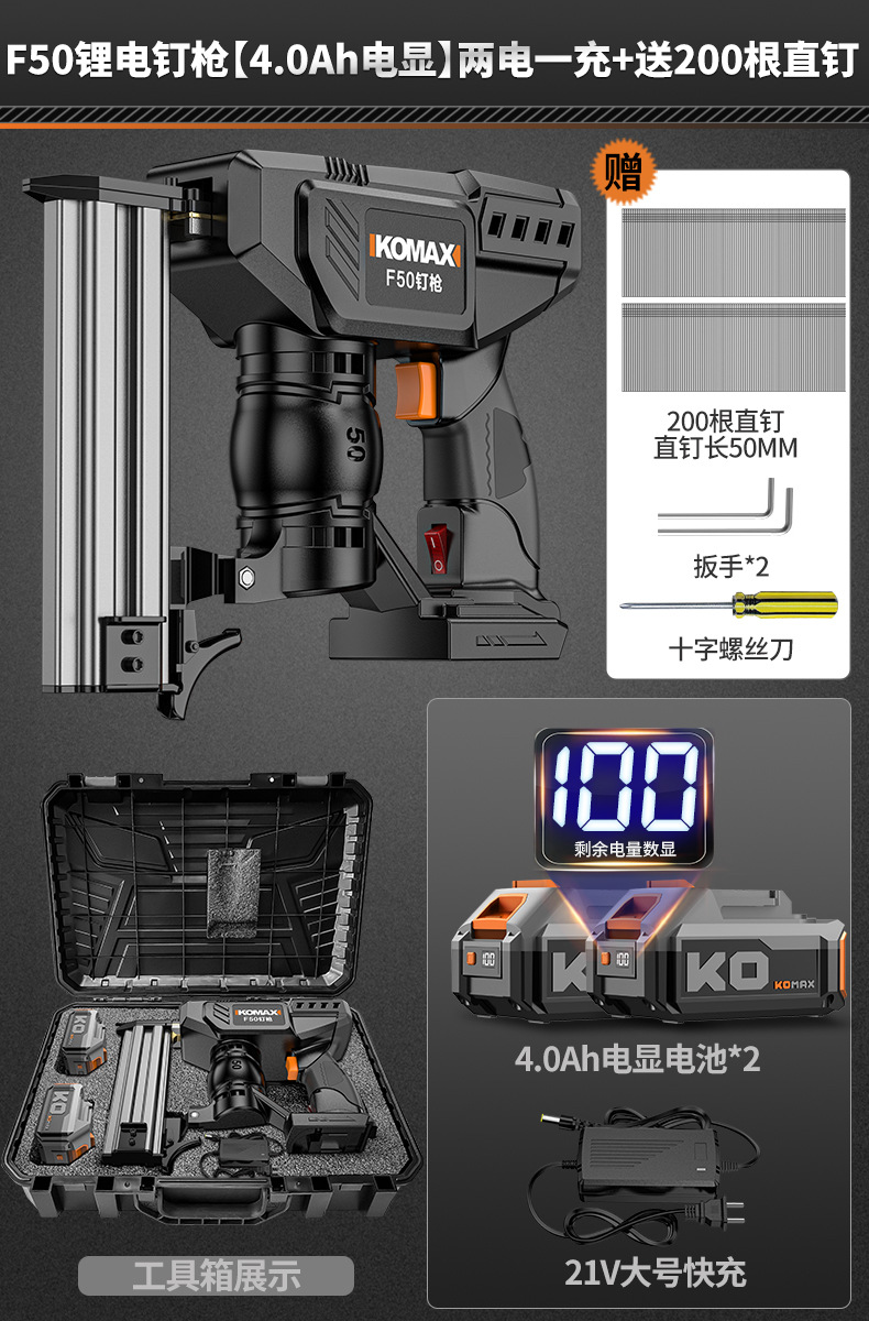 • F50 리튬 배터리 네일건 [4.0Ah 전자 디스플레이] 배터리 2개 및 충전기 1개 + 무료 직선 손톱 200개