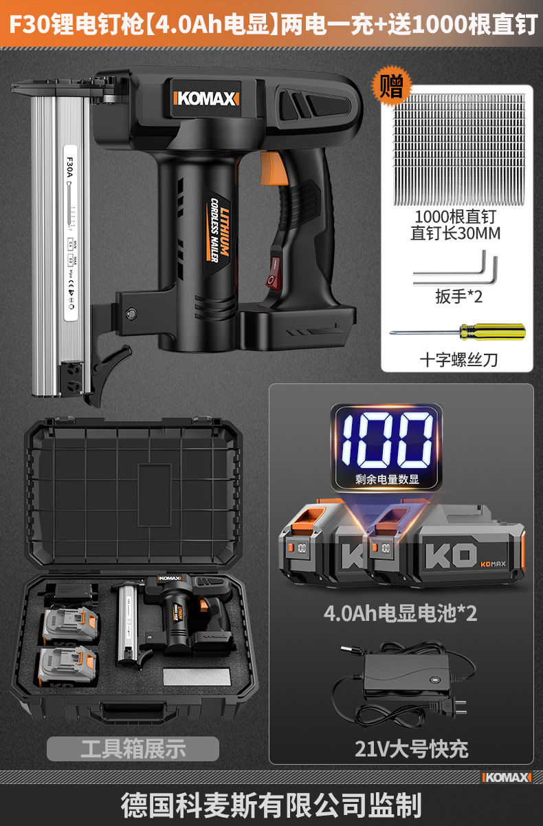 • F30 리튬 배터리 네일건 [4.0Ah 전자 디스플레이] 배터리 1개, 충전 1개 + 무료 직선 못 1000개