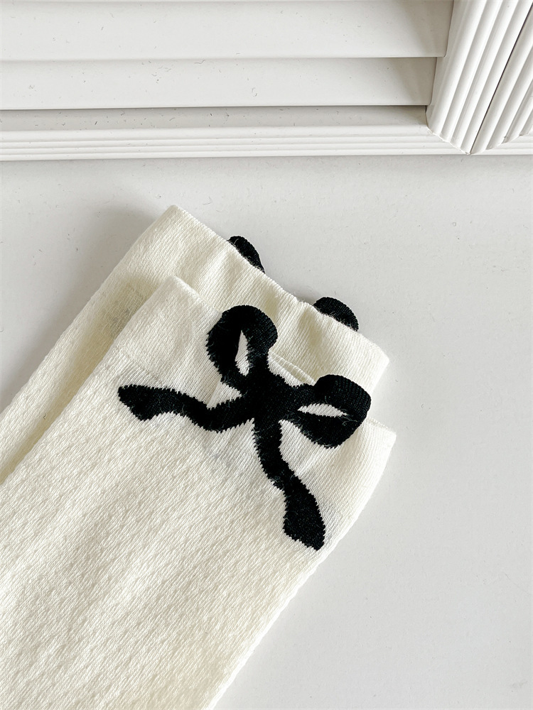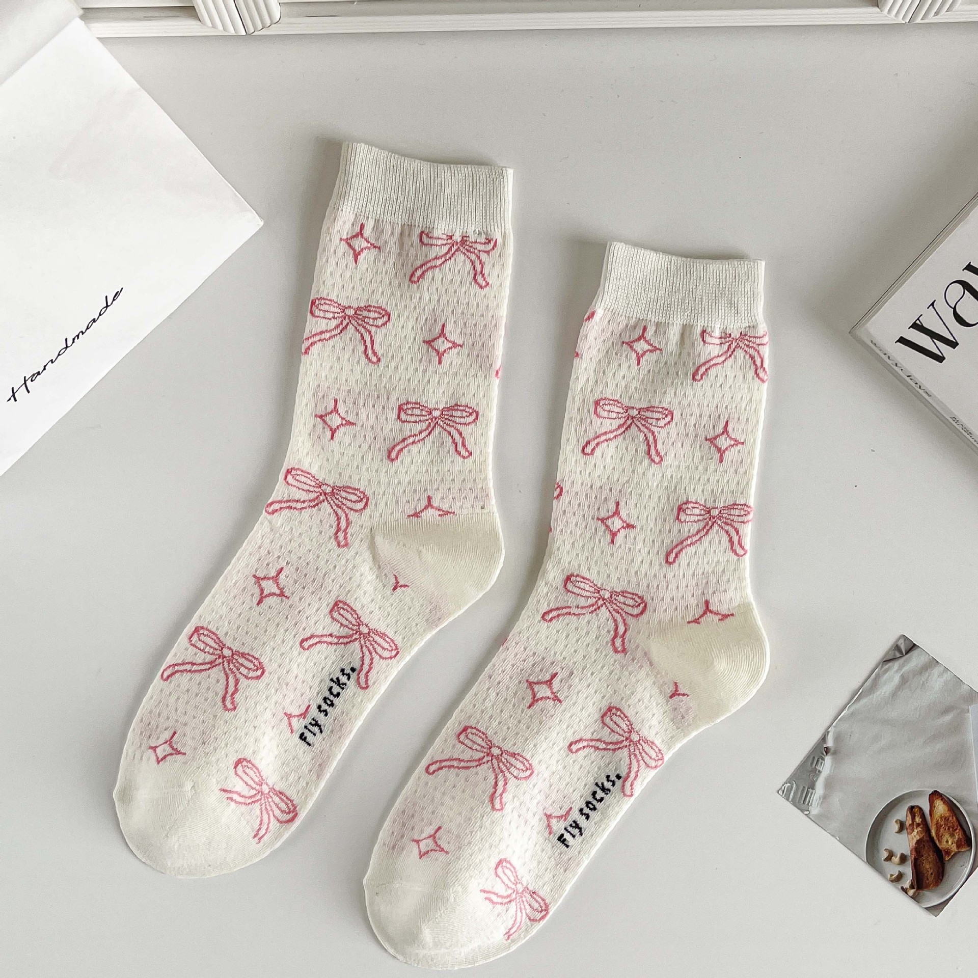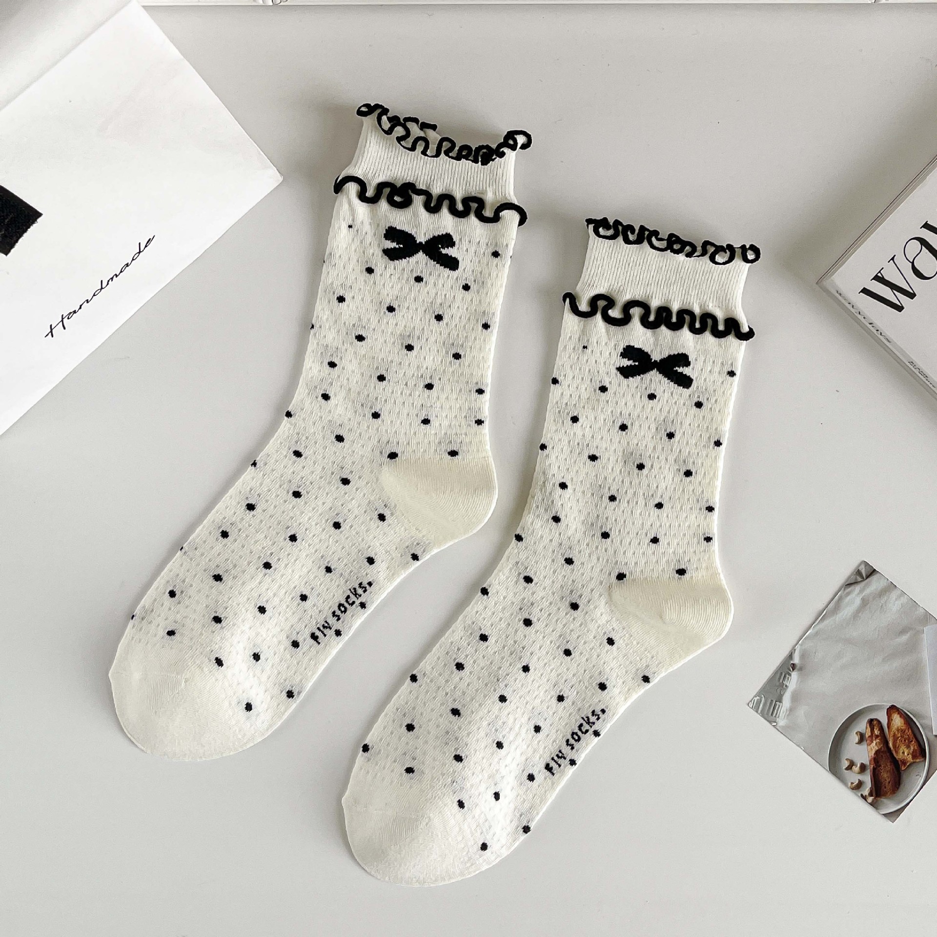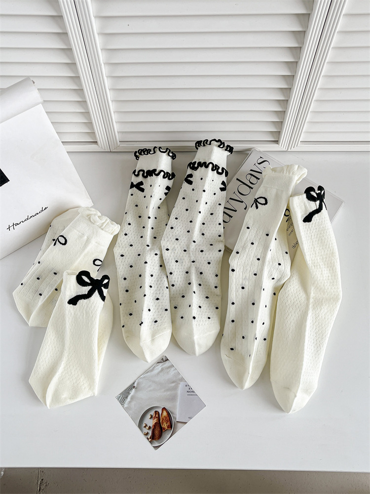 발레 스타일 활 양말 여름 메쉬 할로우 통기성 여성 양말 일본식 화이트 도트 중간 길이 양말 주지 양말스토어 가기