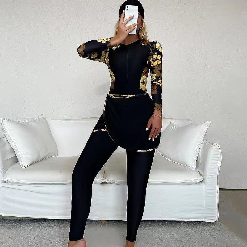 새로운 대외 무역 무슬림 수영복 긴 소매 바지 3 개 세트 보수적 인 부르 키니 가슴 패드