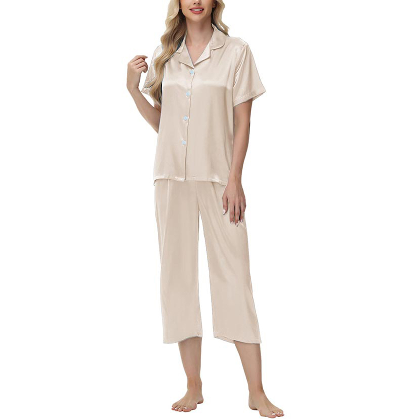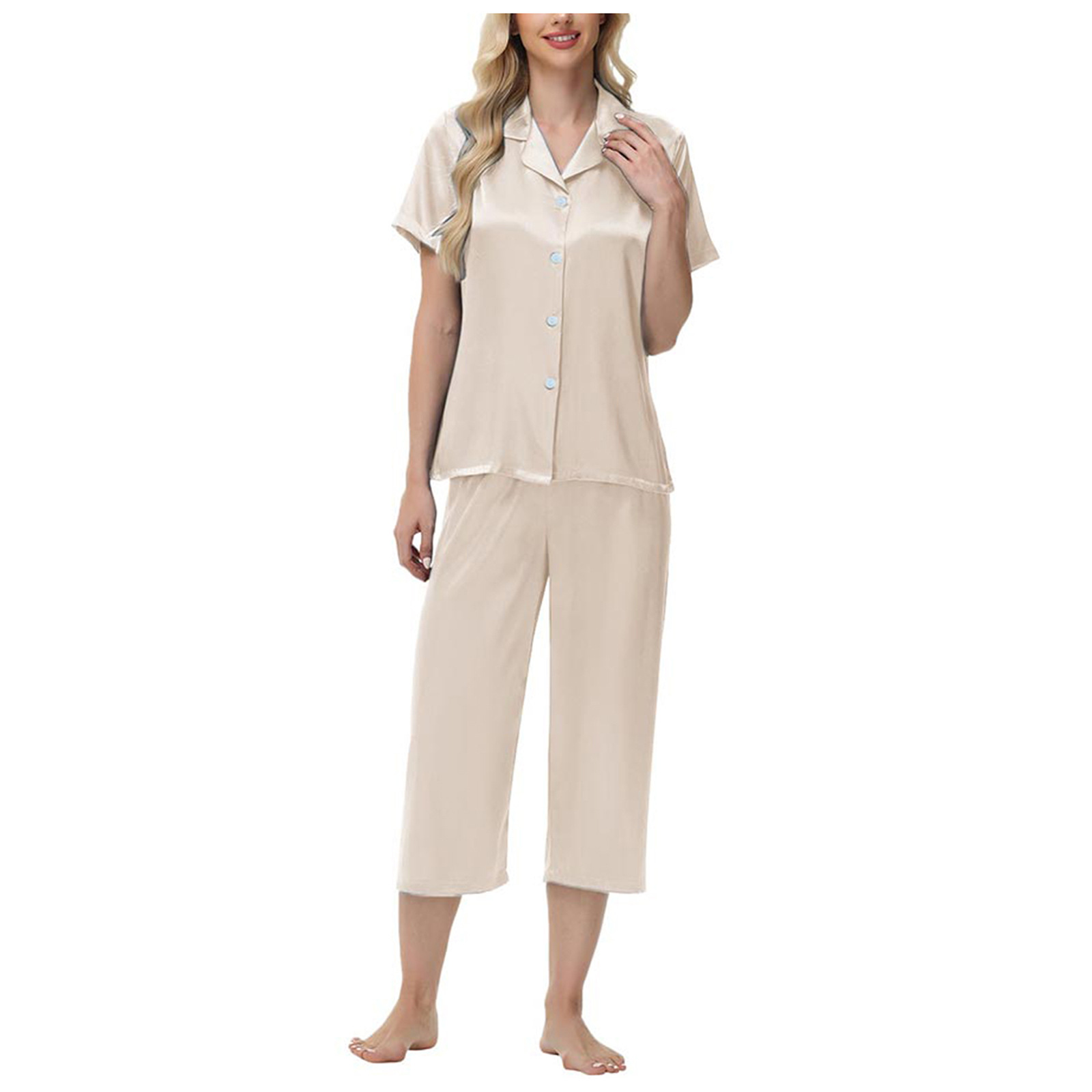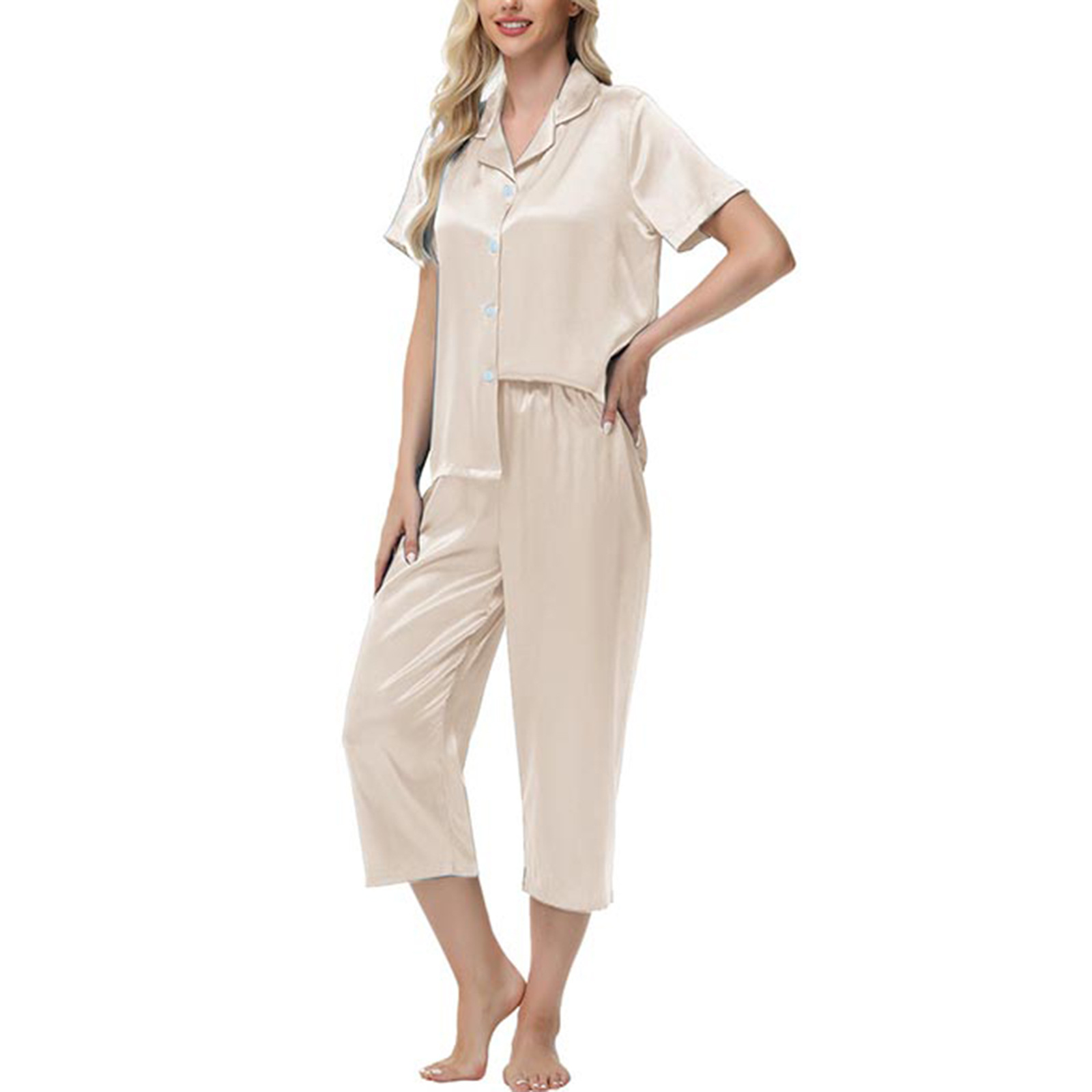 대외 무역 국경 아마존 유럽과 미국의 아이스 실크 파자마 새틴 세트 반팔 자른 바지 여성용 홈 옷스토어 가기