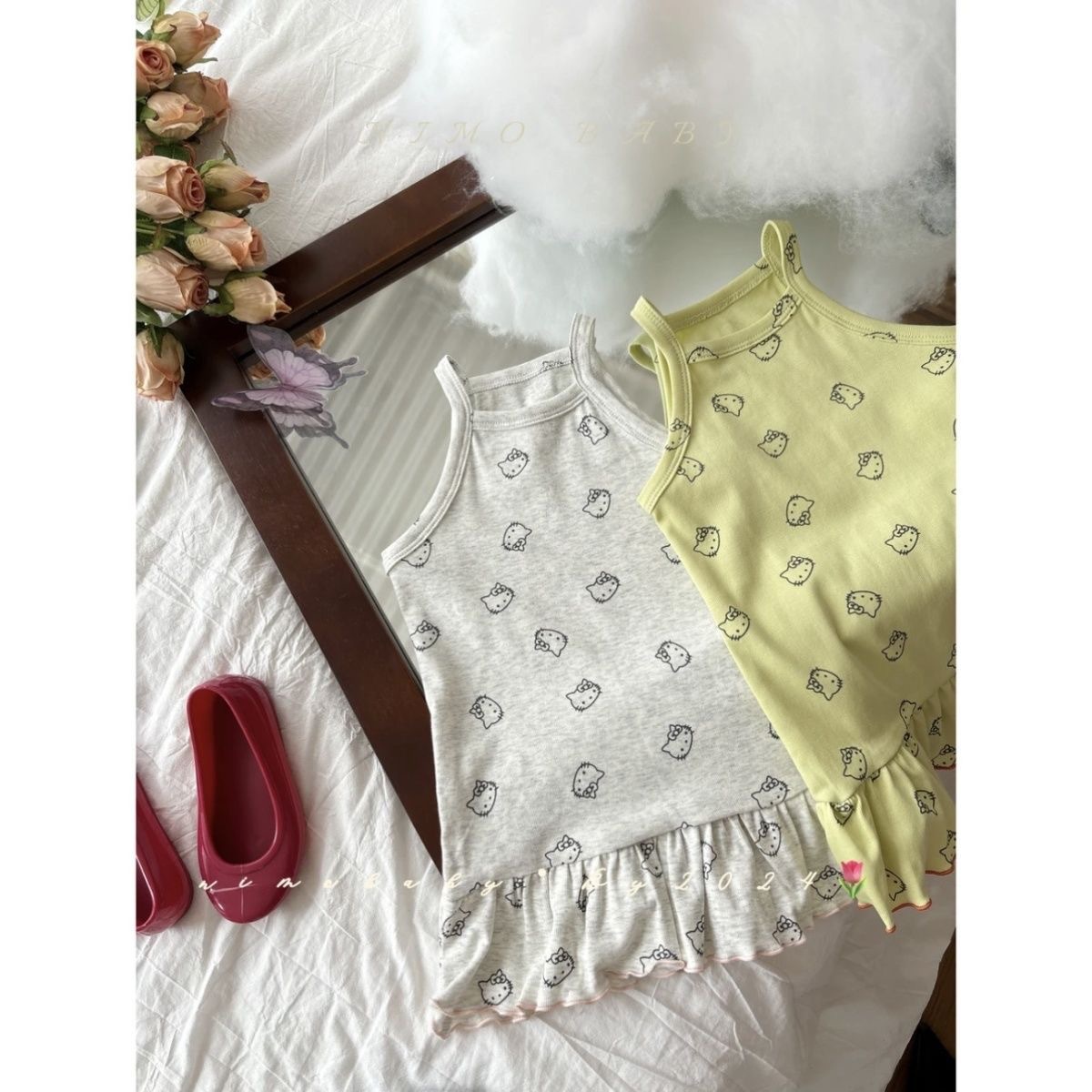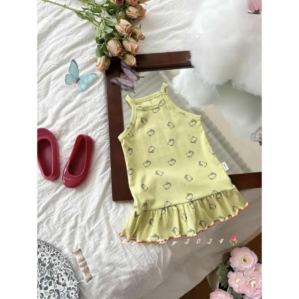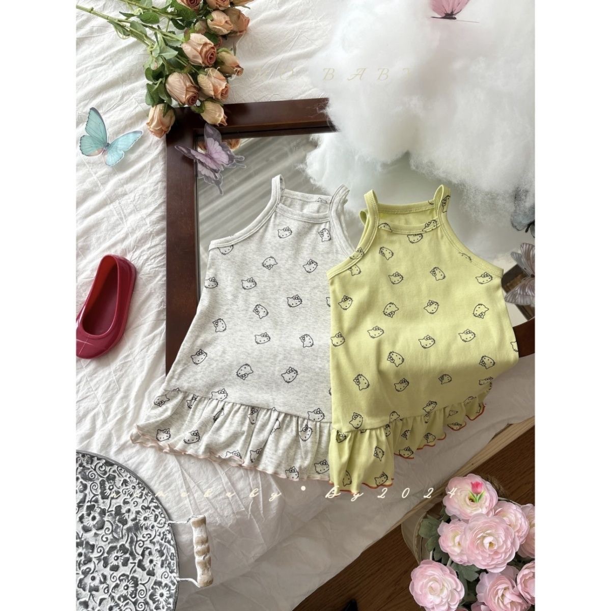 한국 아동복 소녀 원피스 24 여름 새 아기 귀여운 kt 고양이 프린트 조끼 치마 어린이 치마 조수