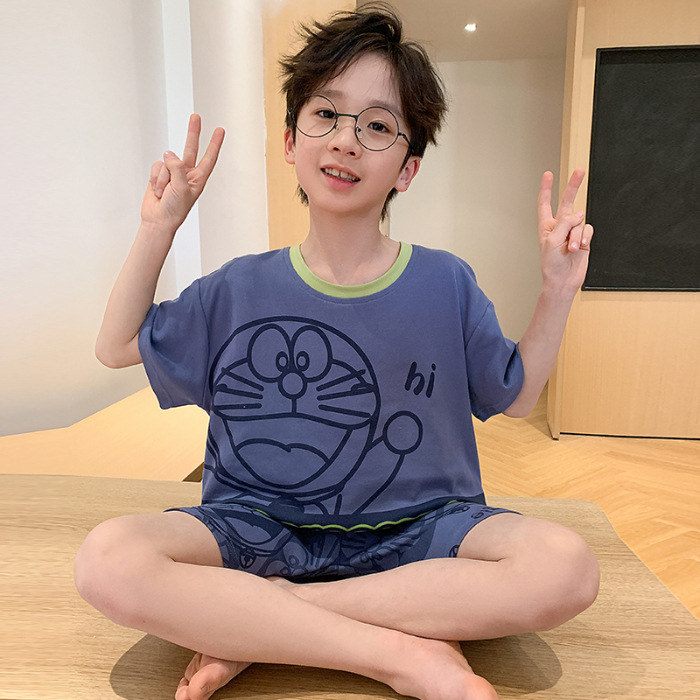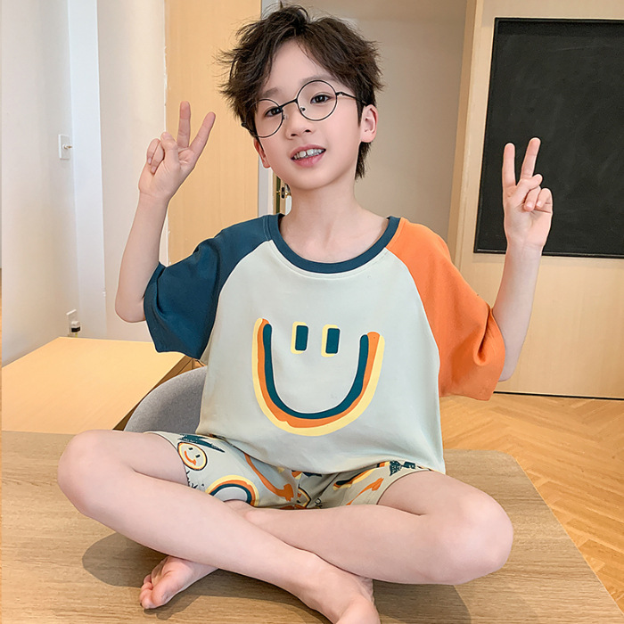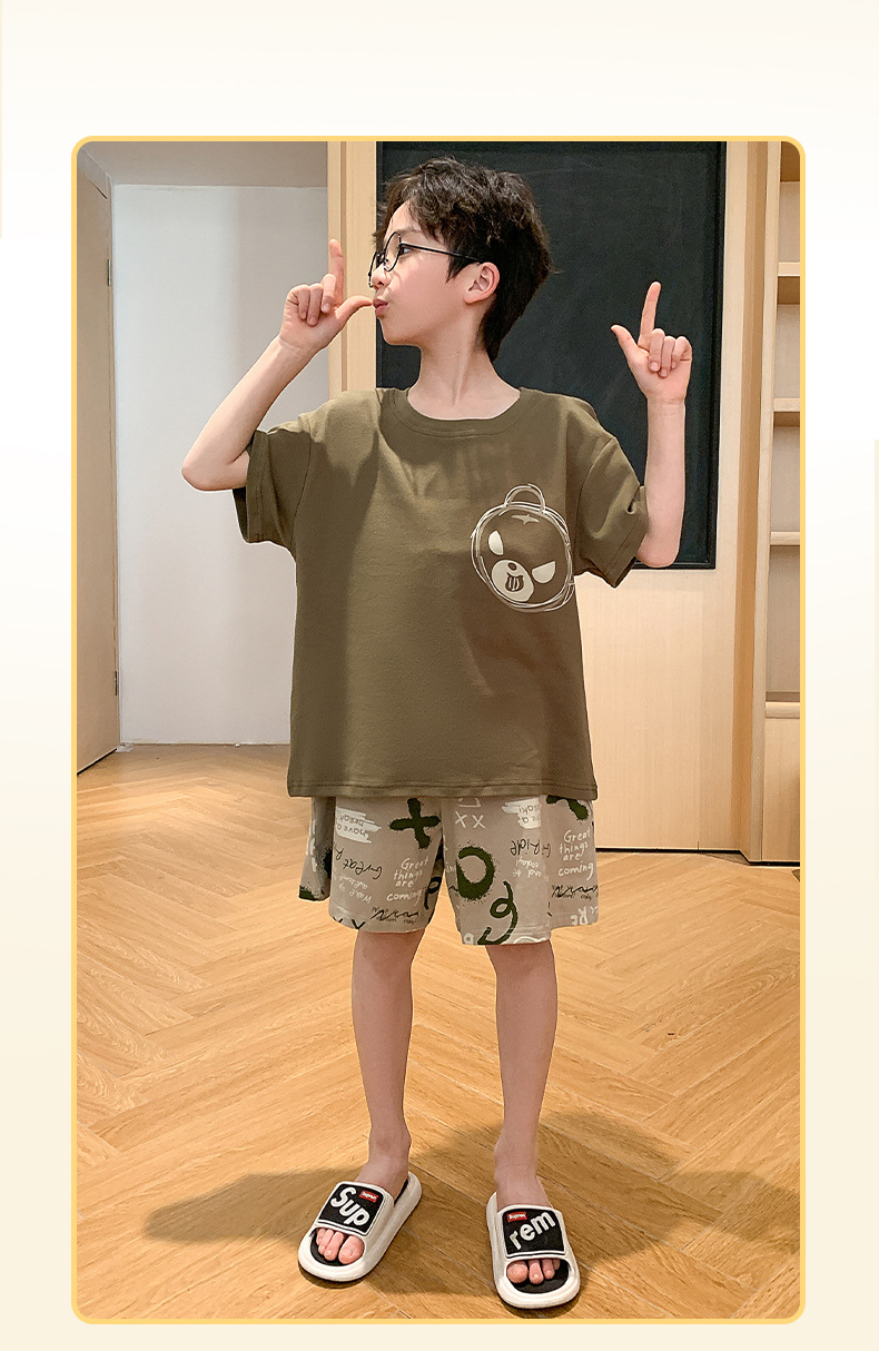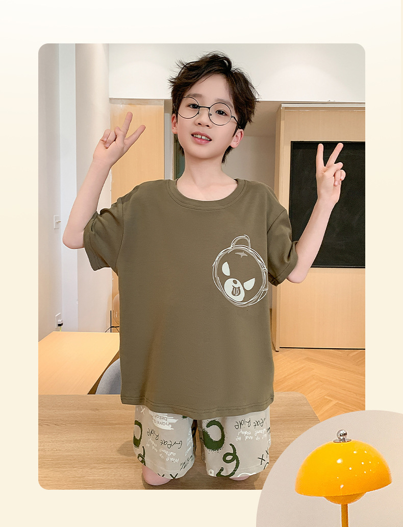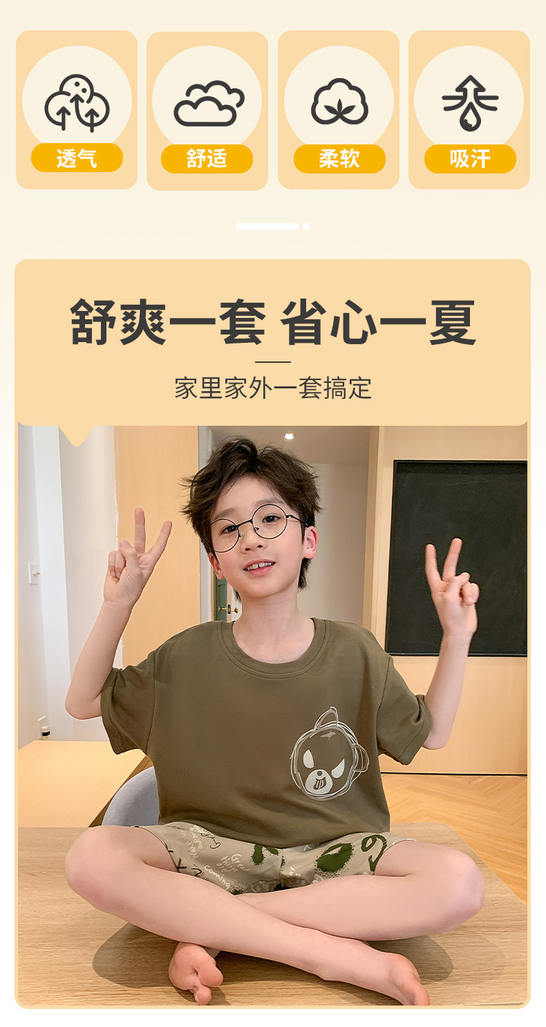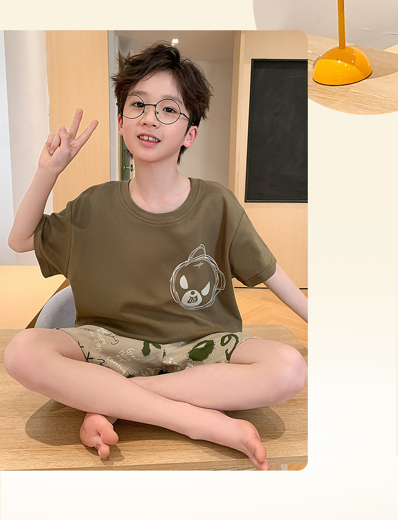 2025 라운드 넥 소년 잠옷 여름 순수 코튼 반팔 어린이 소년 봄, 가을 풀오버 중대형 어린이 가정 의류스토어 가기