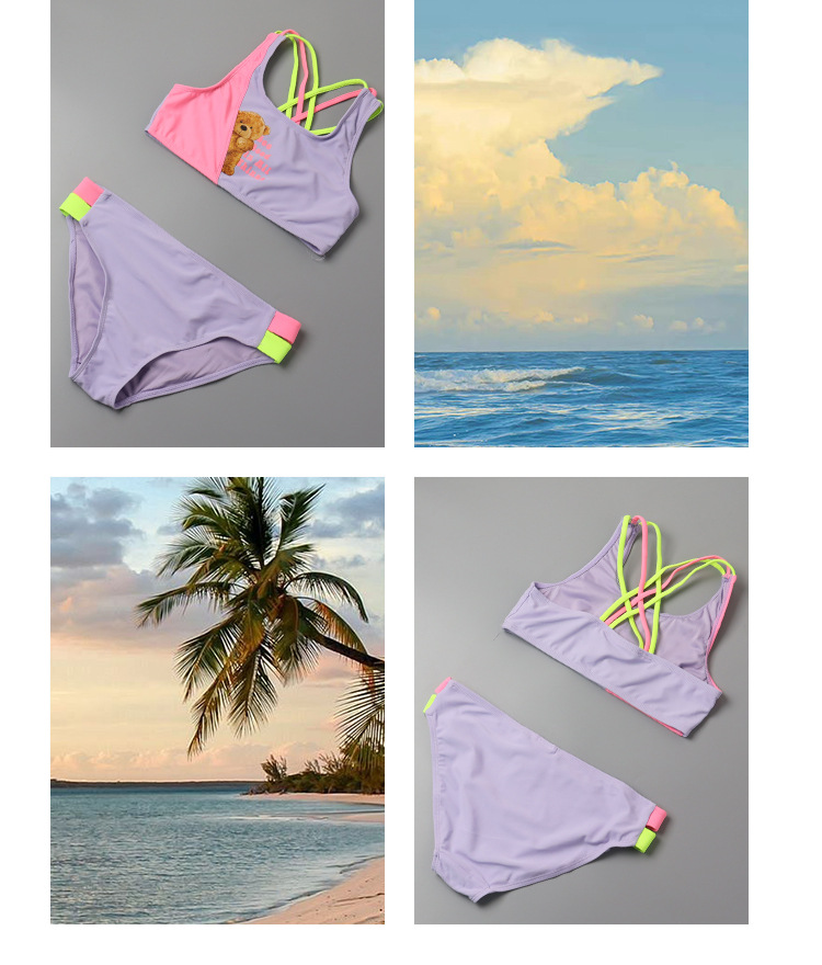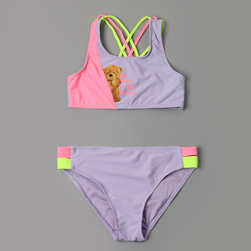 한국 스타일 어린이 분할 수영복 보라색 만화 곰 달콤한 귀여운 아기 소녀 수영복 세트 서양식 수영복