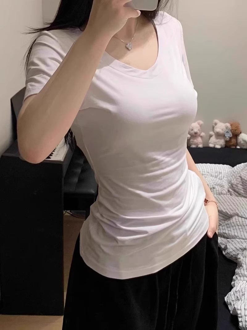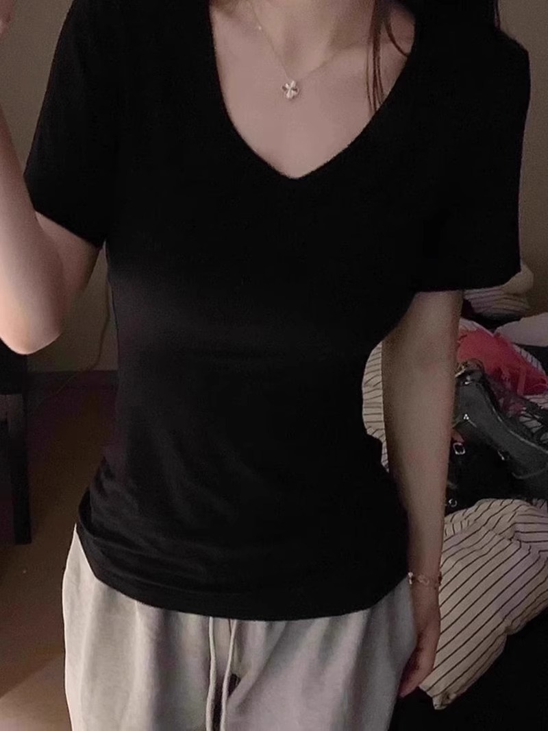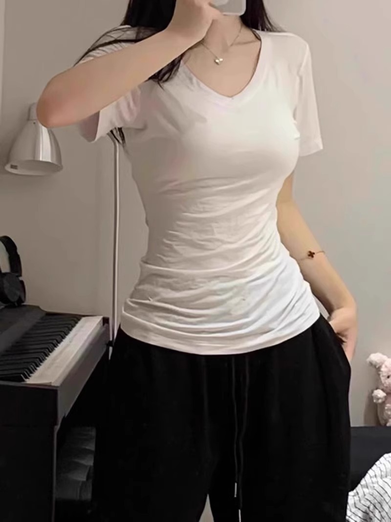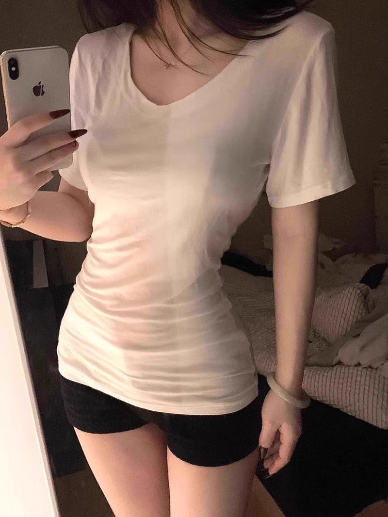슈퍼 슬림 여름 밀착 된 감각 어깨 타이트 허리 V-Neck 짧은 소매 탑베이스 좋은 착용 향신료 소녀 티셔츠 여성스토어 가기