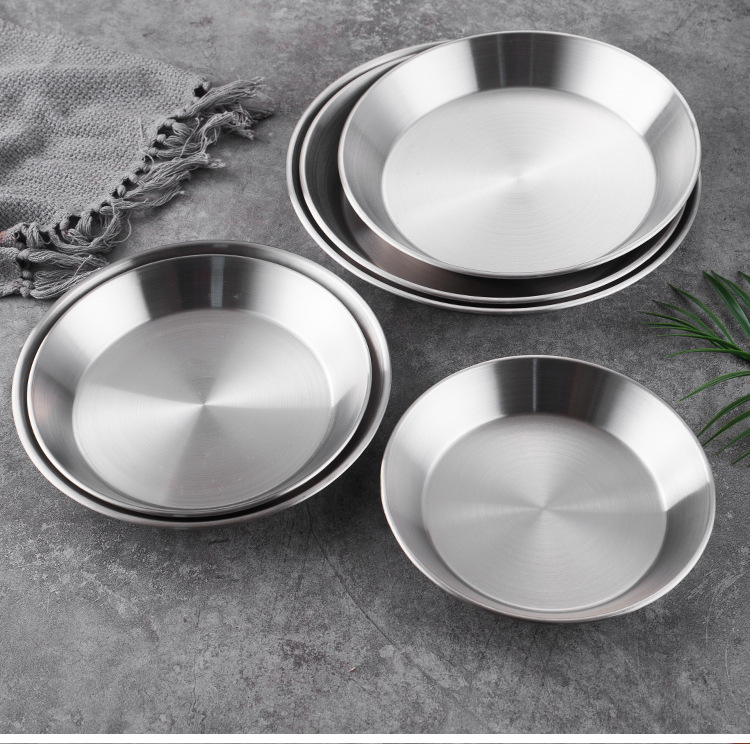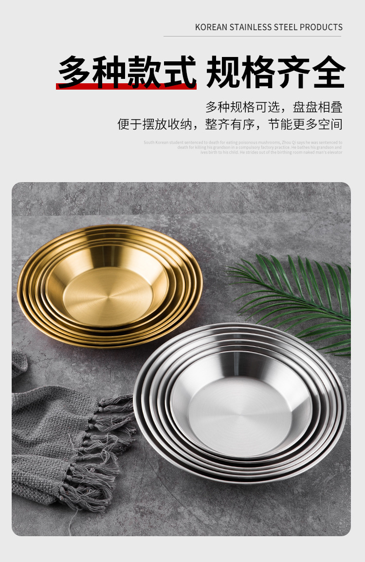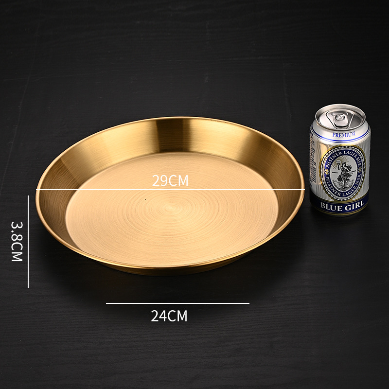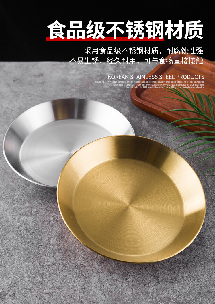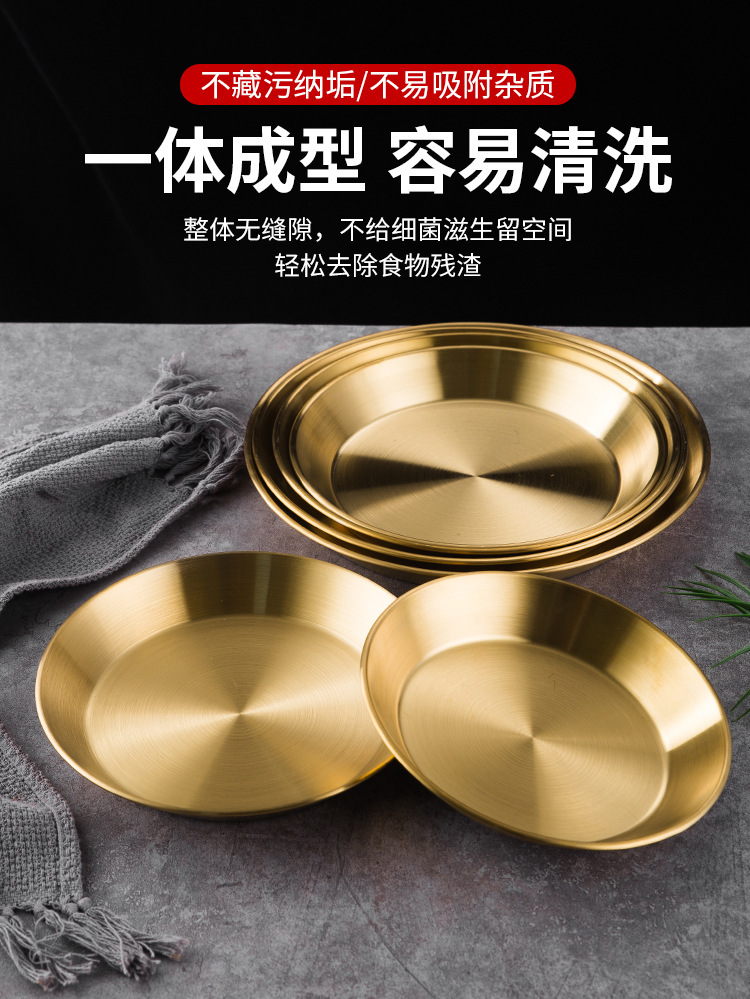 304 한국식 스테인레스 스틸 해산물 플레이트 베이킹 팬 골든 플랫 하단 트레이 피자 플레이트 디스크 딥 접시 케이크 플레이트스토어 가기