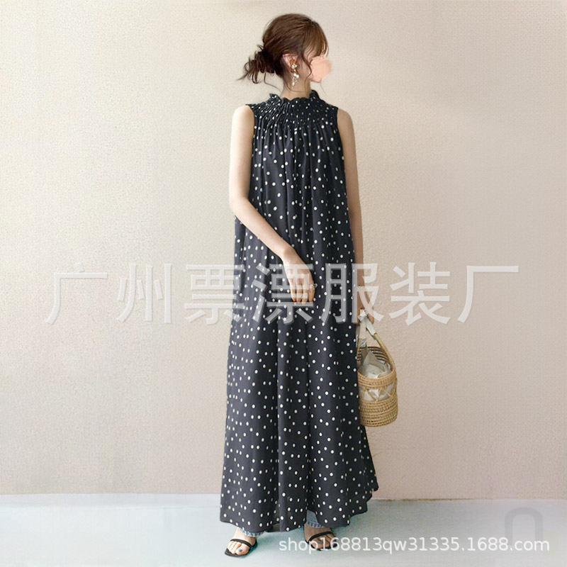 2024 년 여름 뉴 원피스 일본 스타일 반높이 칼라 민소매 느슨한 폴라 도트 A-라인 원피스스토어 가기