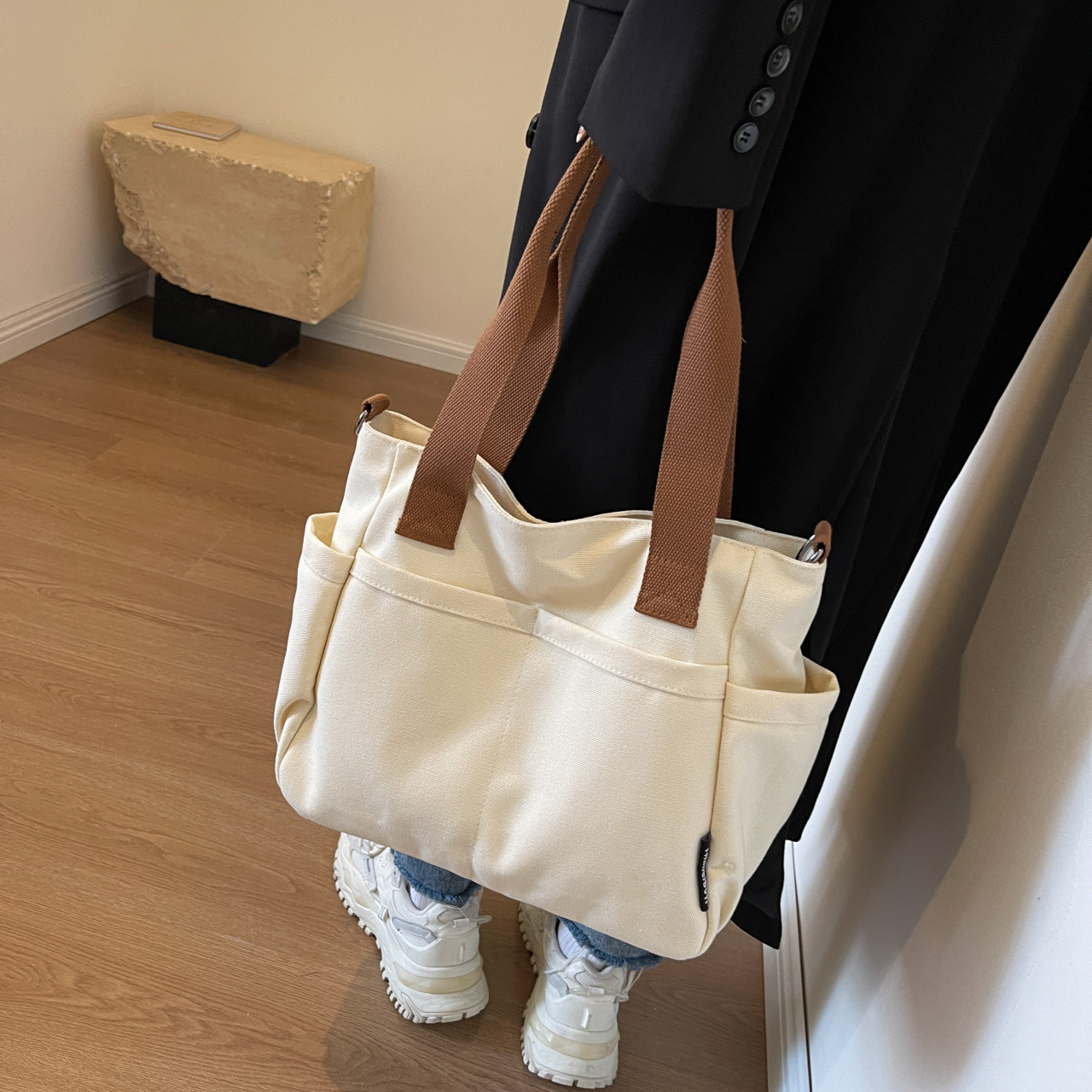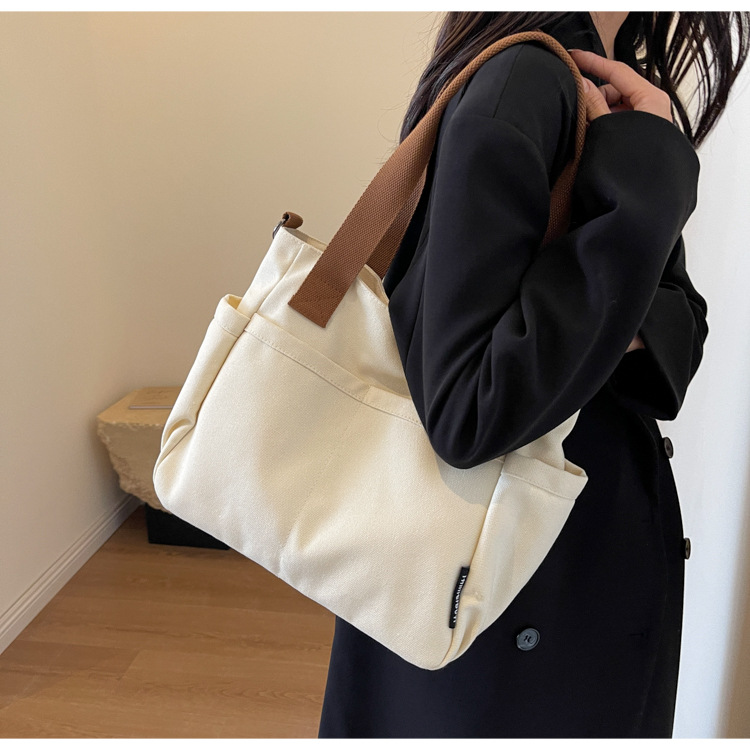 일본식 두꺼운 멀티 포켓 통근 토트 캔버스 가방 캐주얼 학생 컴퓨터 간단한 휴대용 어깨 크로스 바디 스쿨백스토어 가기