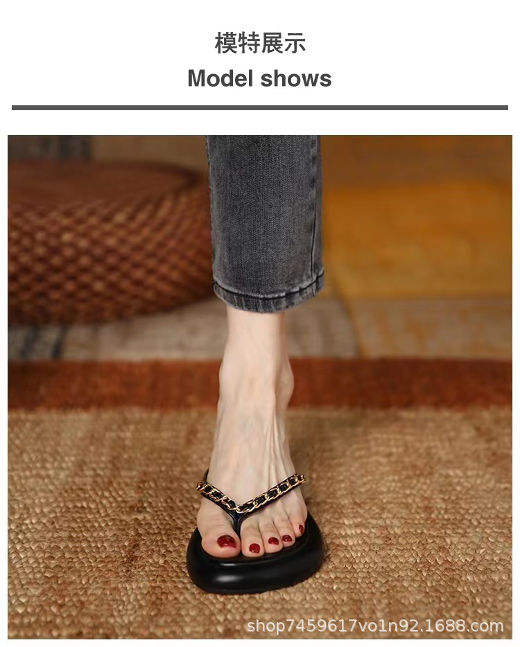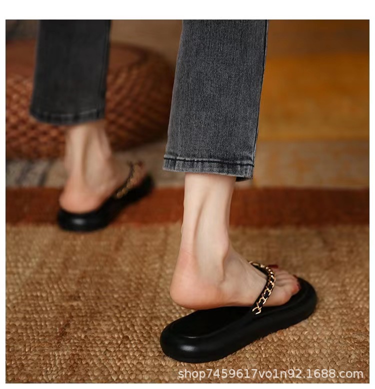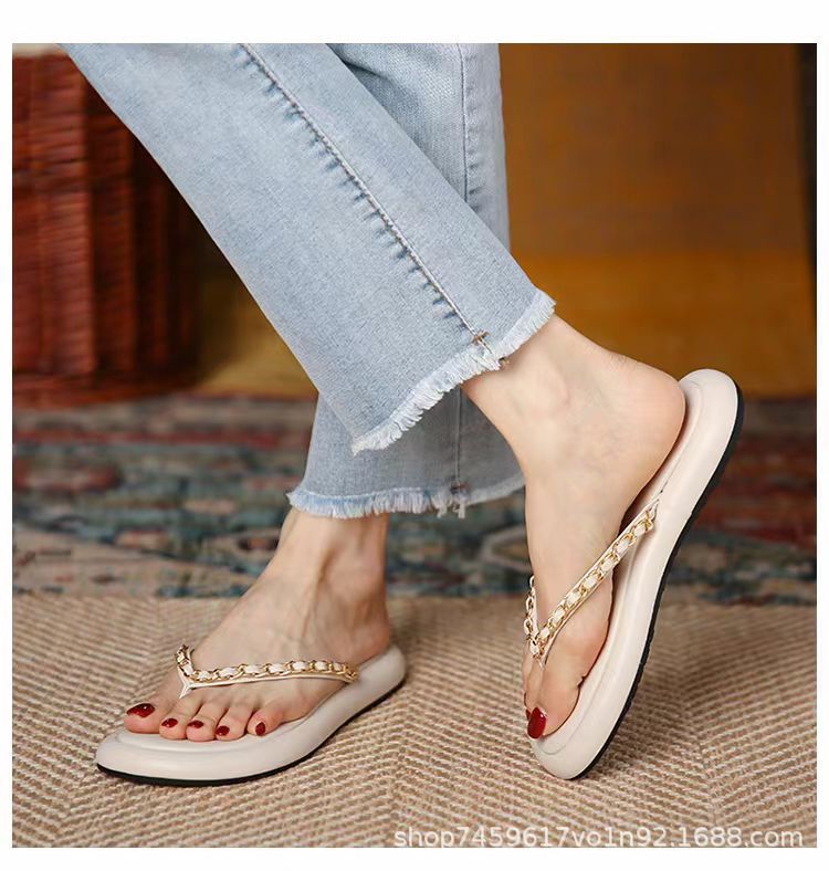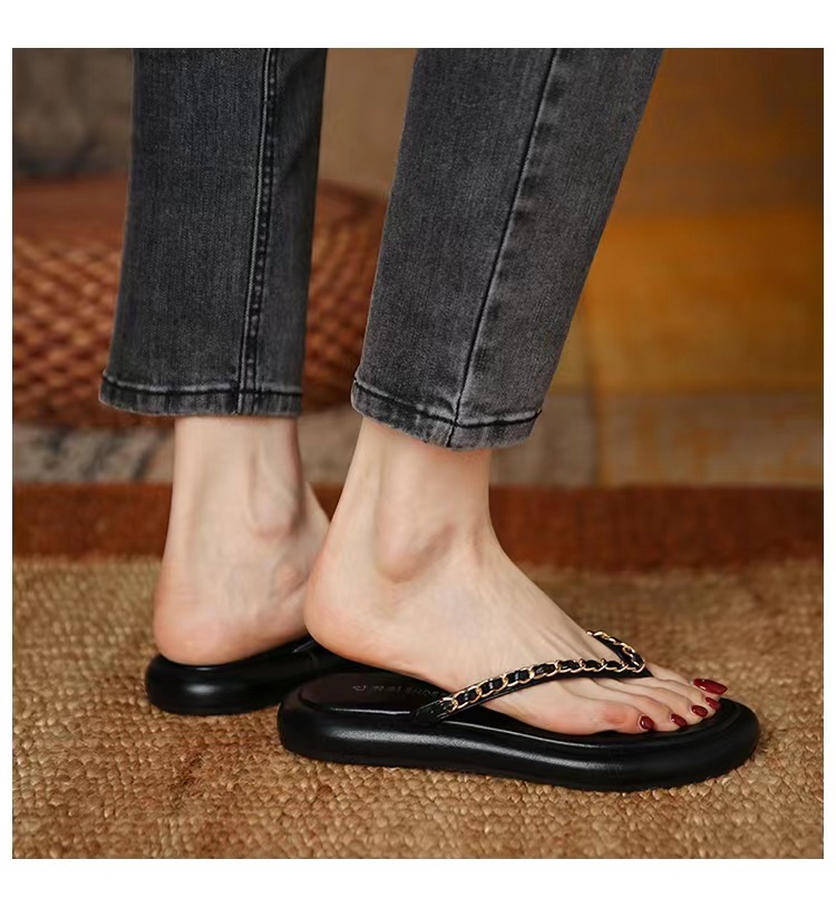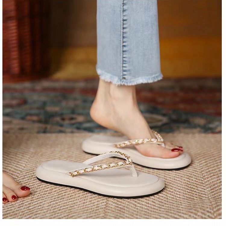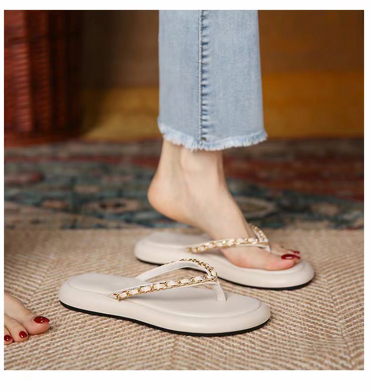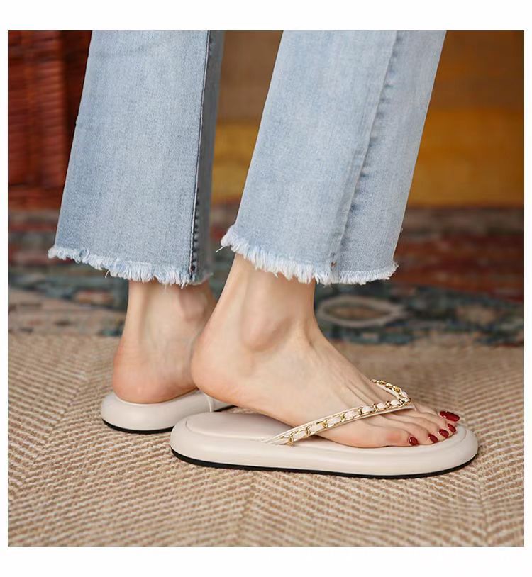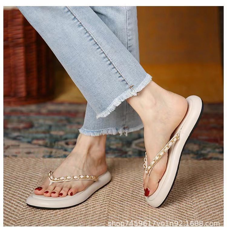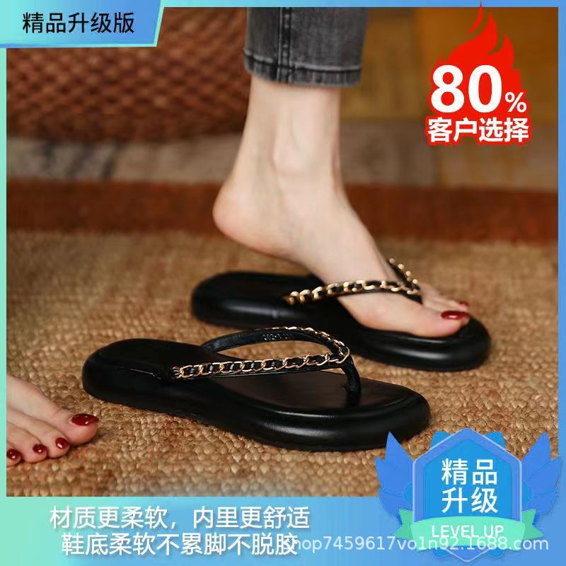 2024 인터넷 유명 소프트 가죽 통 샌들 및 슬리퍼 여성 외부 착용 해변 미끄럼 방지 비치 신발 플랫 체인 플립 플립 플롭스토어 가기