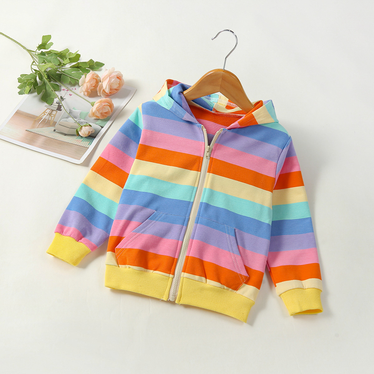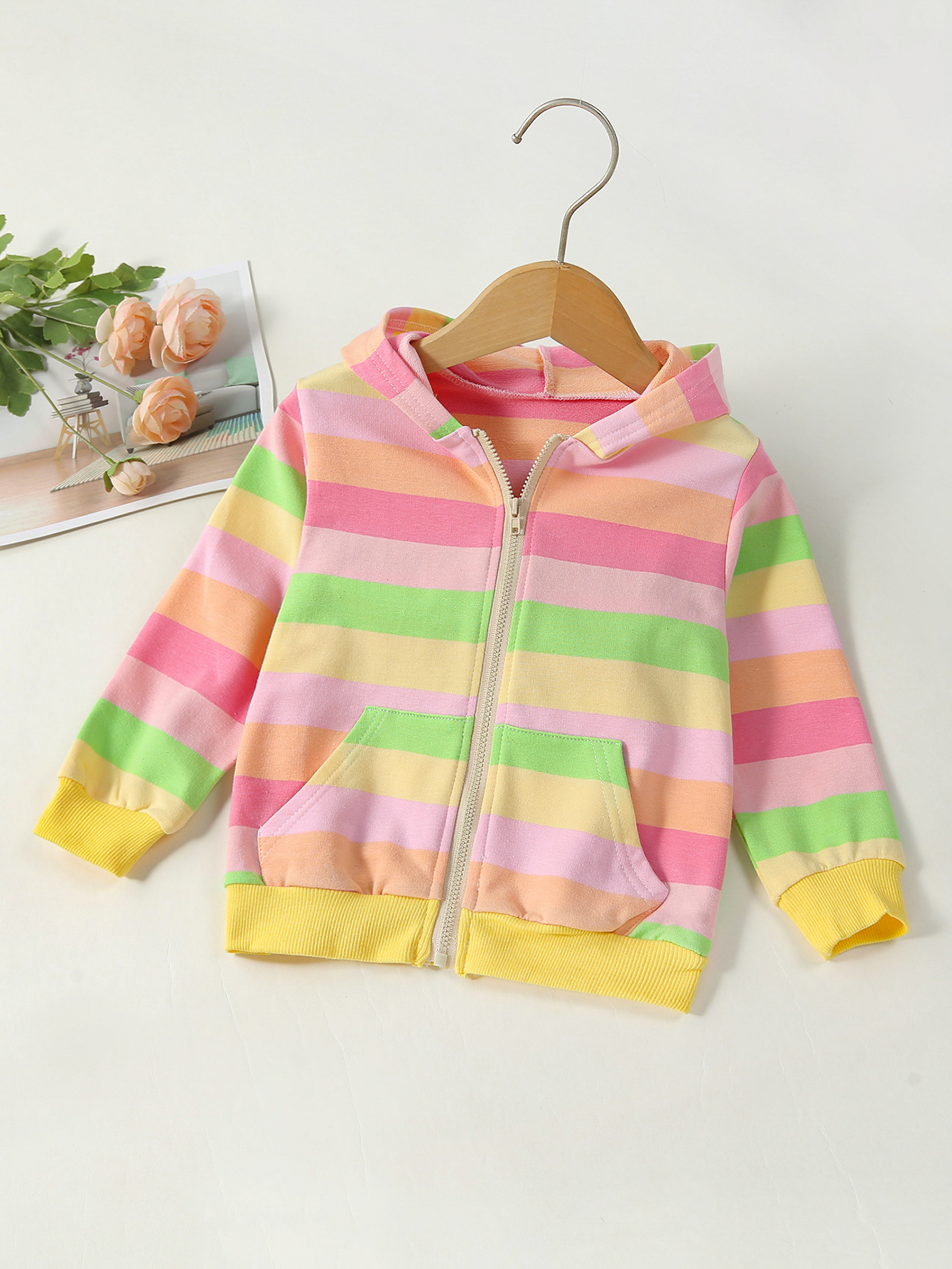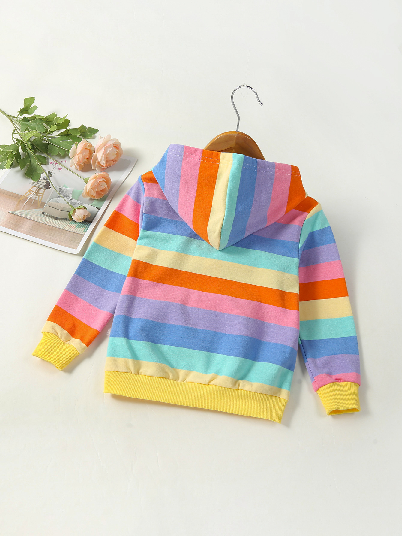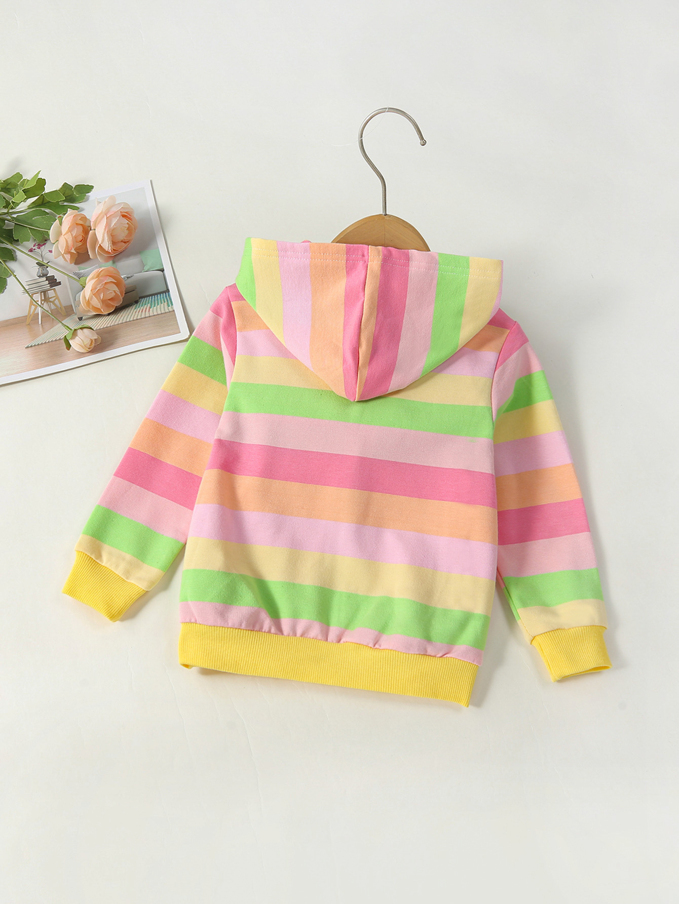 가을과 겨울 새로운 소녀 귀여운 지퍼 포켓 레인보우 스트립 후드 자켓 (스트라이프 패턴 랜덤, 아니