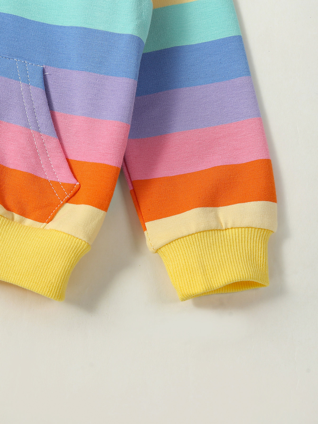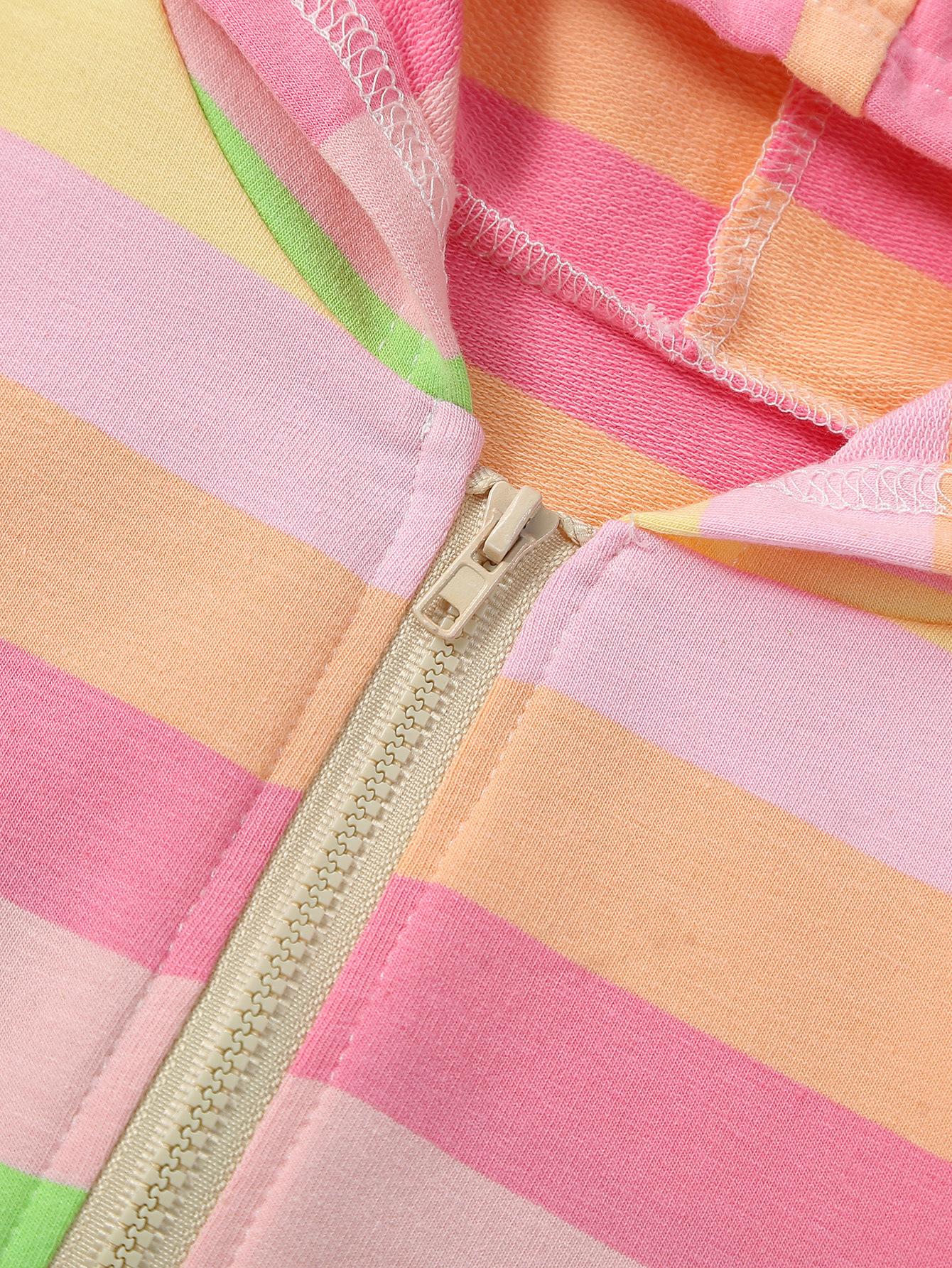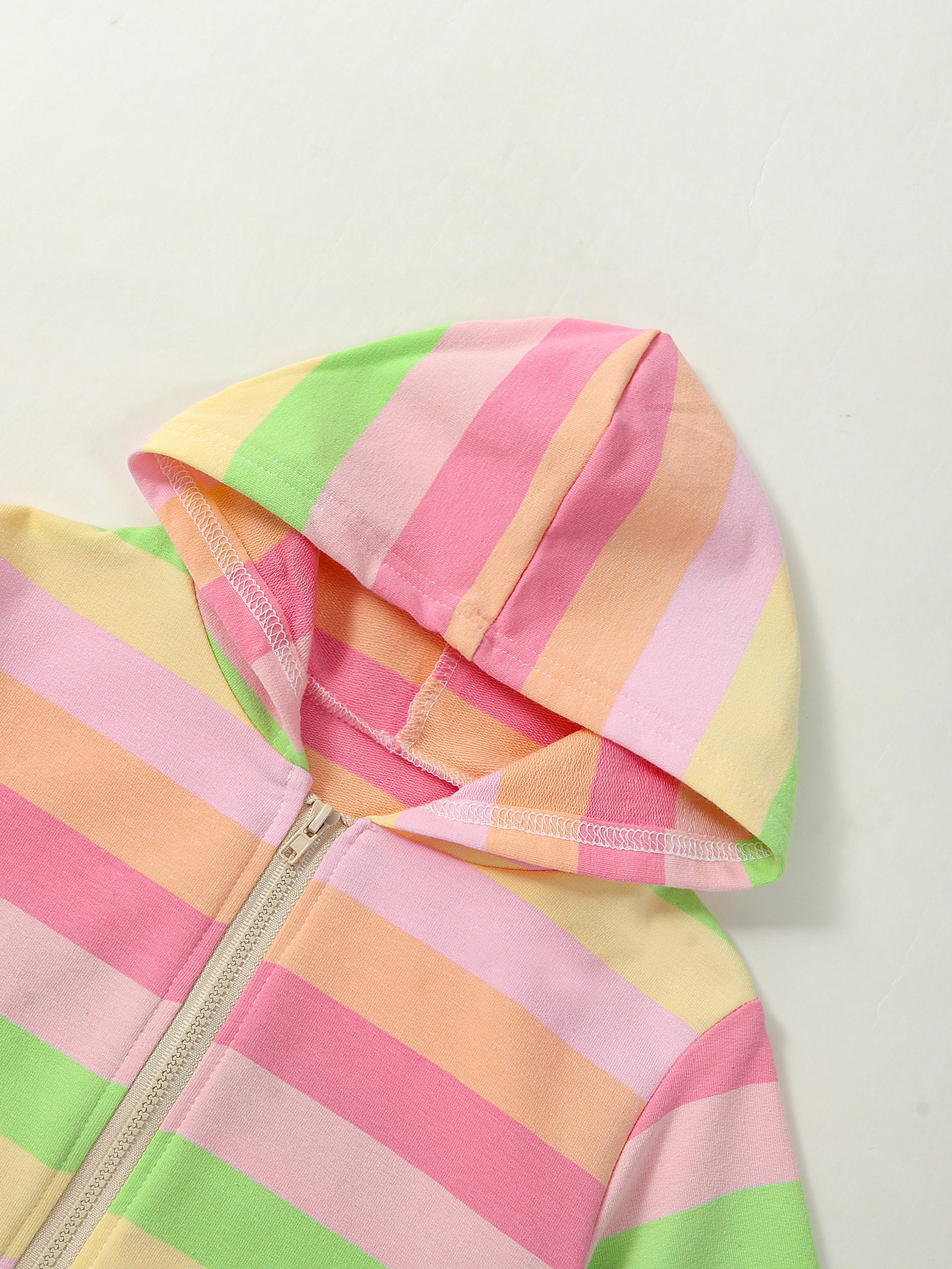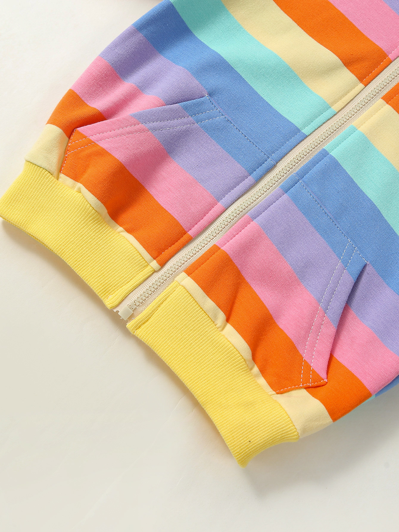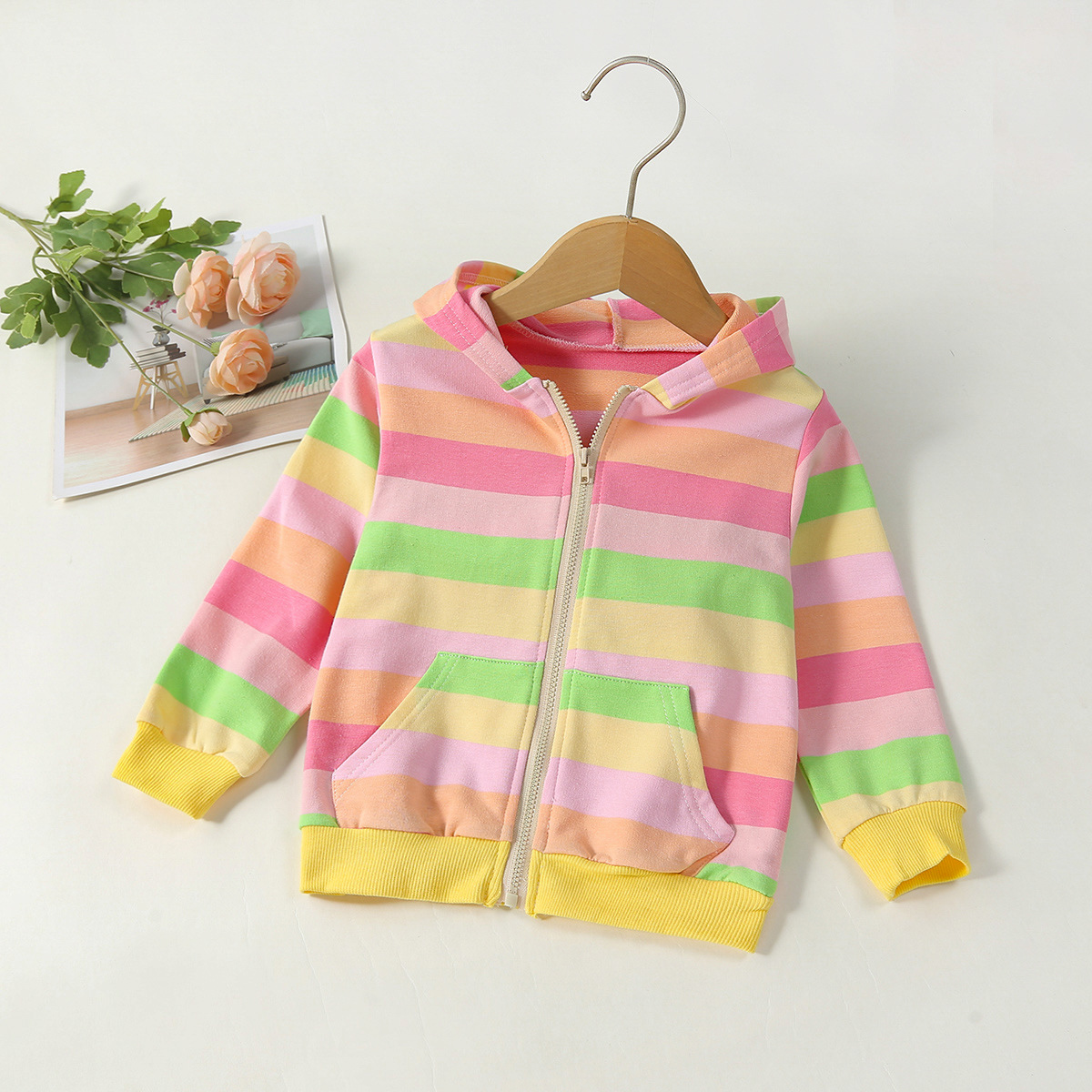 가을과 겨울 새로운 소녀 귀여운 지퍼 포켓 레인보우 스트립 후드 자켓 (스트라이프 패턴 랜덤, 아니