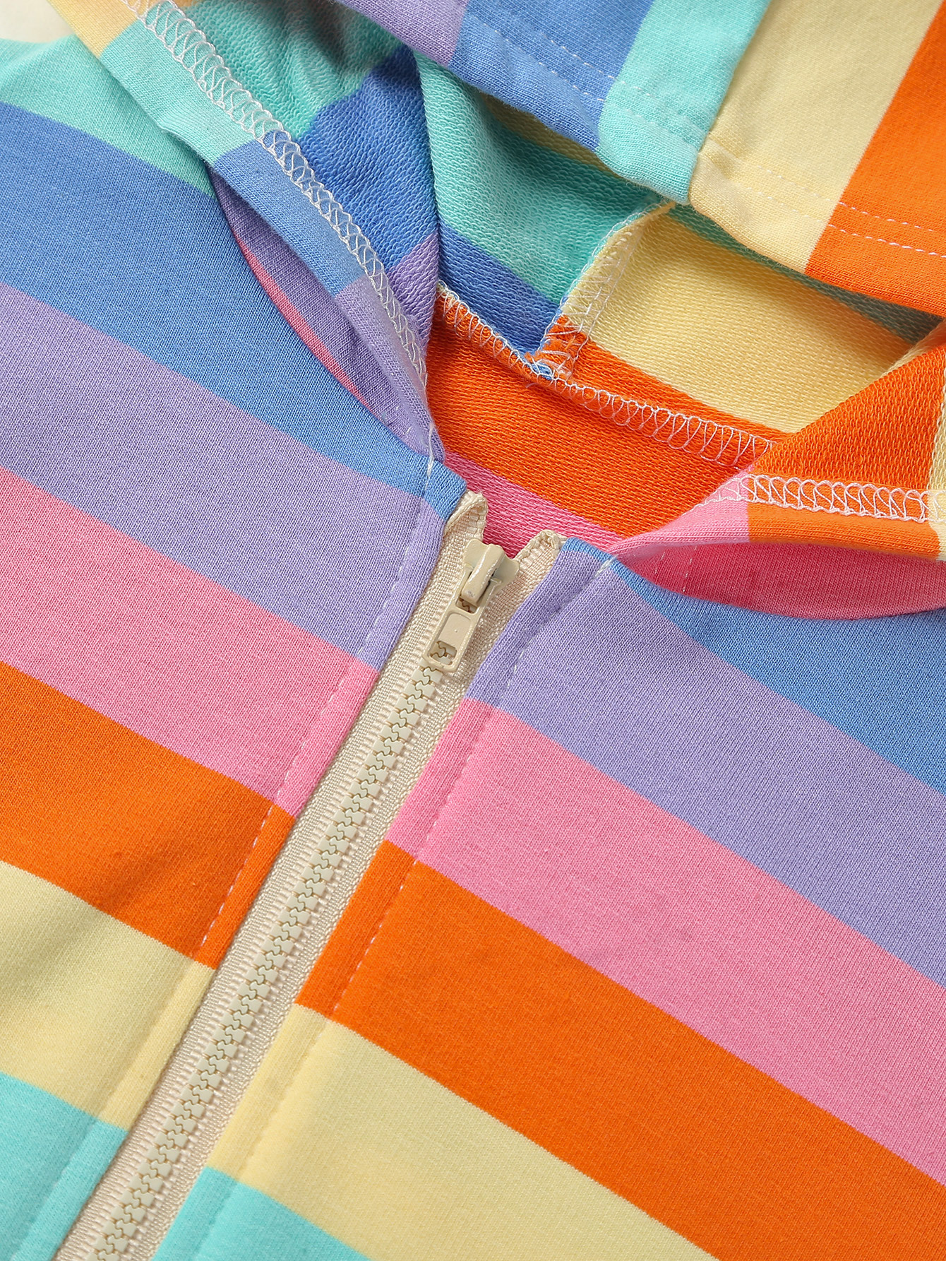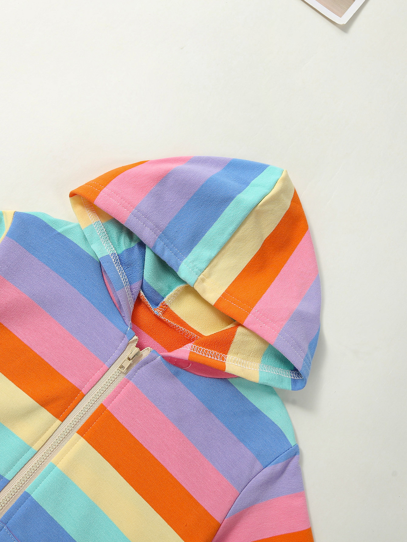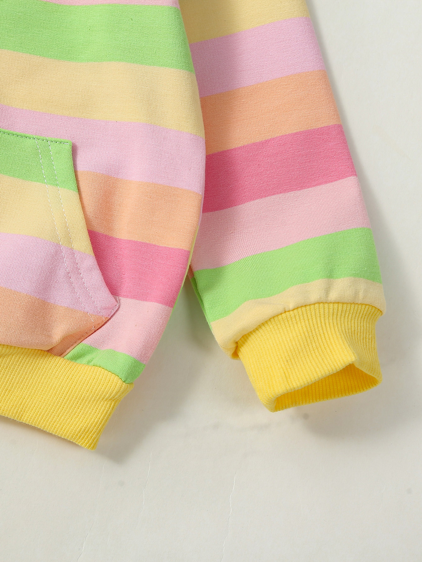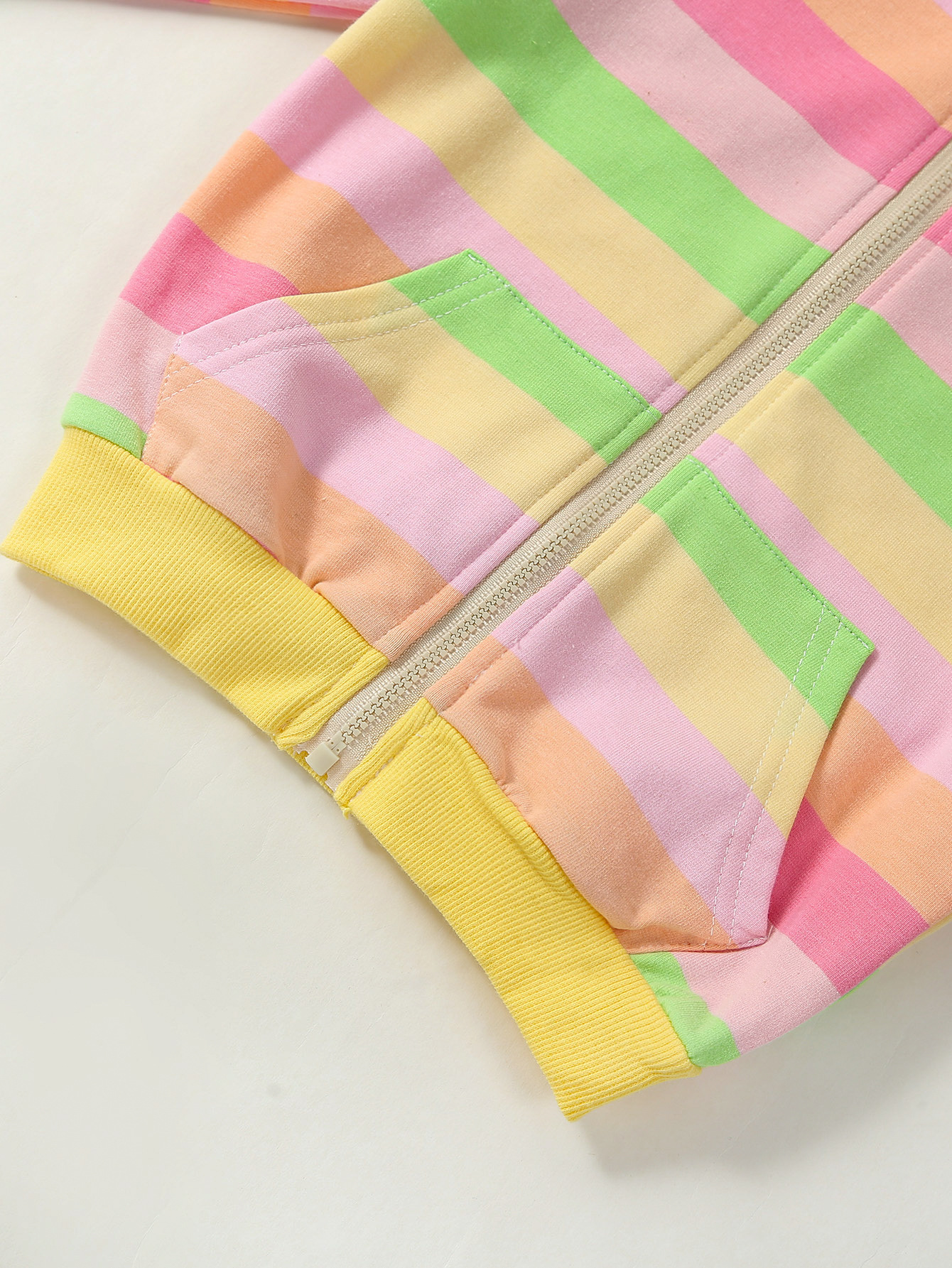 가을과 겨울 새로운 소녀 귀여운 지퍼 포켓 레인보우 스트립 후드 자켓 (스트라이프 패턴 랜덤, 아니