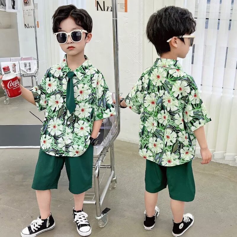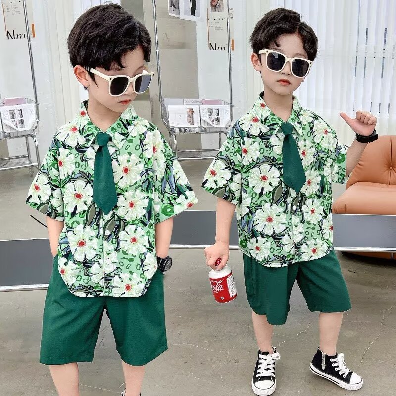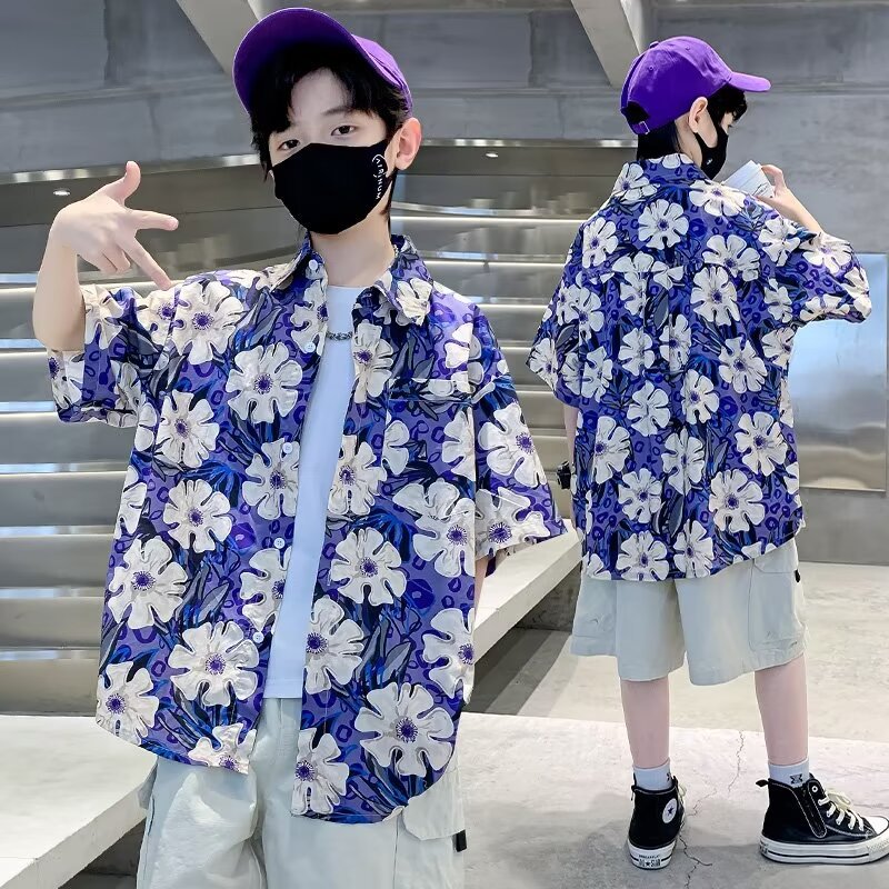 2025 새로운 여름 소년 일본 꽃 셔츠 중형 및 대형 어린이 유행 셔츠 어린이 캐주얼 솔리드 컬러 탑 트렌드