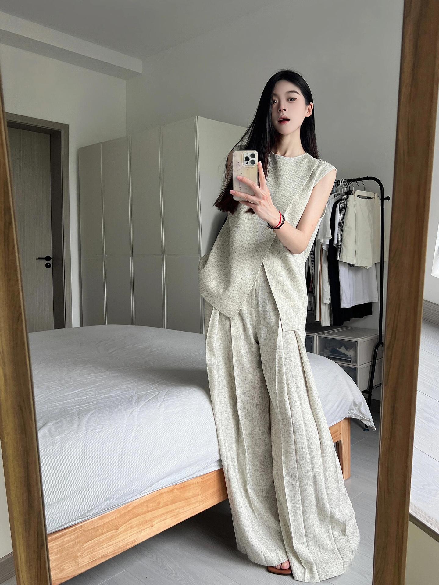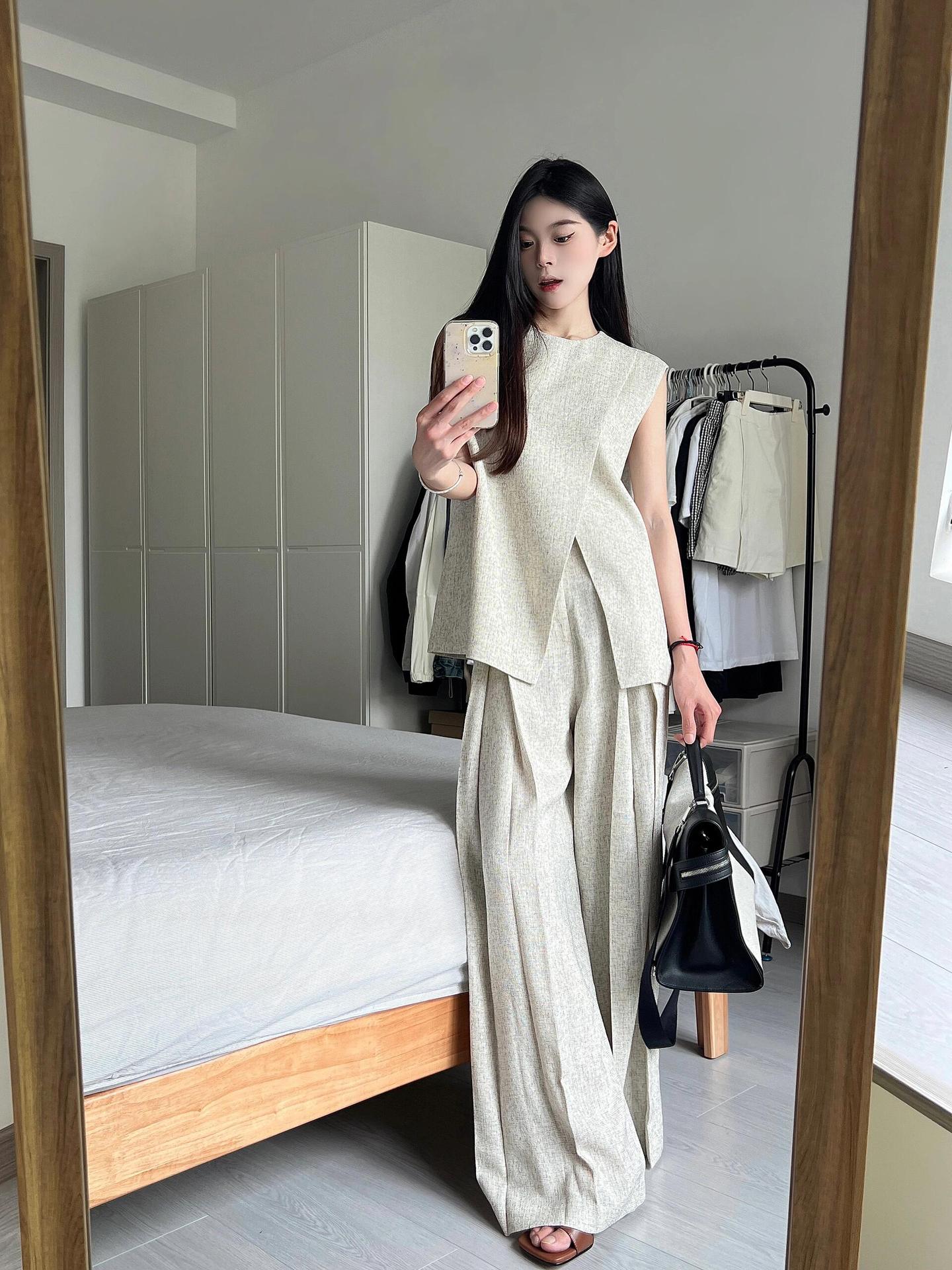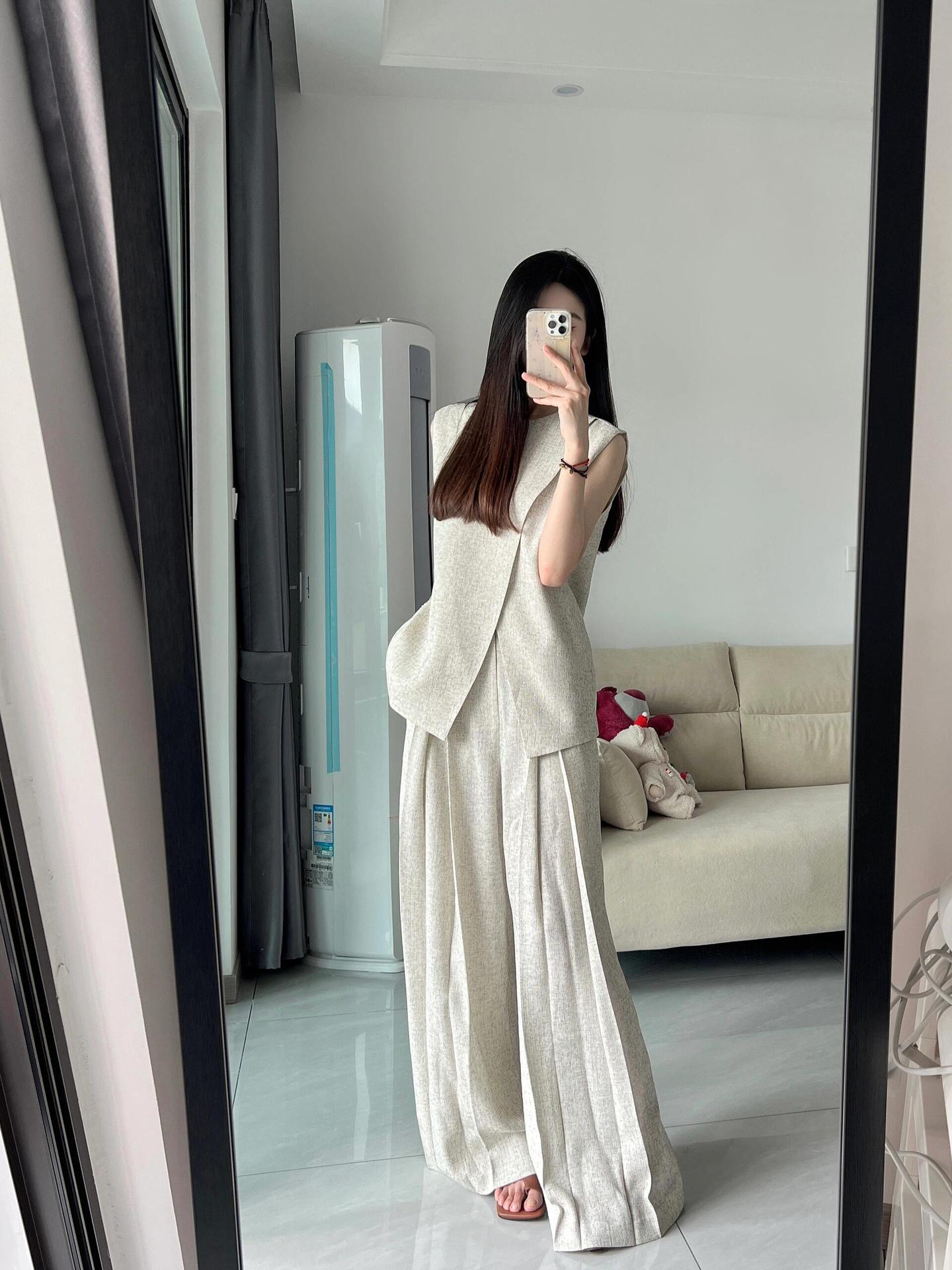 샤넬 스타일 둥근 목 민소매 분할 조끼 여성 여름 세트 느슨한 넓은 다리 바지 캐주얼 바지 투피스 세트스토어 가기