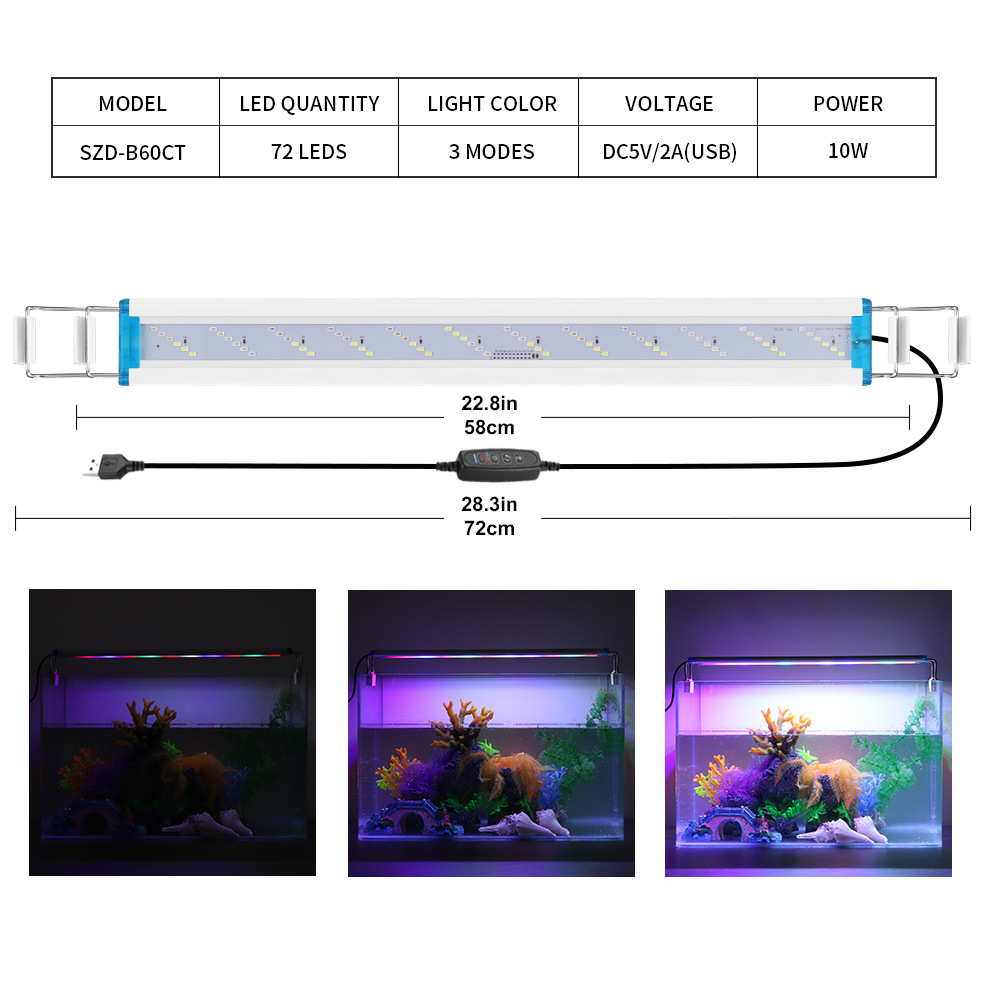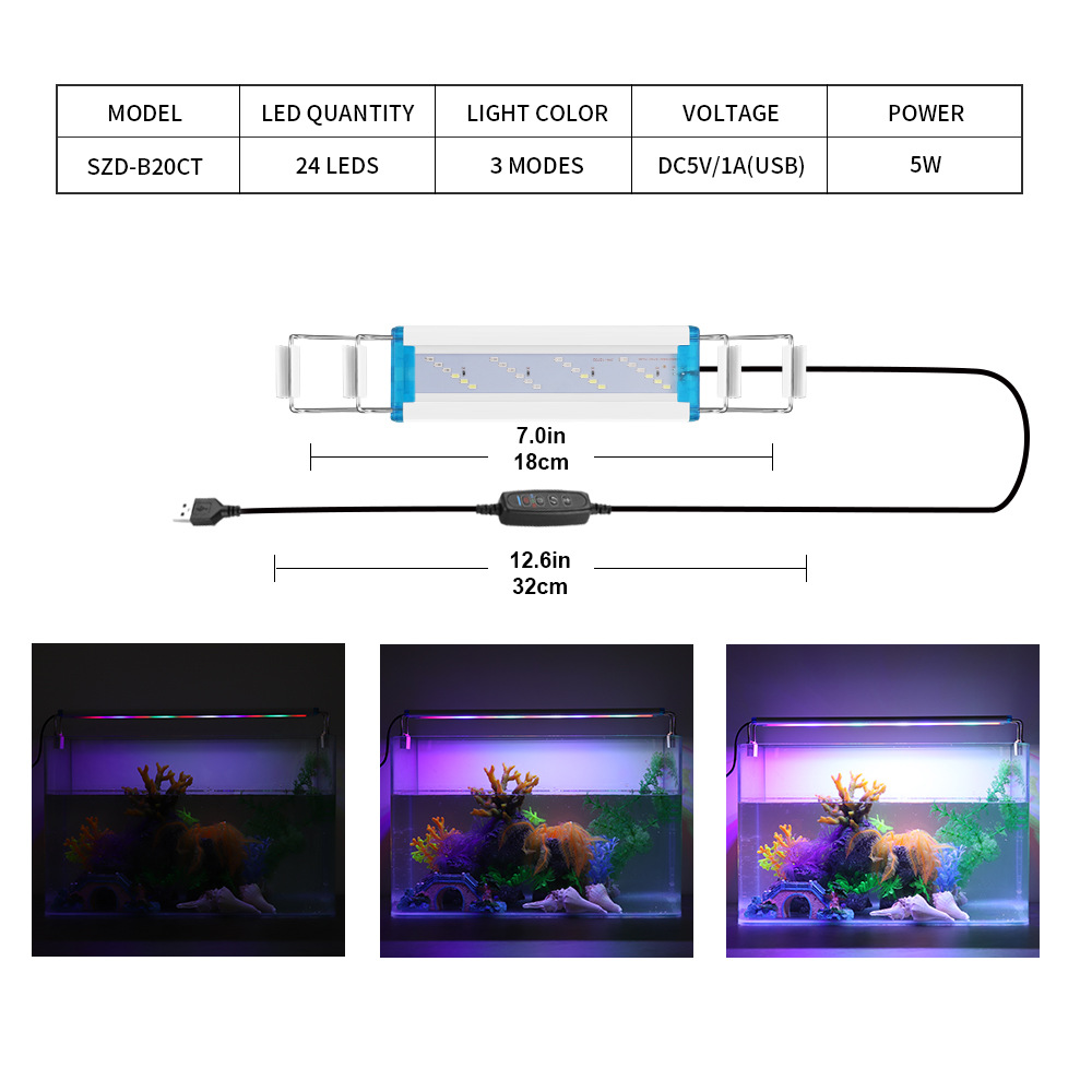特点:四排5730灯珠,蓝白灯光、红蓝光、增艳光三种模式调节选择,高亮度、高颜值、高质量,适合水草生长、鱼缸造景、鱼增艳;