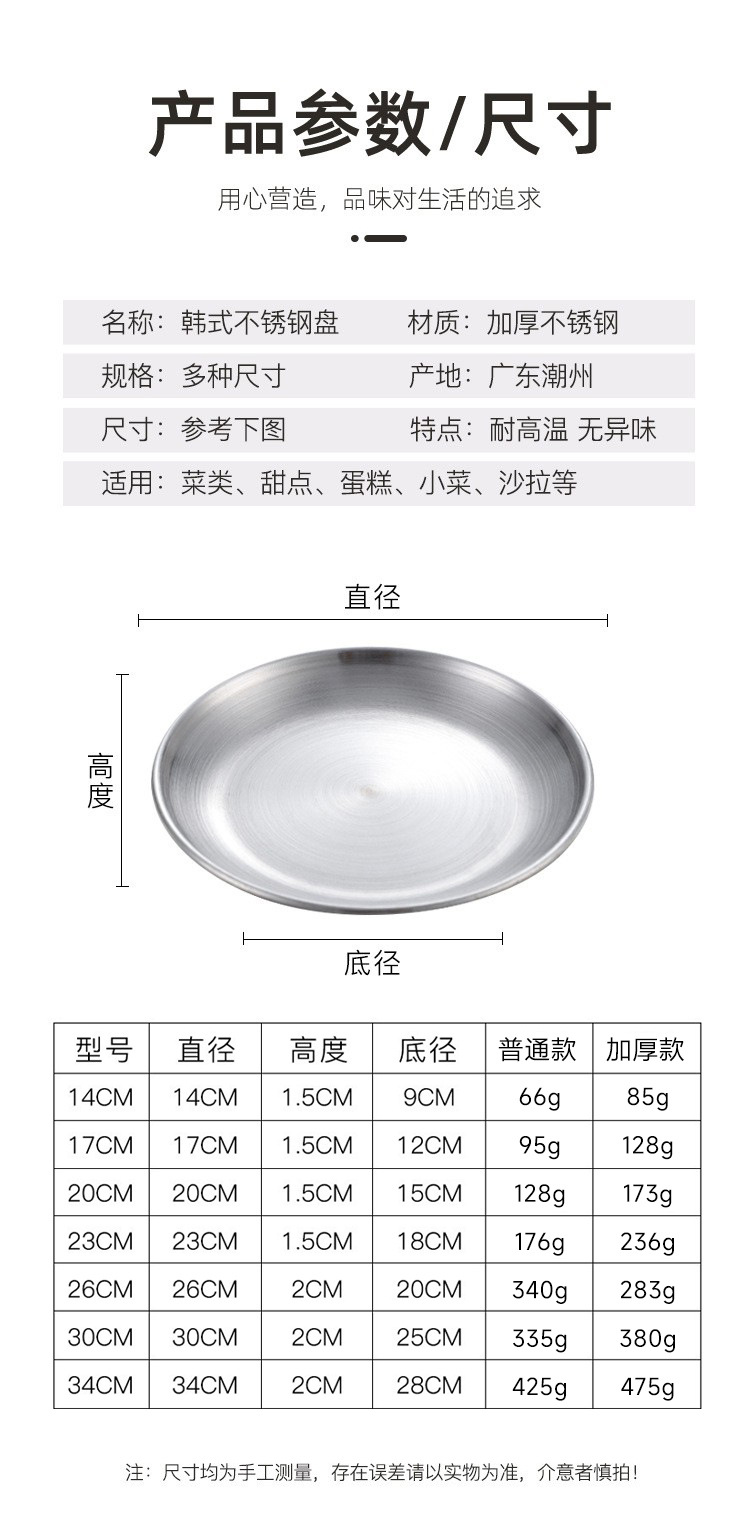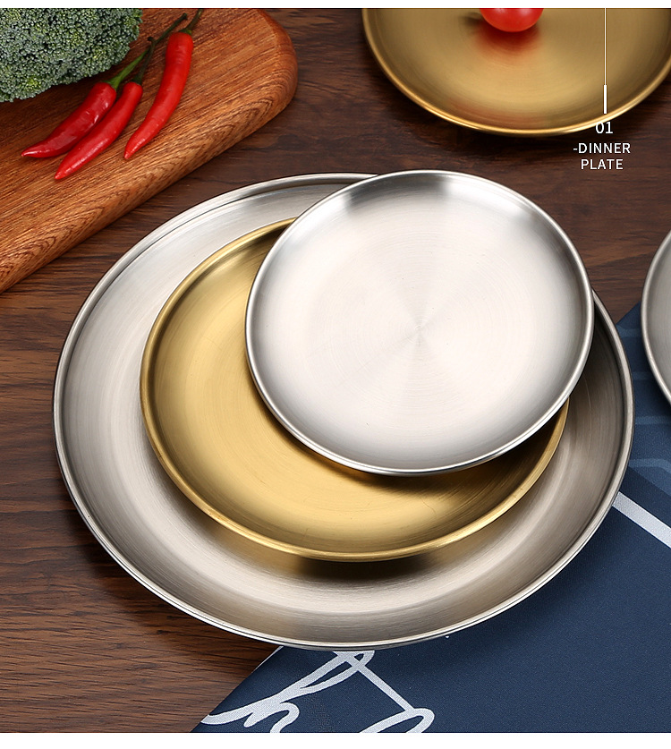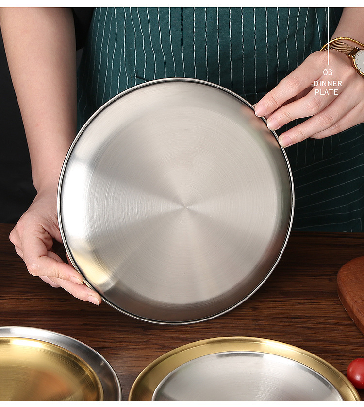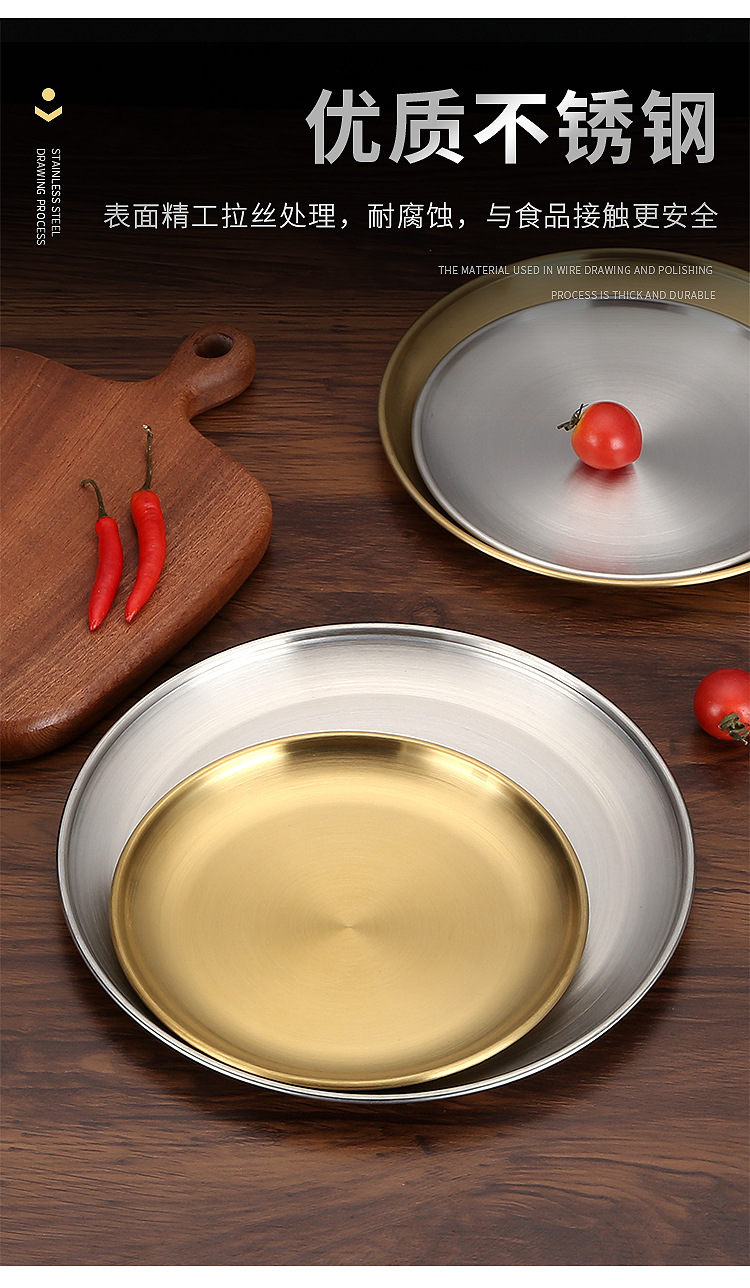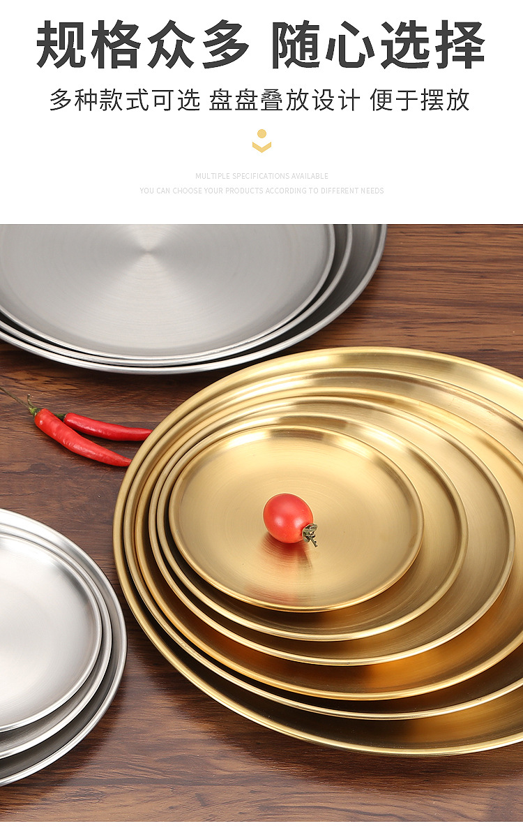 한국식 식기 304 스테인레스 스틸 원형 접시 두꺼운 바베큐 접시 뼈 껴받이 접시 황금색 트레이 과일 케이크 접시스토어 가기