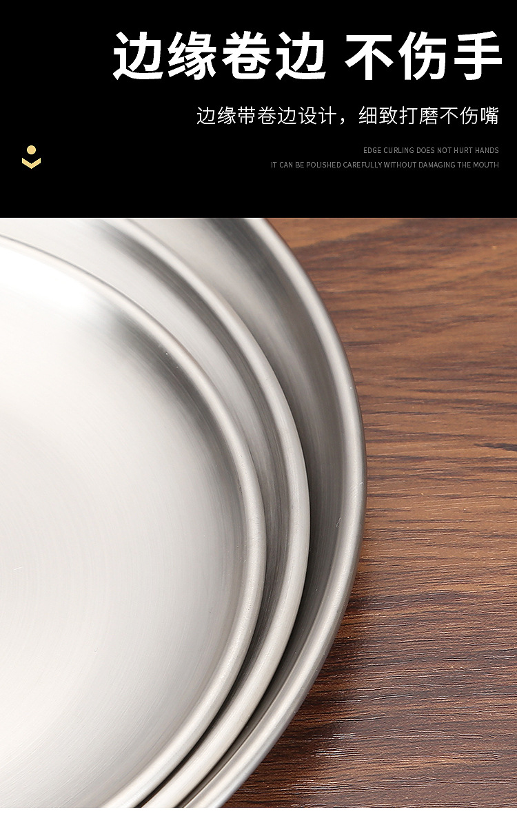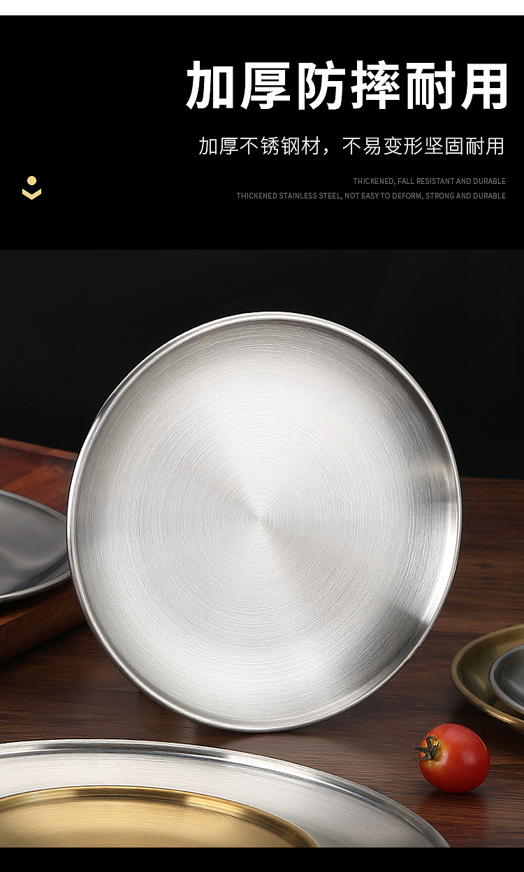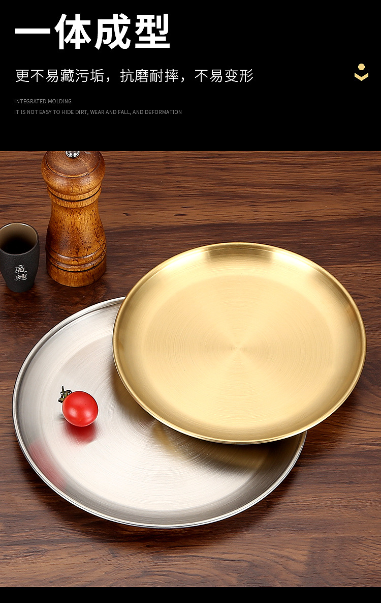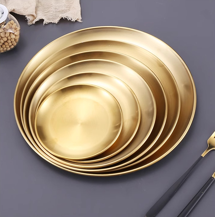 한국식 식기 304 스테인레스 스틸 원형 접시 두꺼운 바베큐 접시 뼈 껴받이 접시 황금색 트레이 과일 케이크 접시