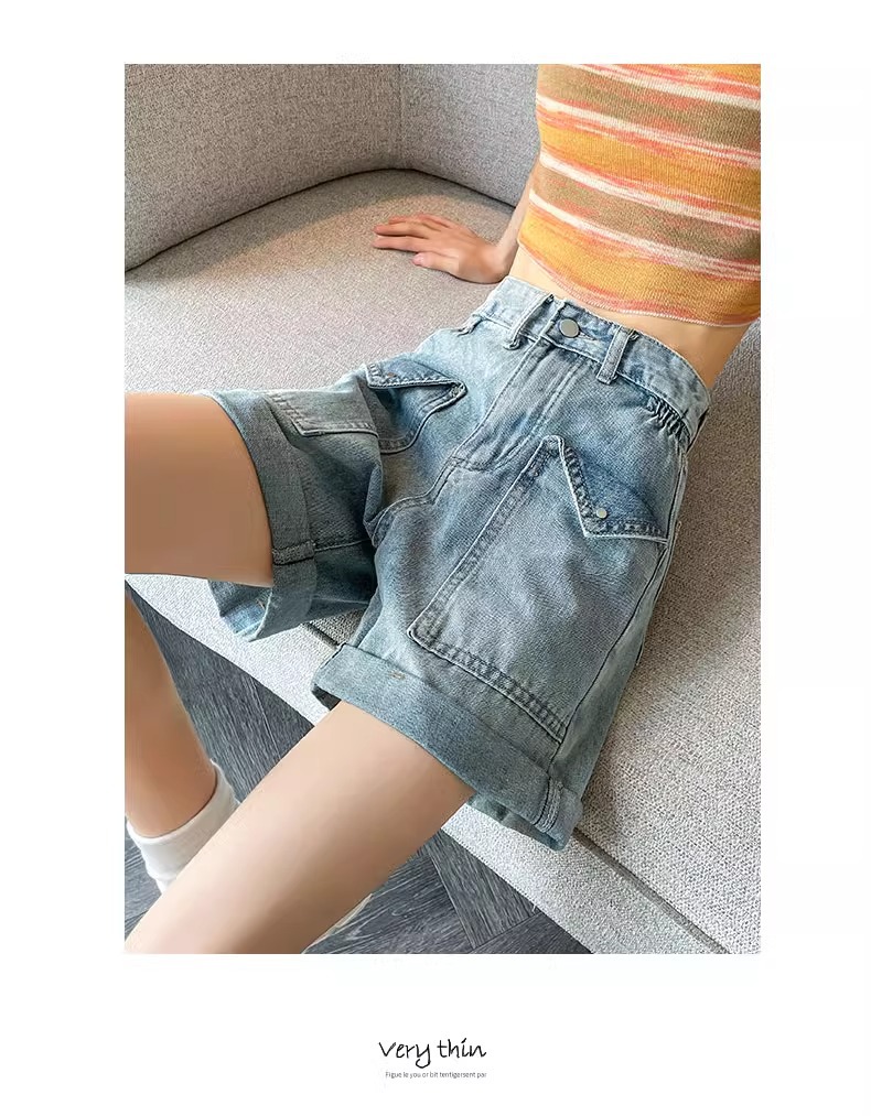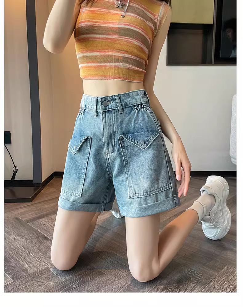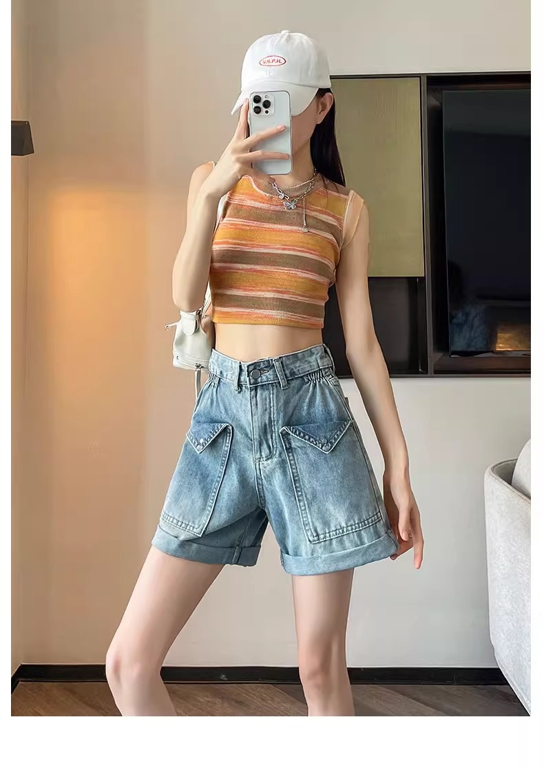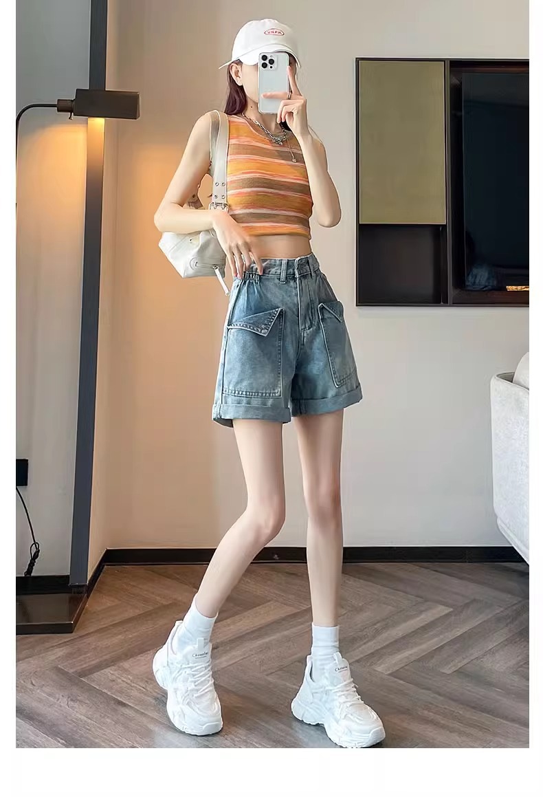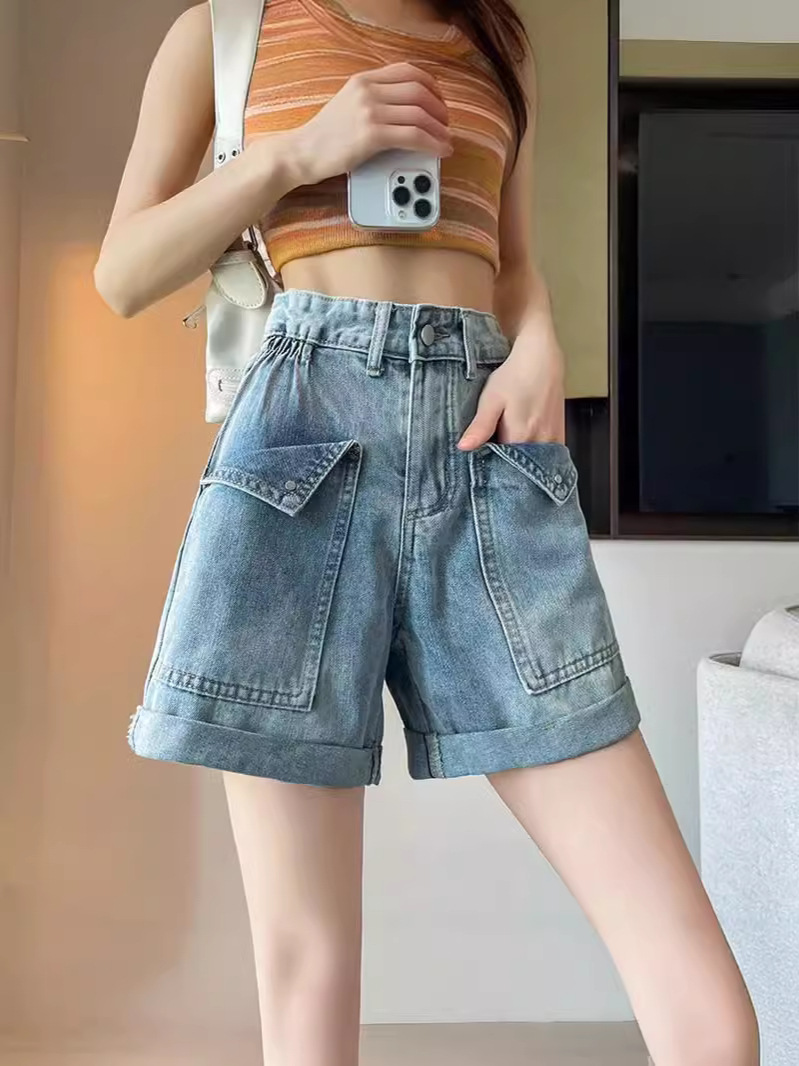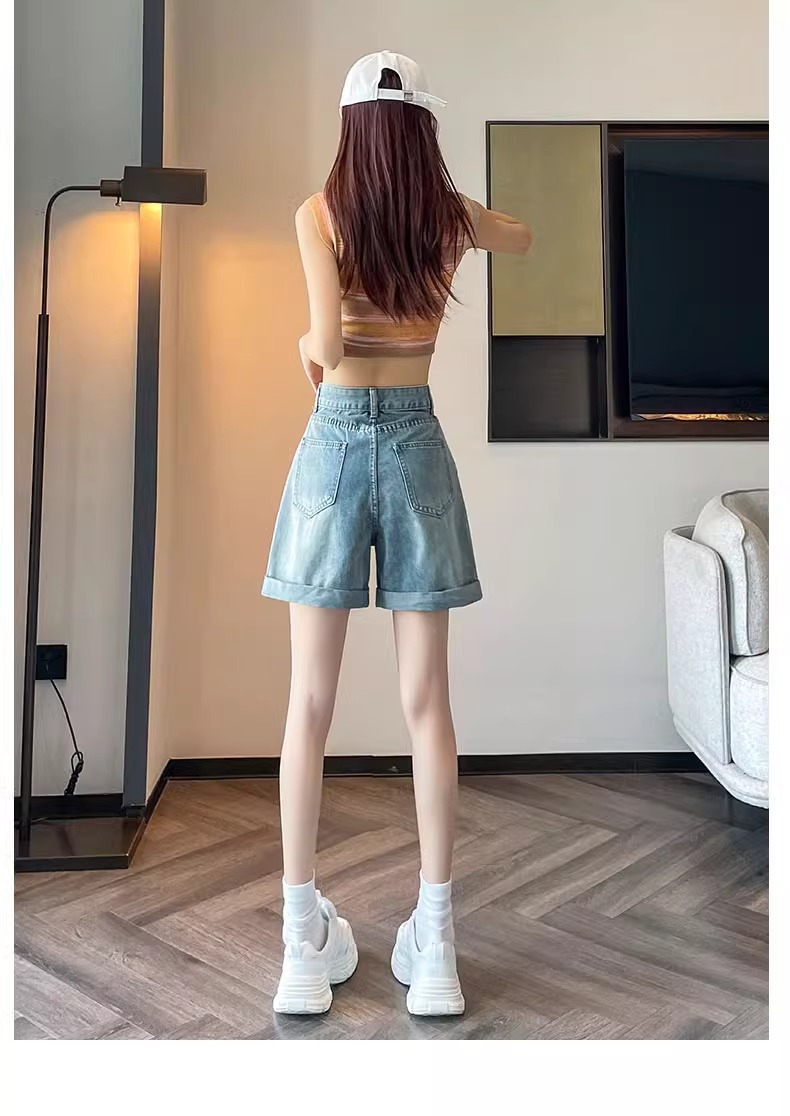 컬링 된 스트레이트 데님 반바지 여성 2024 년 여름 새로운 높은 허리 슬리밍 느슨한 측면 탄성 컬링 넓은 다리 바지스토어 가기