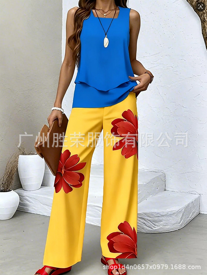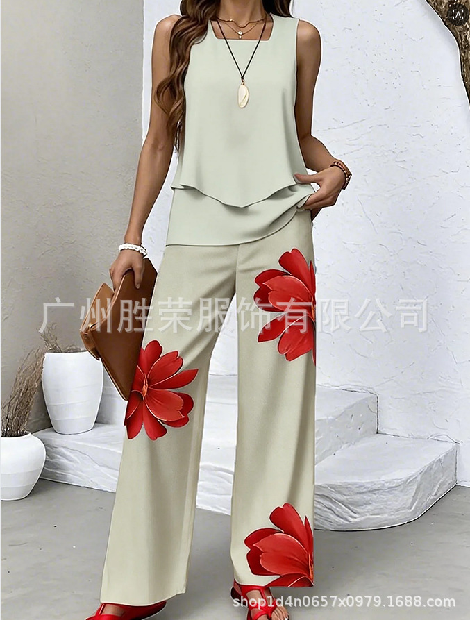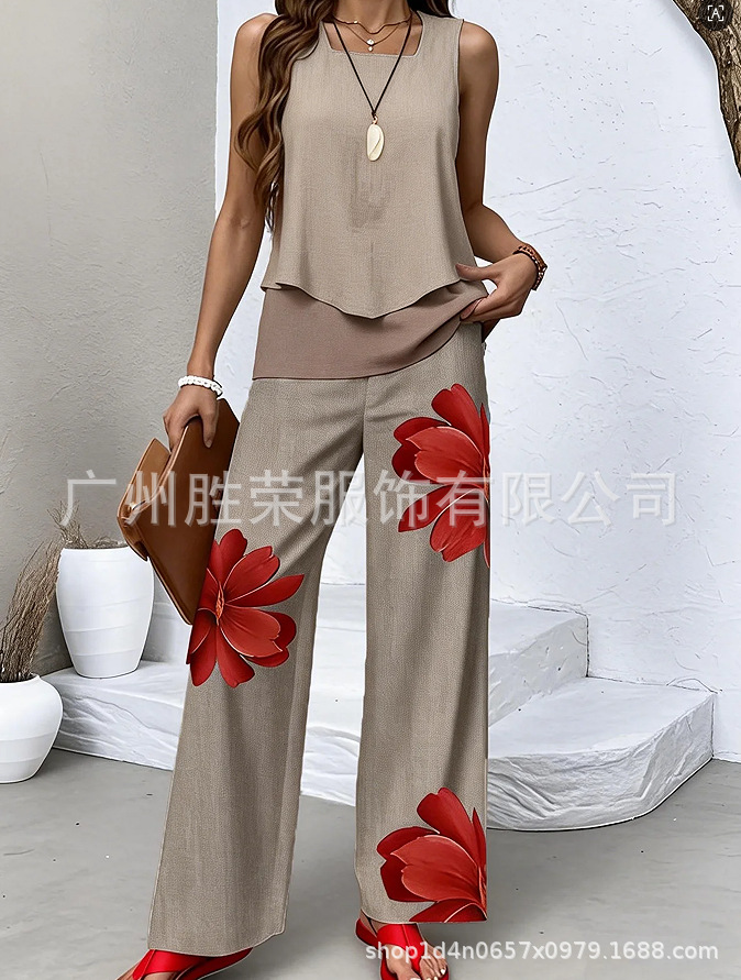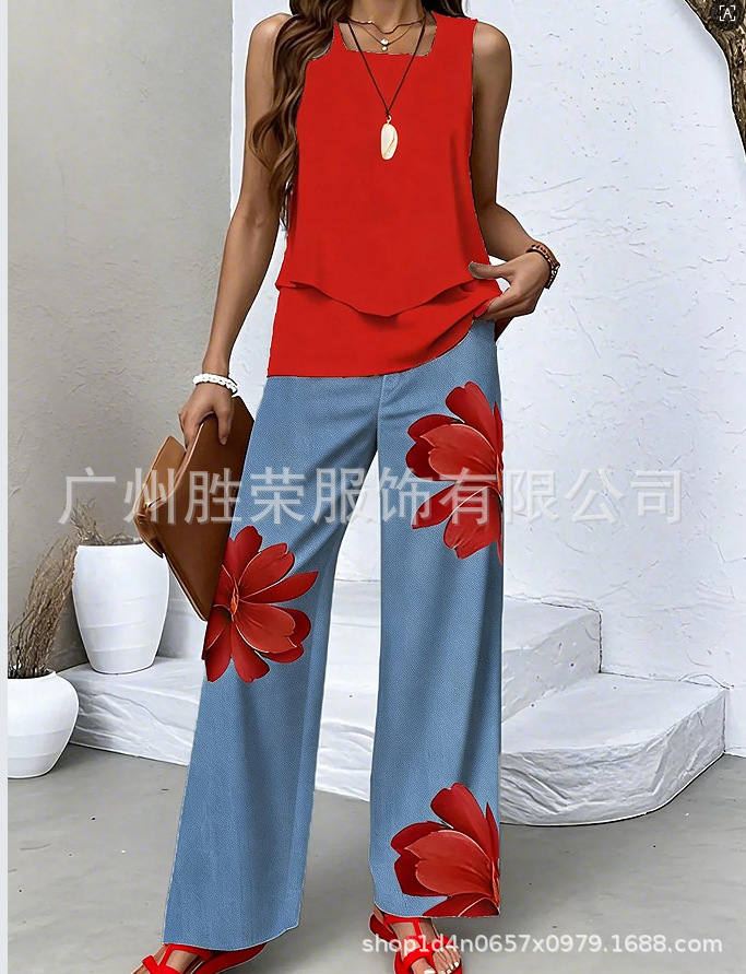 2025 새로운 재고 국경 간 대외 무역 유럽과 미국 여성 독립 역, 민소매 더블 레이어 조끼 바지 세트 판매스토어 가기