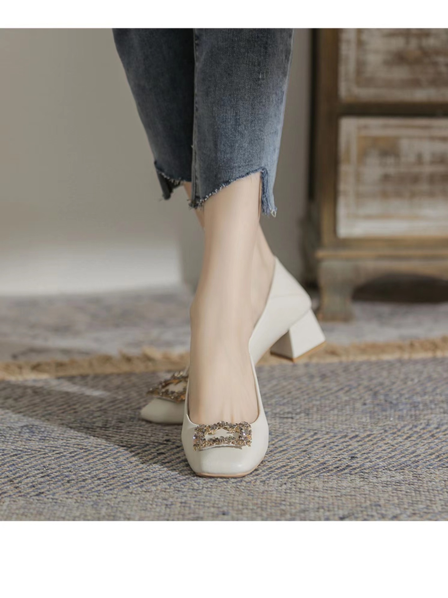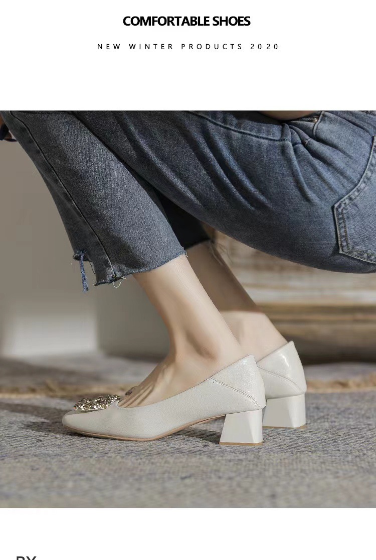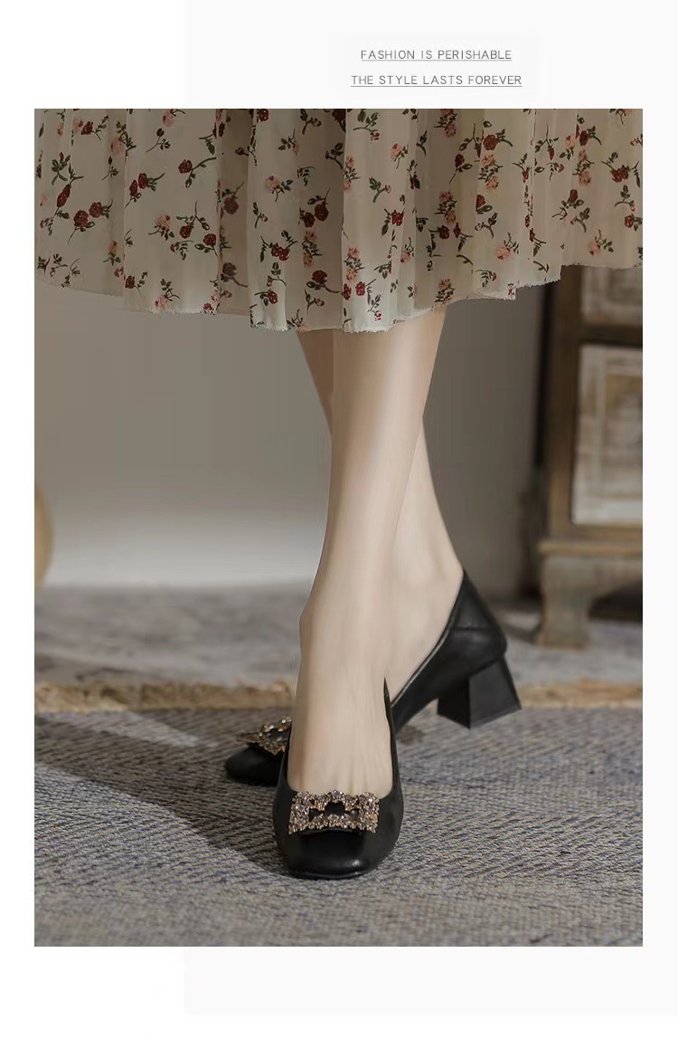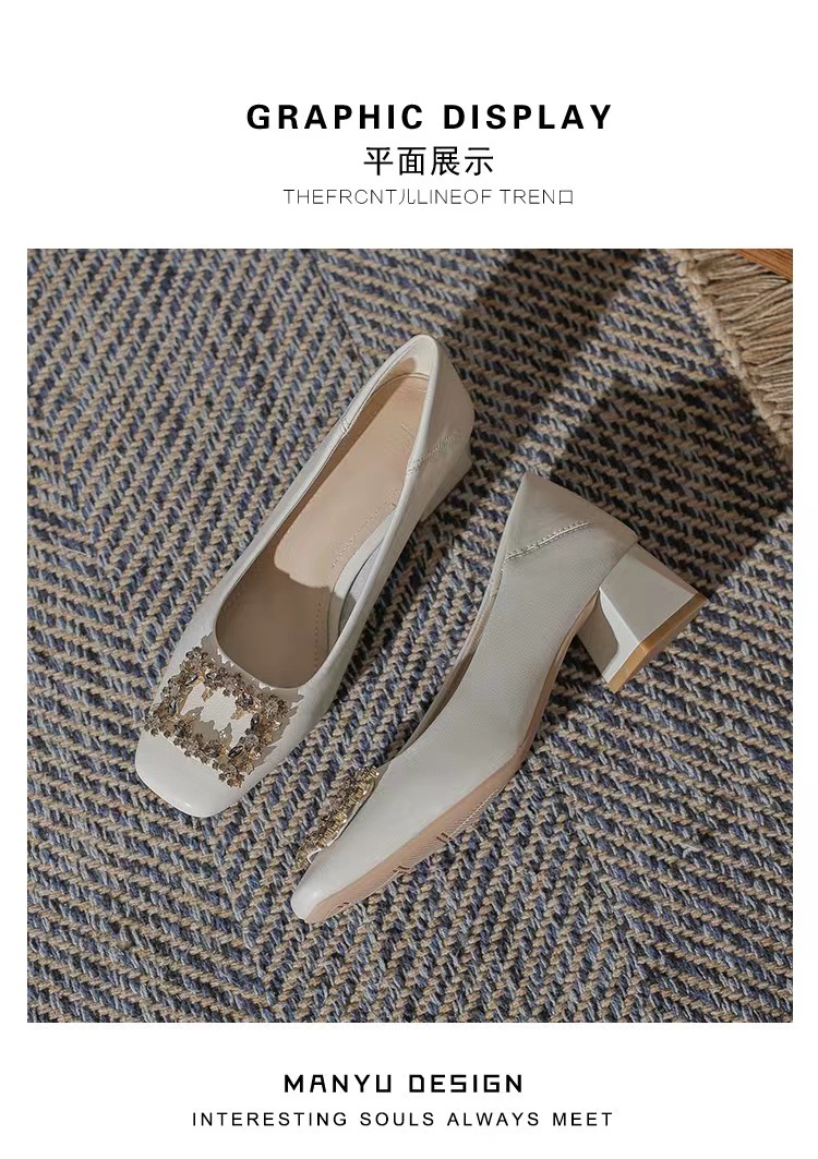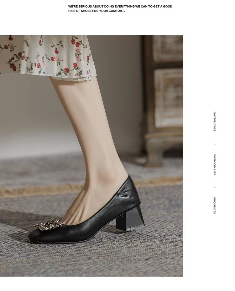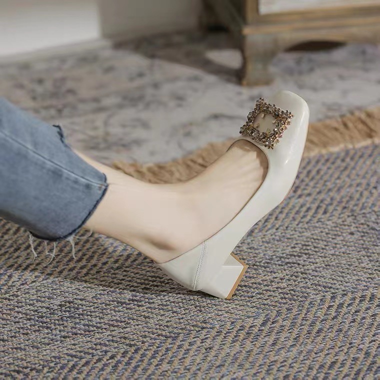 정품 가죽 두꺼운 힐 신발 여성의 2024 새로운 라인스톤 미드 힐 얕은 엄마 신발 프랑스 전문 하이힐 41스토어 가기