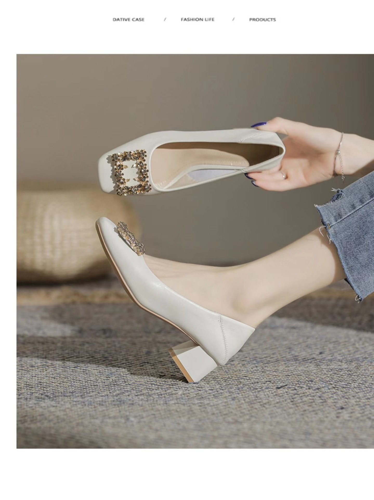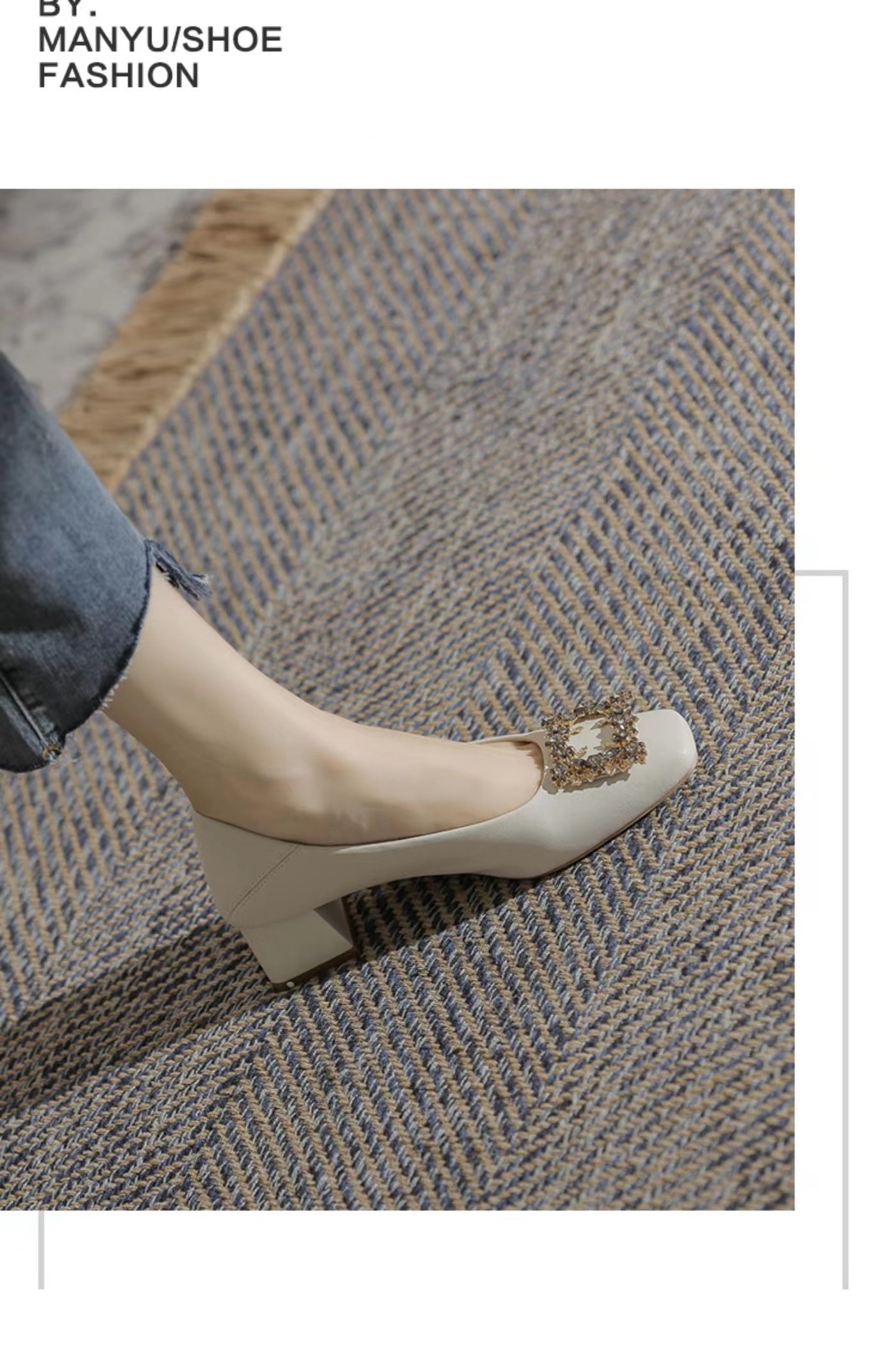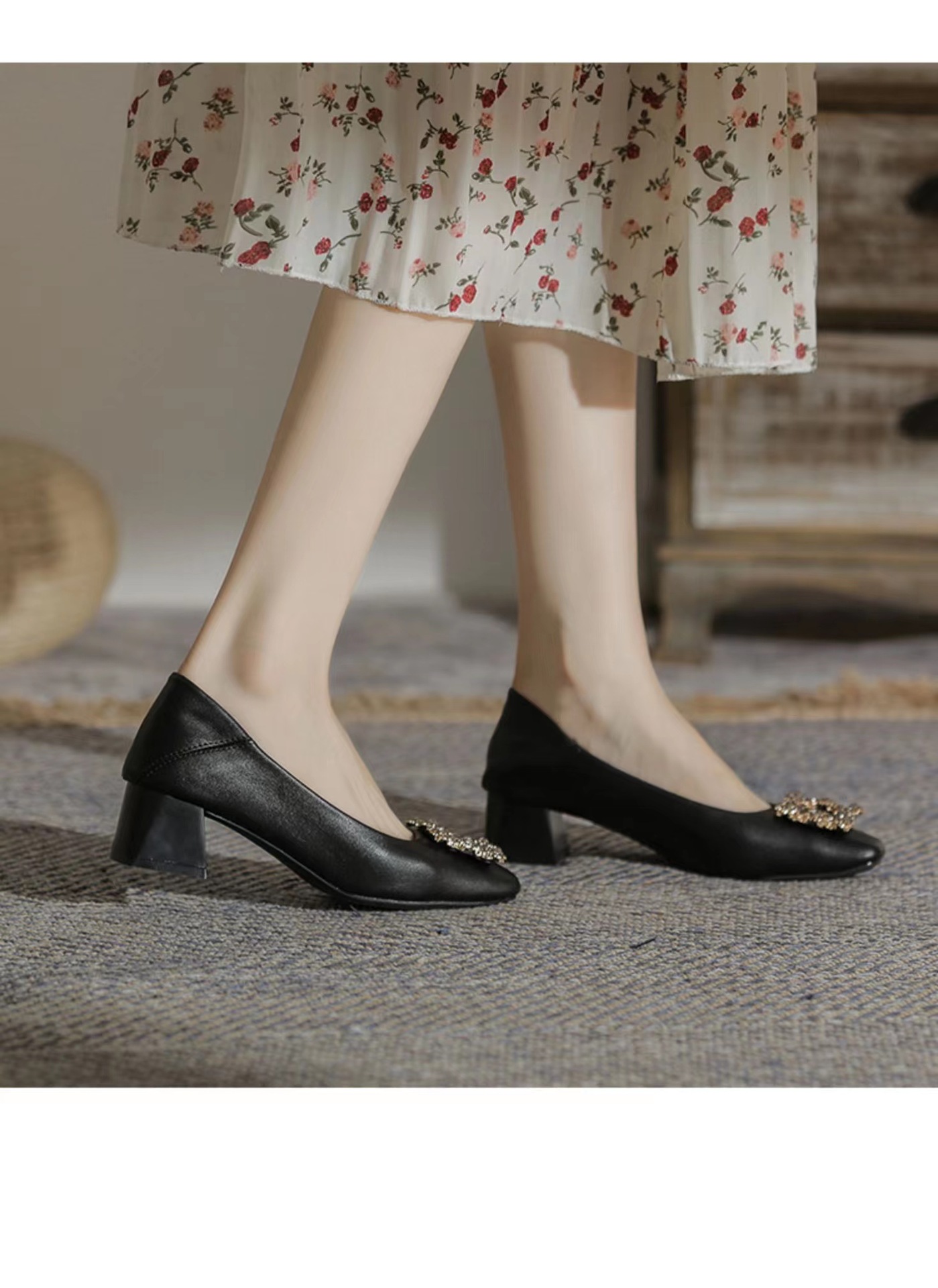정품 가죽 두꺼운 힐 신발 여성의 2024 새로운 라인스톤 미드 힐 얕은 엄마 신발 프랑스 전문 하이힐 41스토어 가기