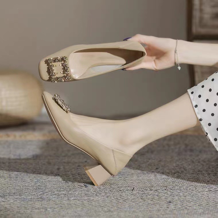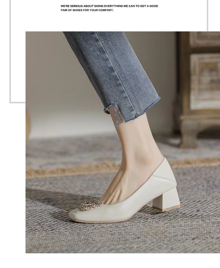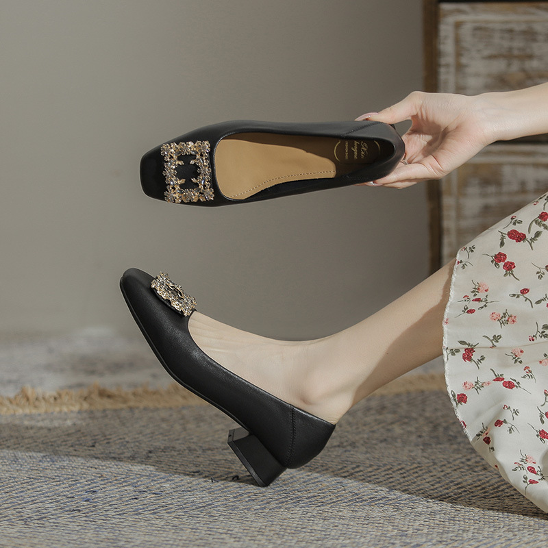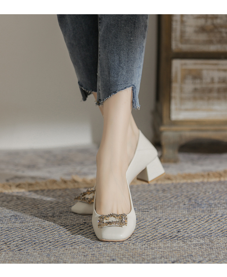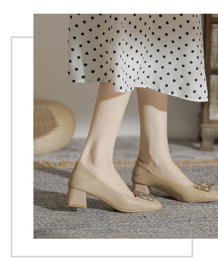 정품 가죽 두꺼운 힐 신발 여성의 2024 새로운 라인스톤 미드 힐 얕은 엄마 신발 프랑스 전문 하이힐 41