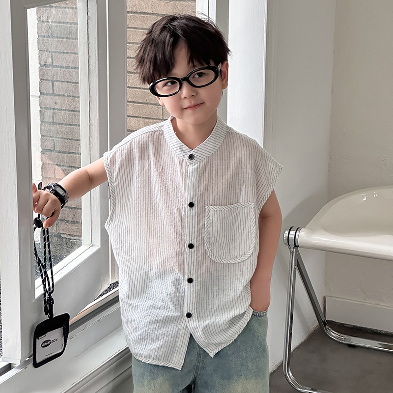 [클리어아웃 세일] 소년 여름 잘생긴 포켓 스트라이프 민소매 탑 아동용 면 및 린넨 경량 캐주얼 셔츠스토어 가기