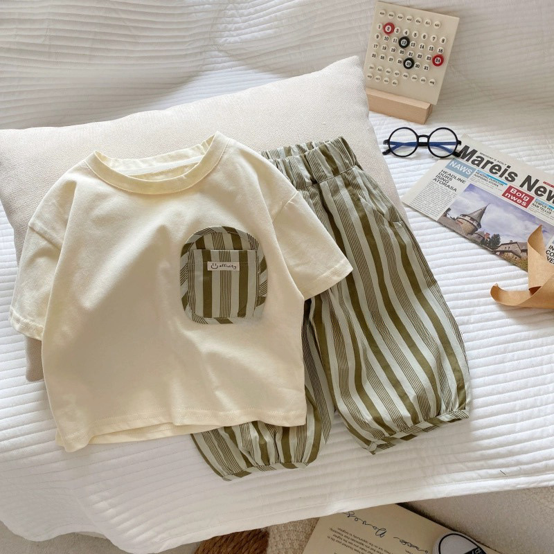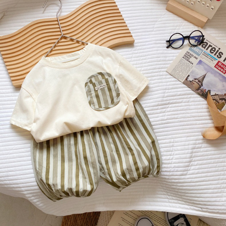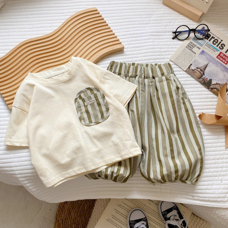 새로운 남아 여아 면 반팔 세트, 여름 신상 아기 스타일 티셔츠, 중소형 아동 캐주얼 7부 바지 아동복스토어 가기