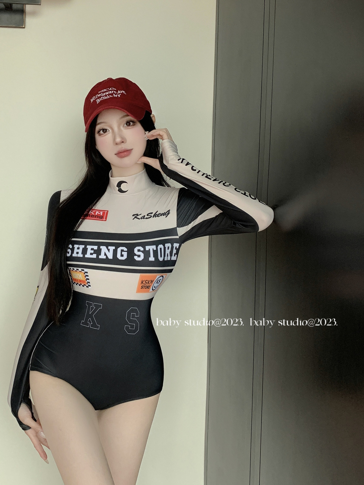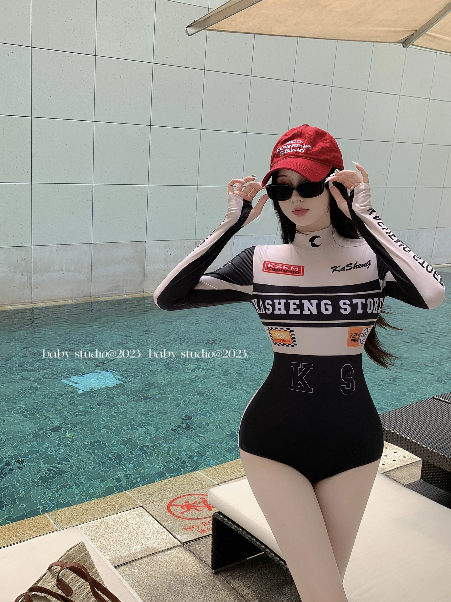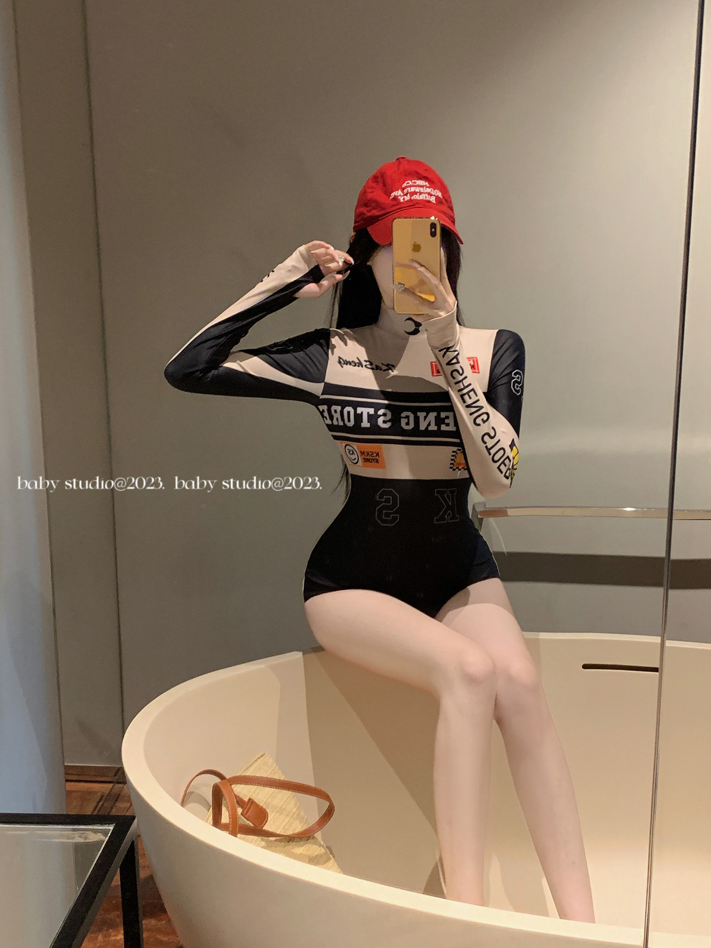 순수한 원피스 수영복 여성의 긴팔 보수적 인 자외선 차단제 작은 가슴이 모여 살을 가리는 해변 다이빙 의류 휴가를 덮었습니다.