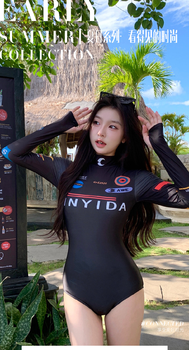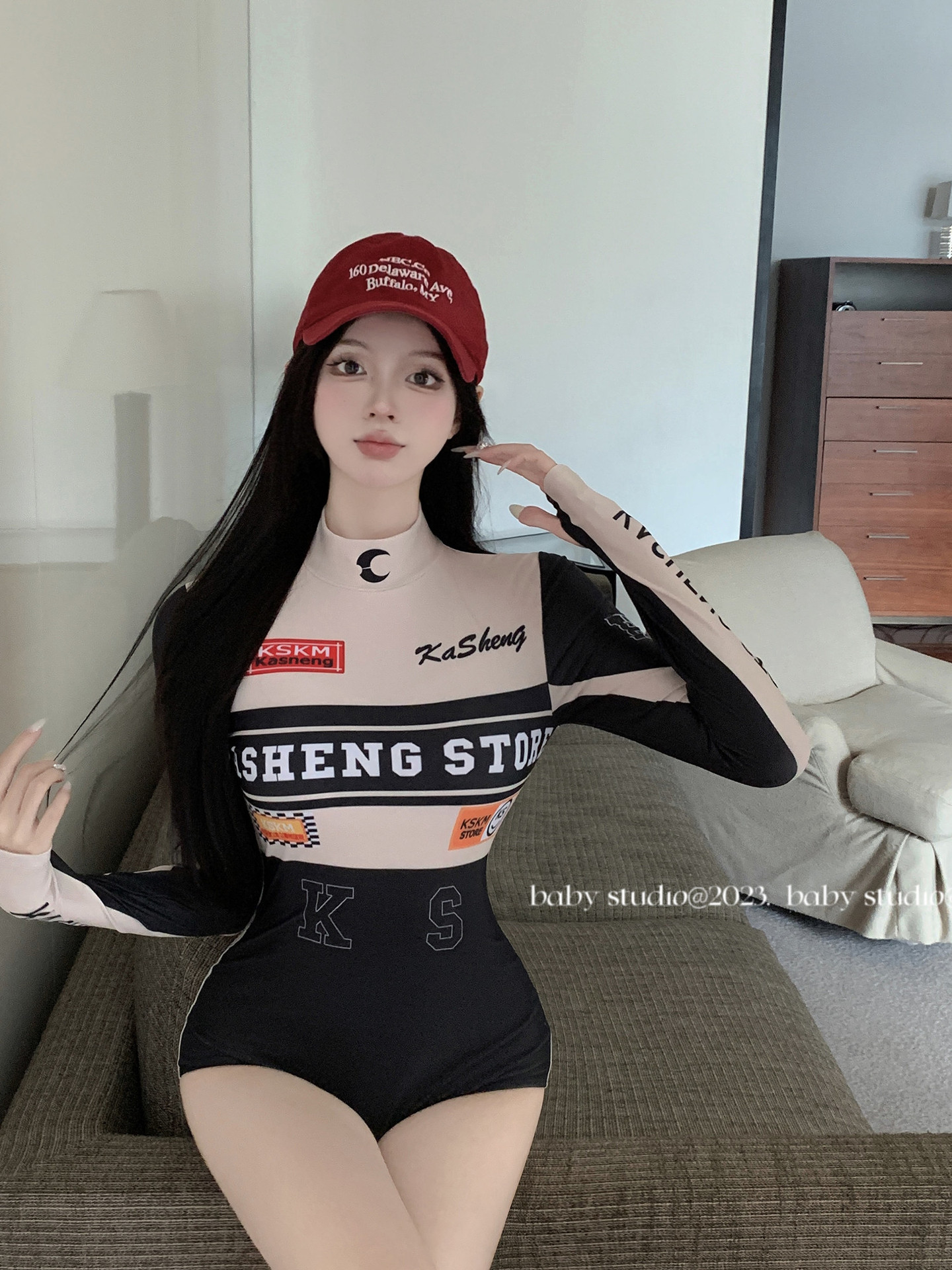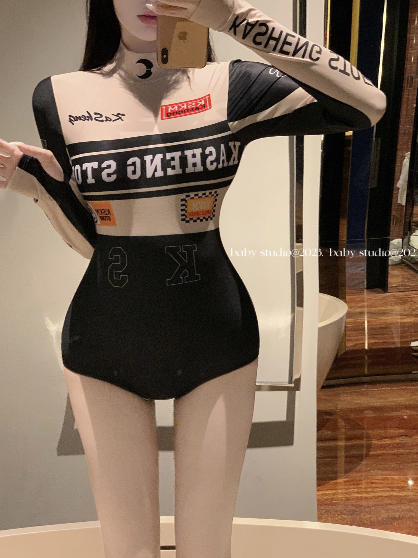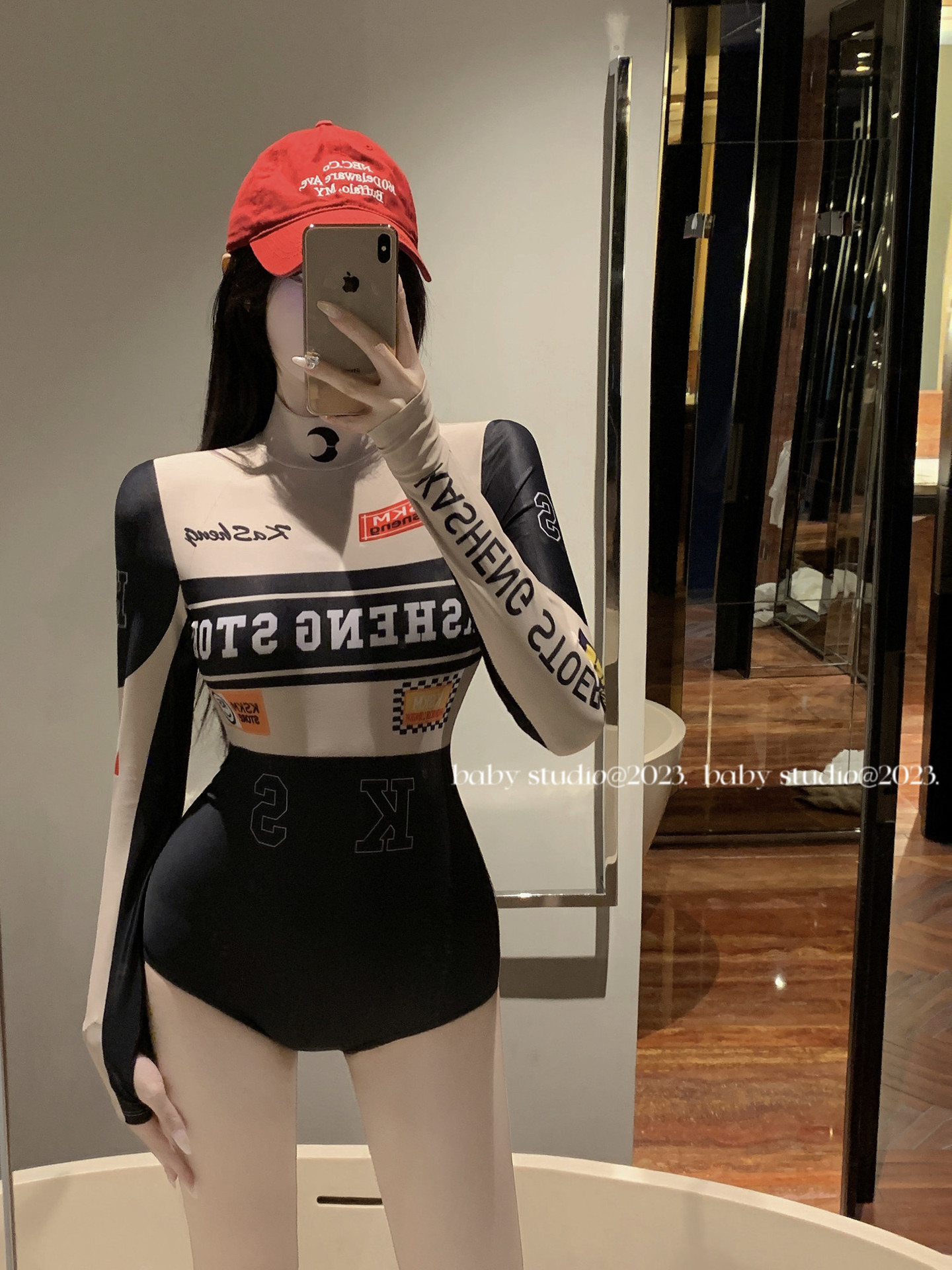 순수한 원피스 수영복 여성의 긴팔 보수적 인 자외선 차단제 작은 가슴이 모여 살을 가리는 해변 다이빙 의류 휴가를 덮었습니다.