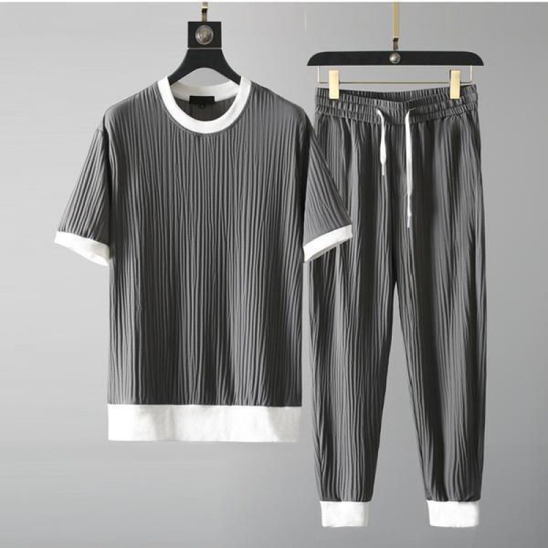 여름 얼음 통기성 반팔 세트 남자 캐주얼 스포츠 세트 주름진 스트레치 트렌디 투피스 바지 세트스토어 가기