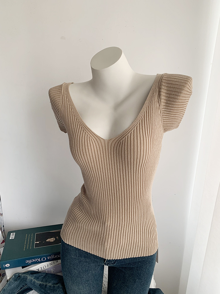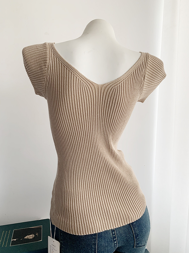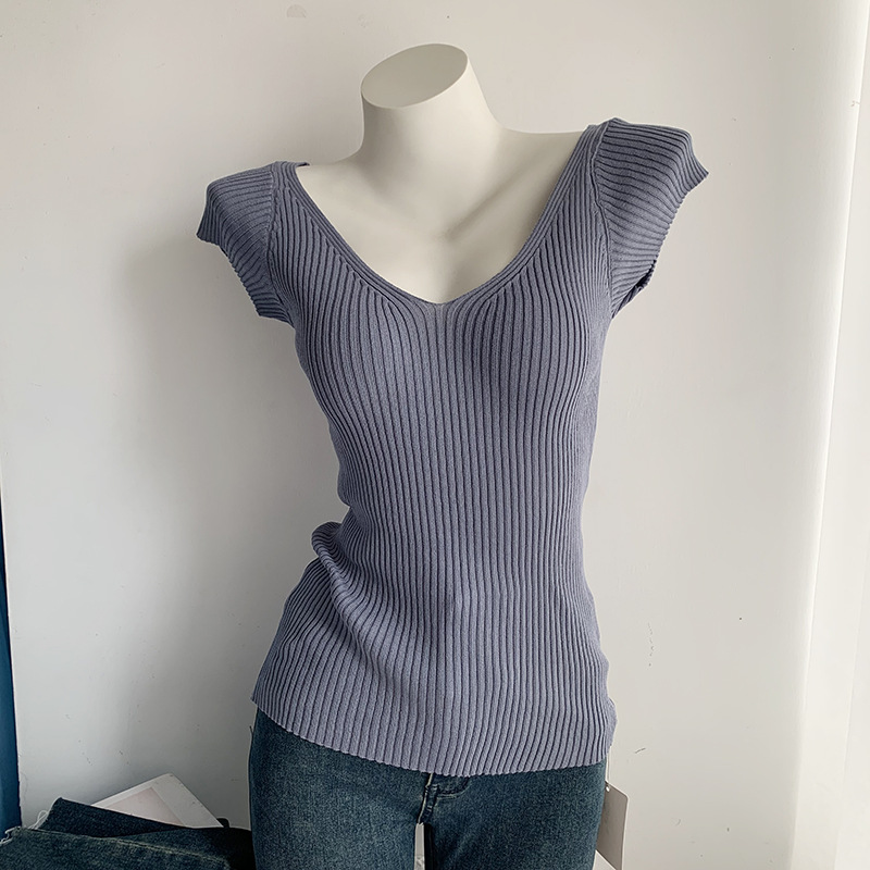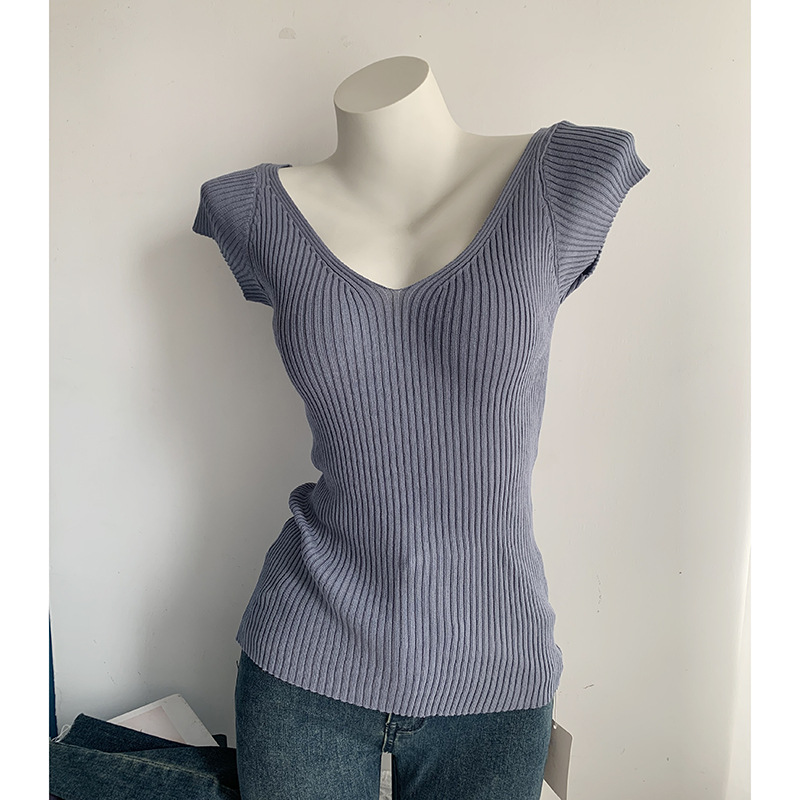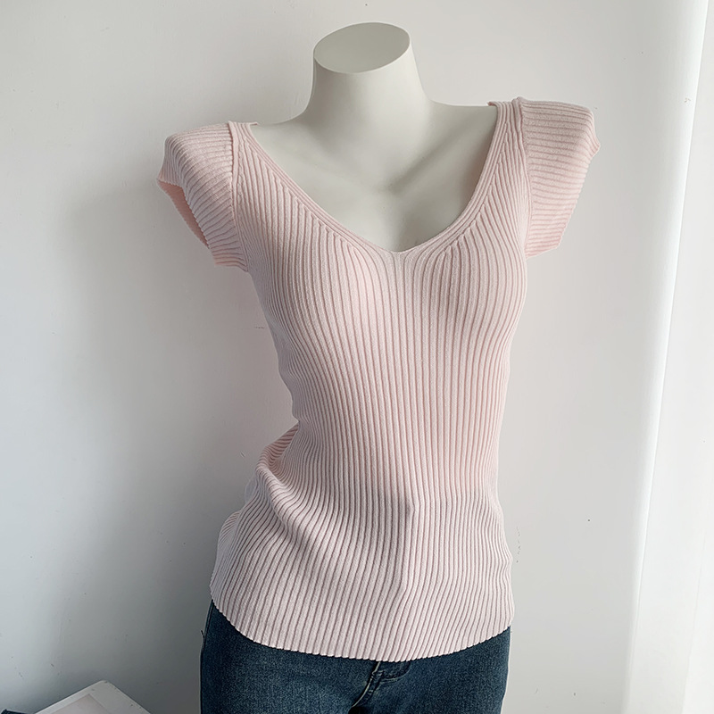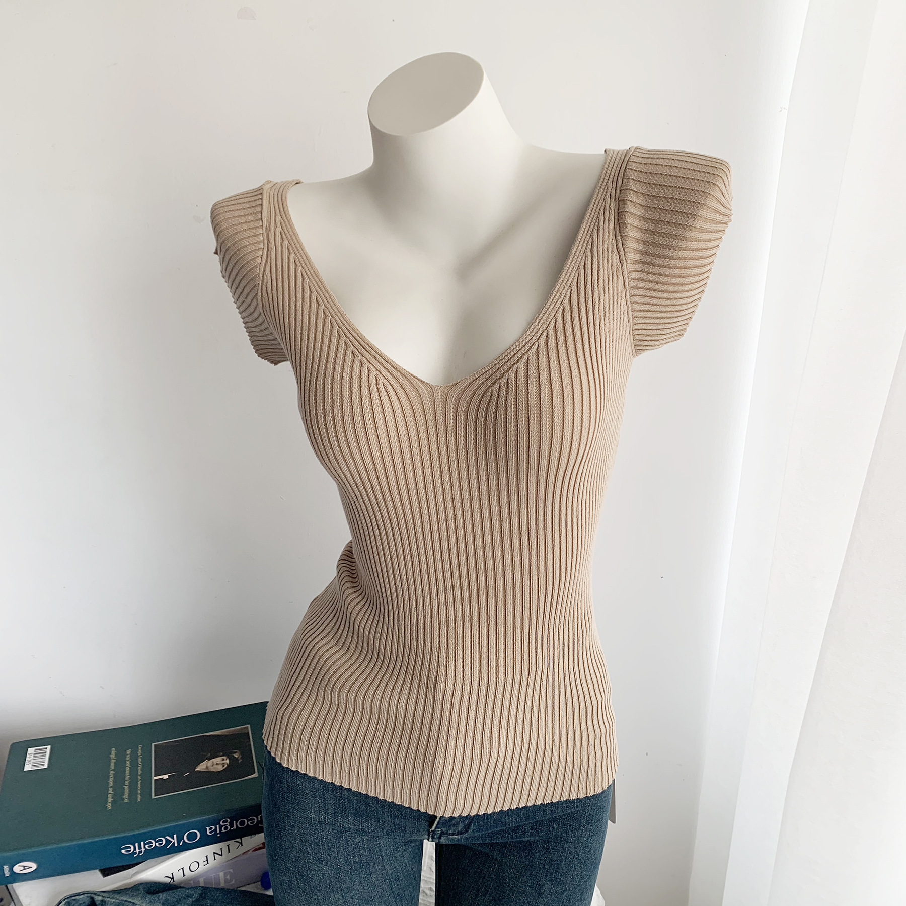 기질 슬림 핏 딥 V 넥 피겨핏 Feifei 슬리브 여성용 슬림 핏 반소매 스웨터 티셔츠스토어 가기
