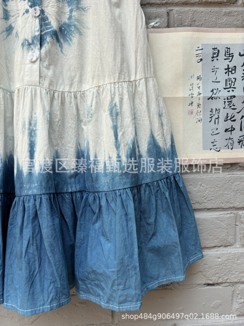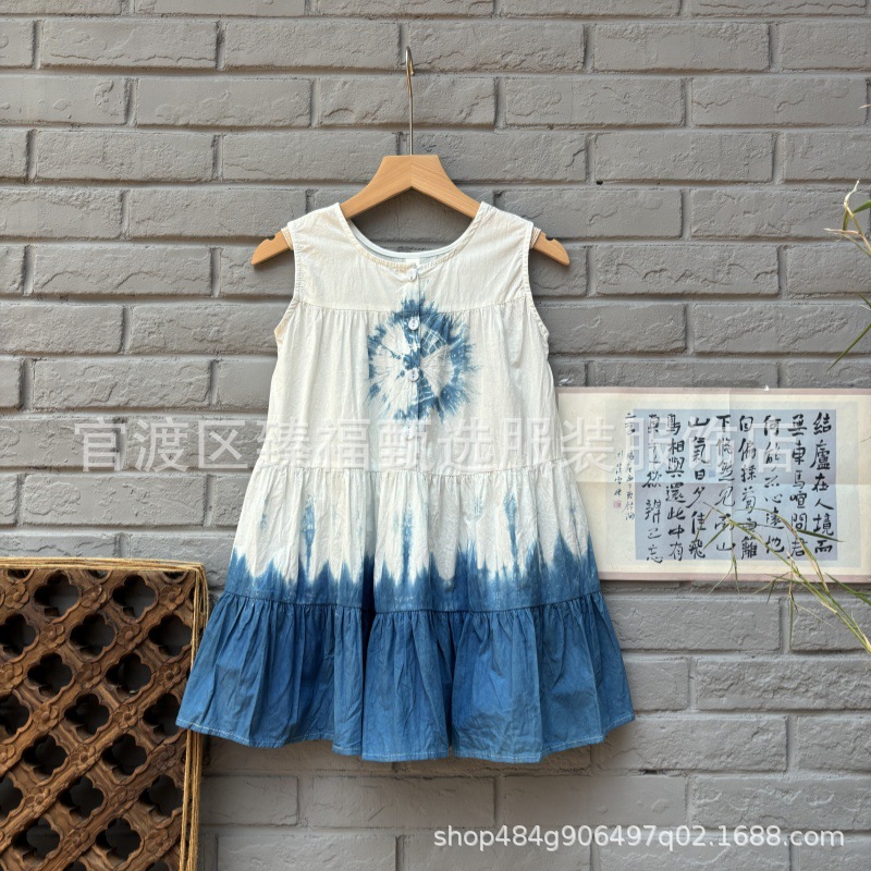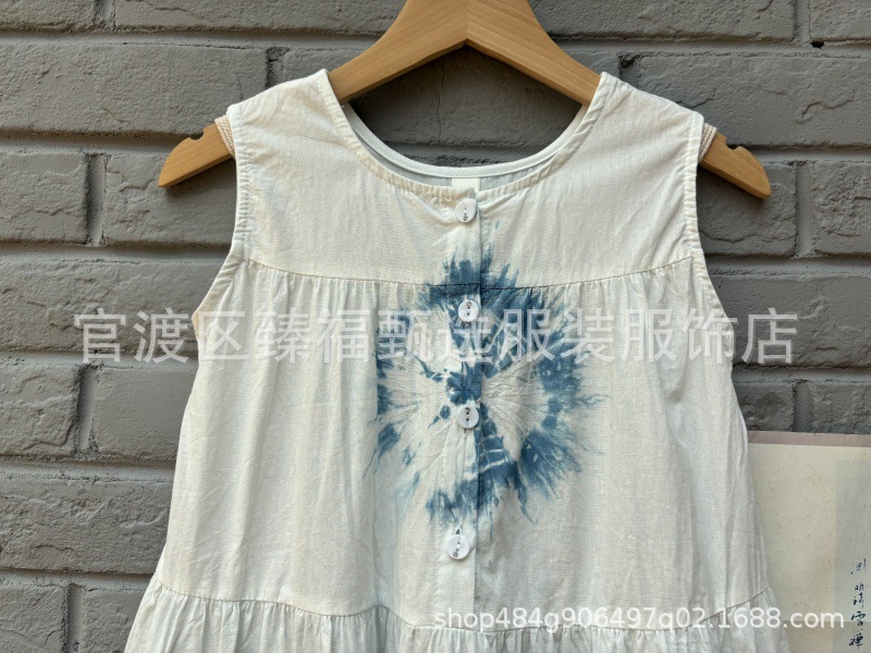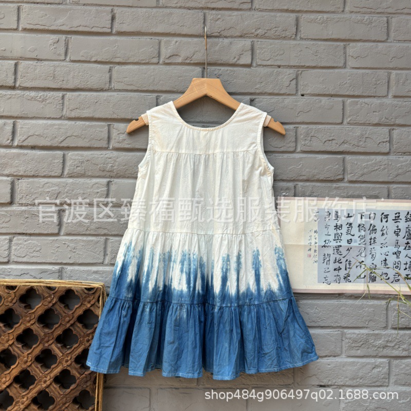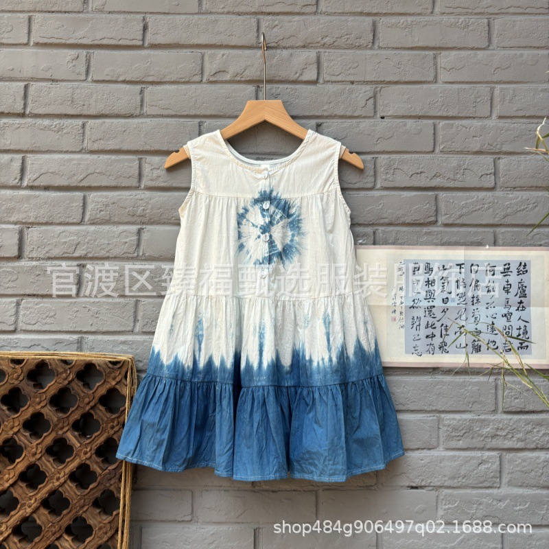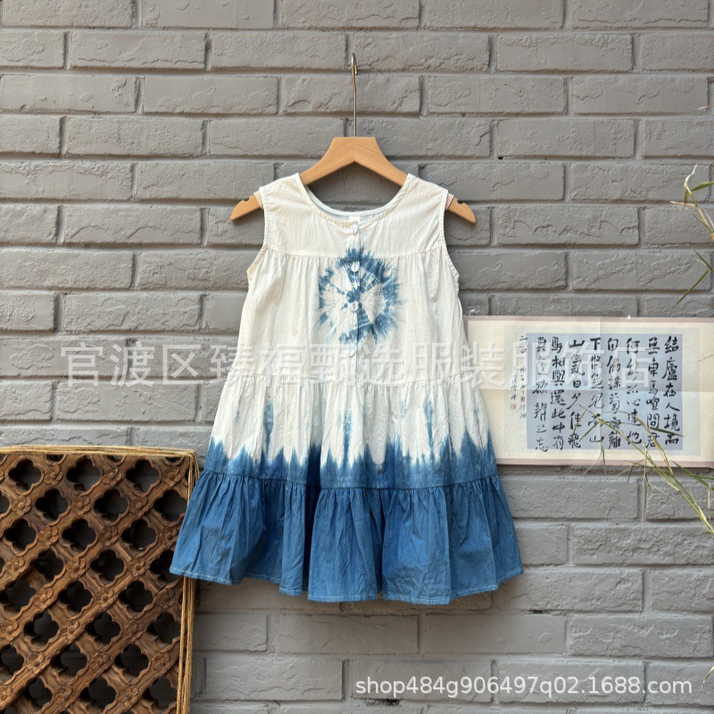 예술적 순수한면 고대 마을 어린이 소녀 조끼 단어 넥타이 염료 푸른 흰색 염료 해바라기 원피스 조끼 치마