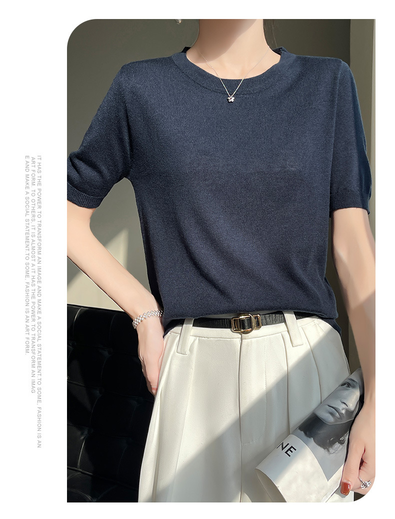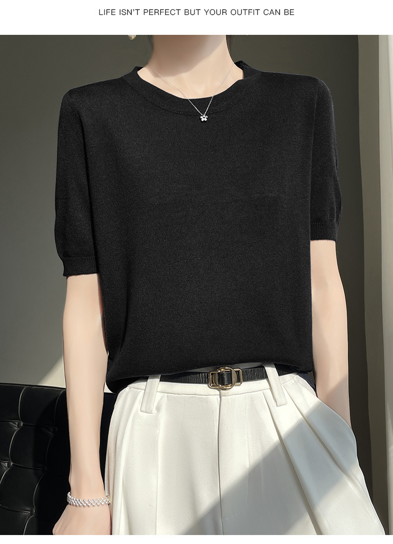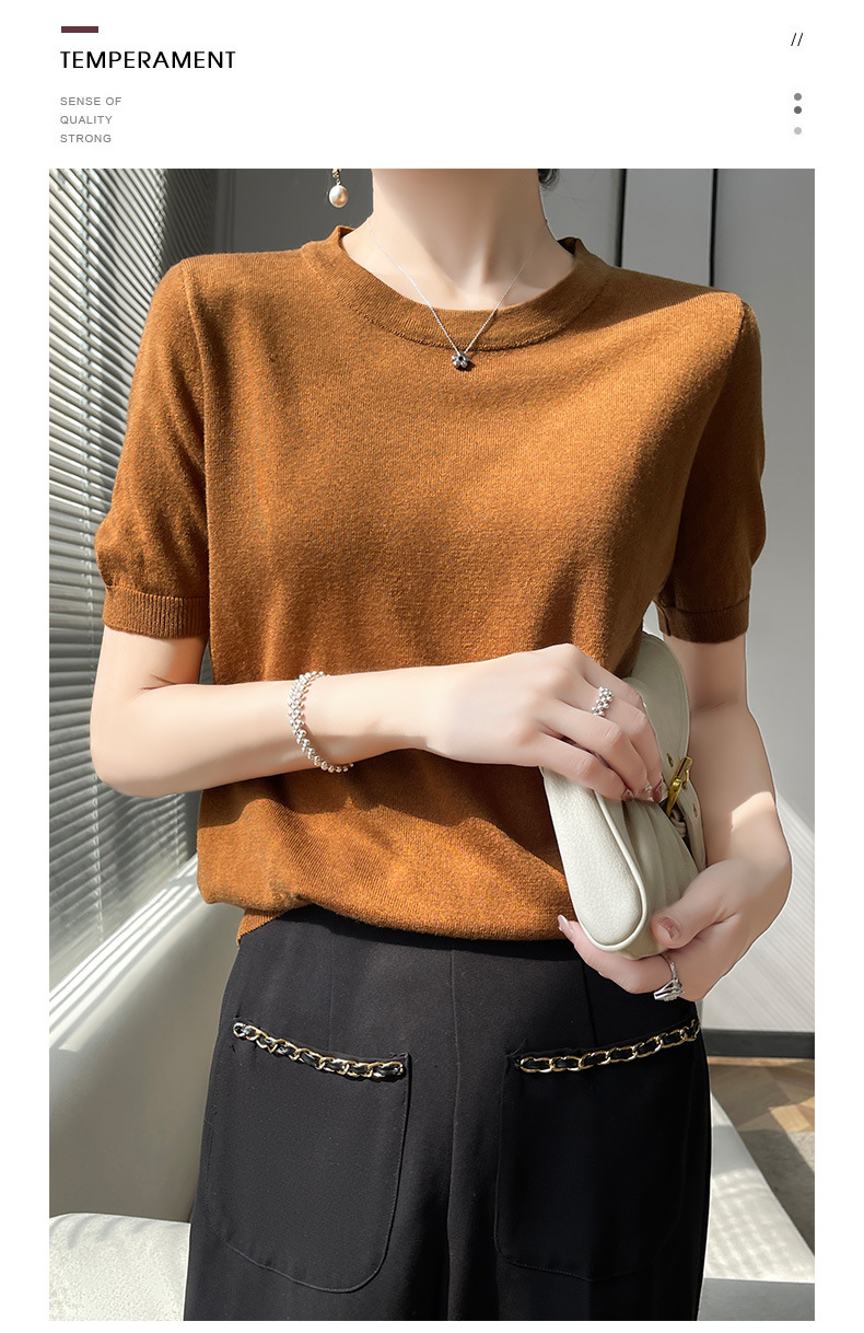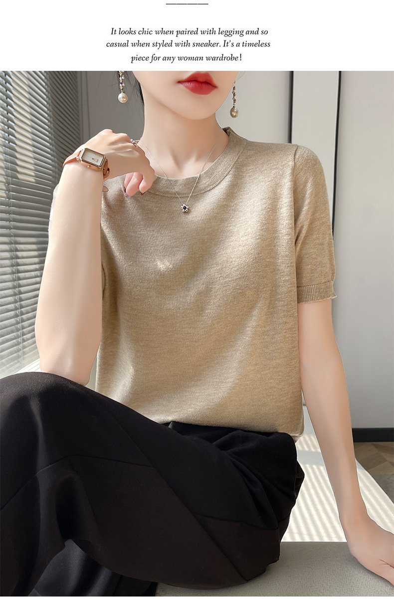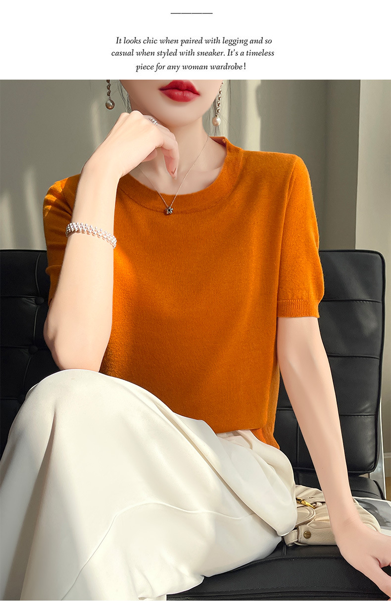 2024 년 봄과 여름 최악의 얇은 텐셀 울 반팔 여성용 루즈 라운드 넥 티셔츠 솔리드 컬러 플러스 사이즈 니트 스웨터 반팔스토어 가기