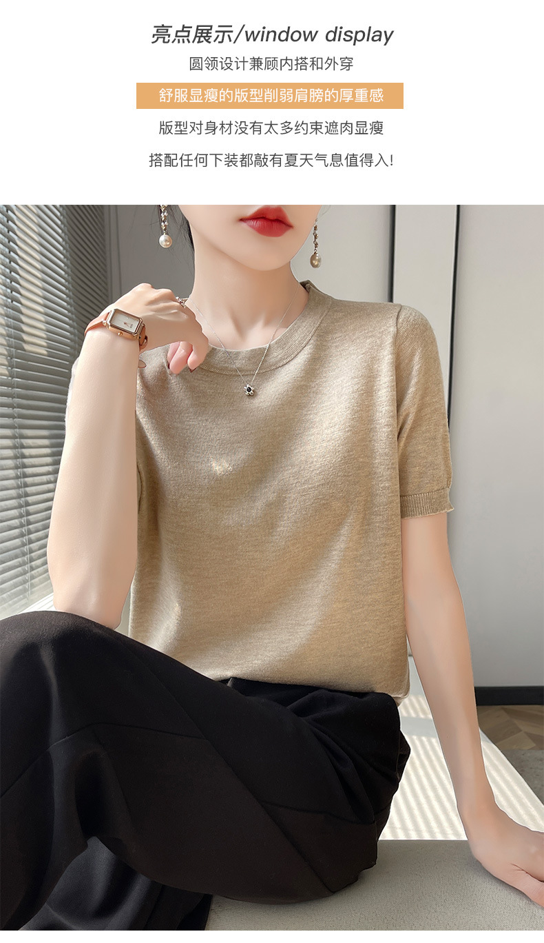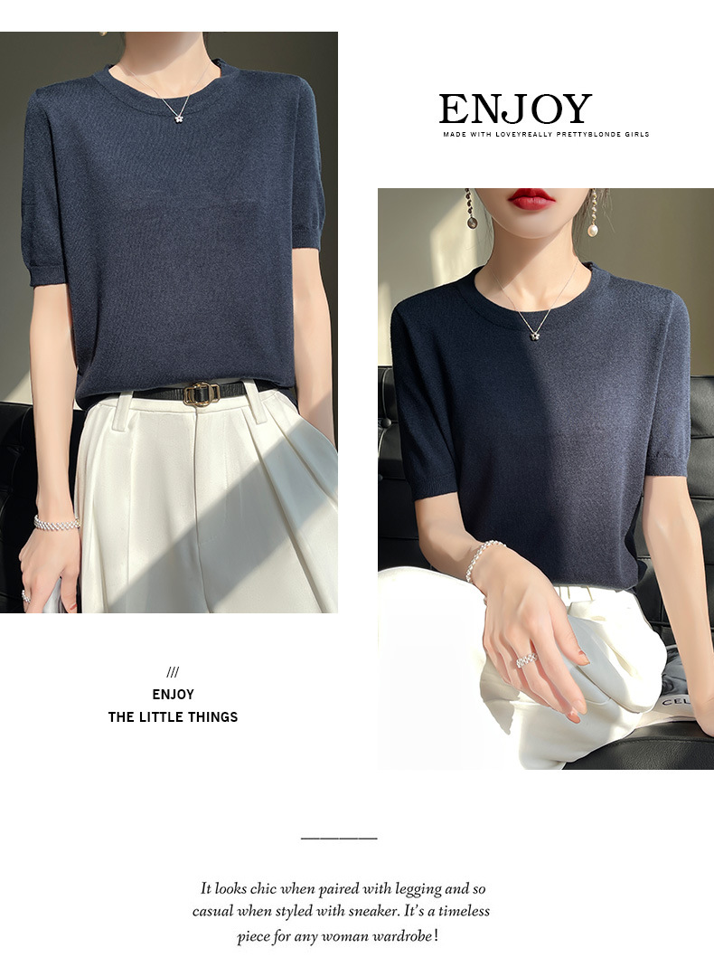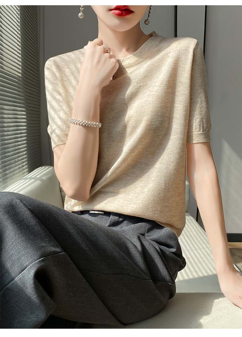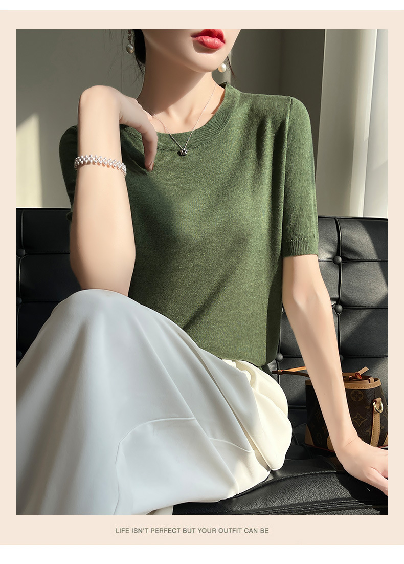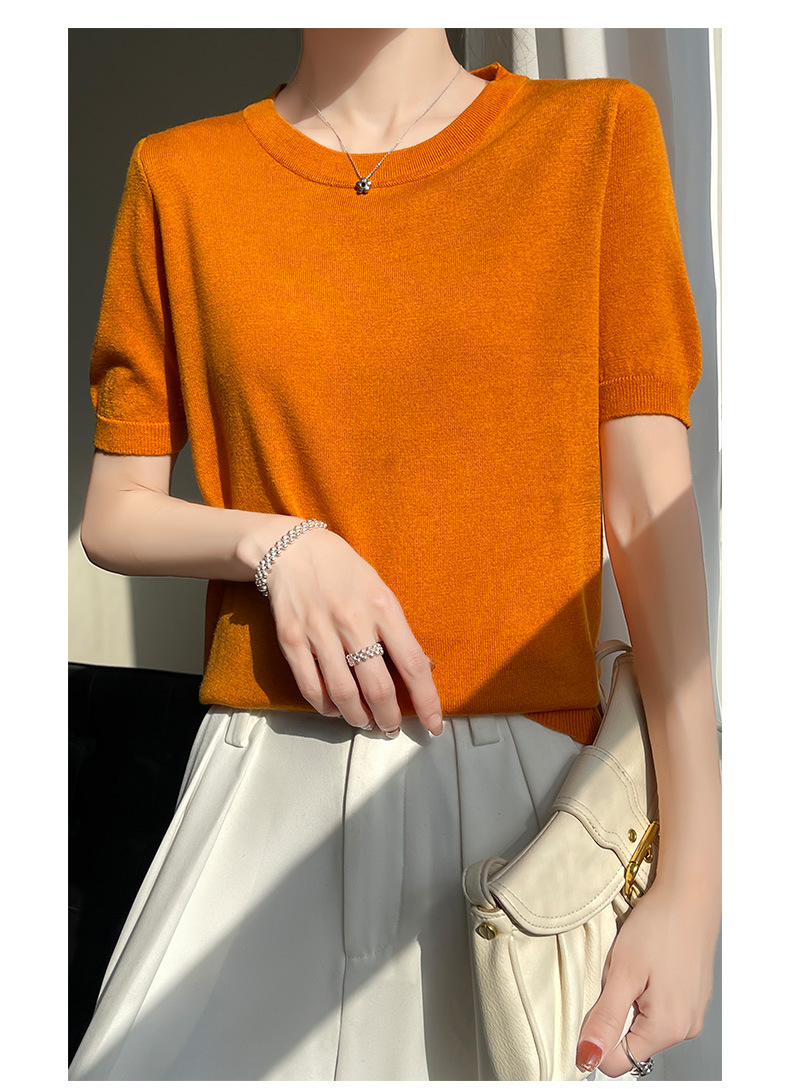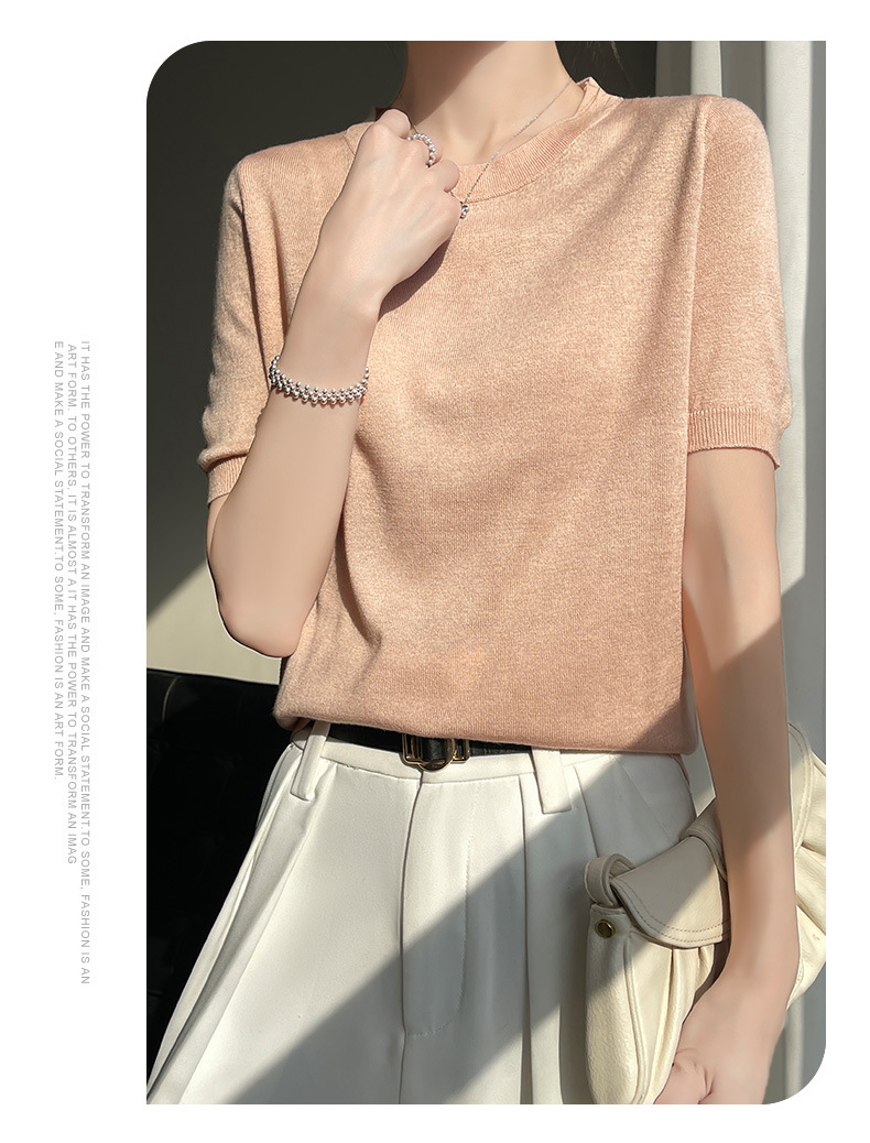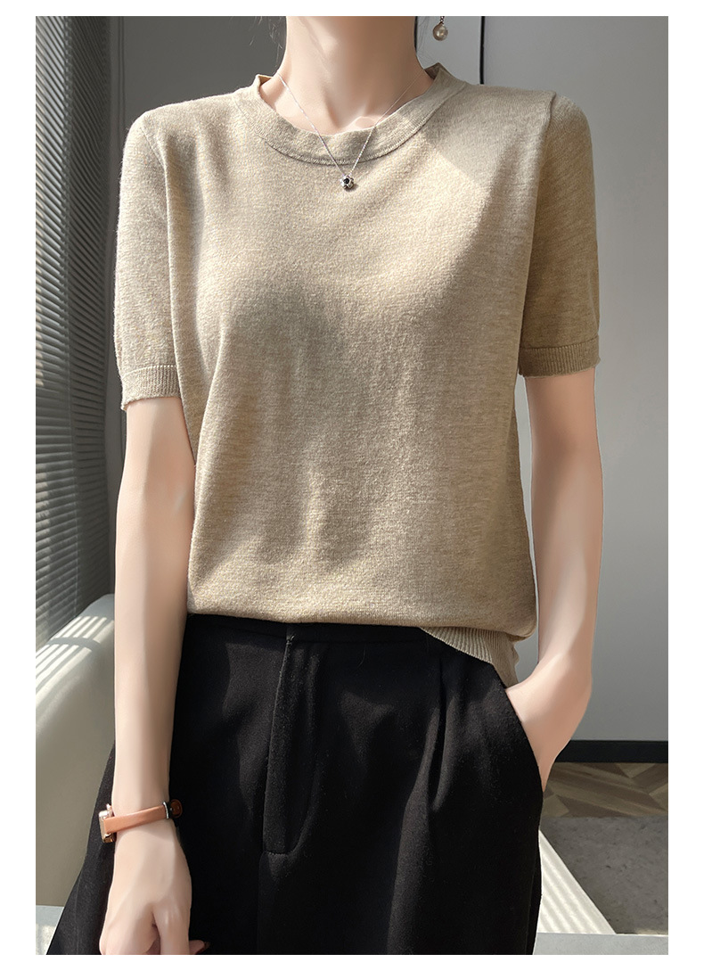 2024 년 봄과 여름 최악의 얇은 텐셀 울 반팔 여성용 루즈 라운드 넥 티셔츠 솔리드 컬러 플러스 사이즈 니트 스웨터 반팔스토어 가기