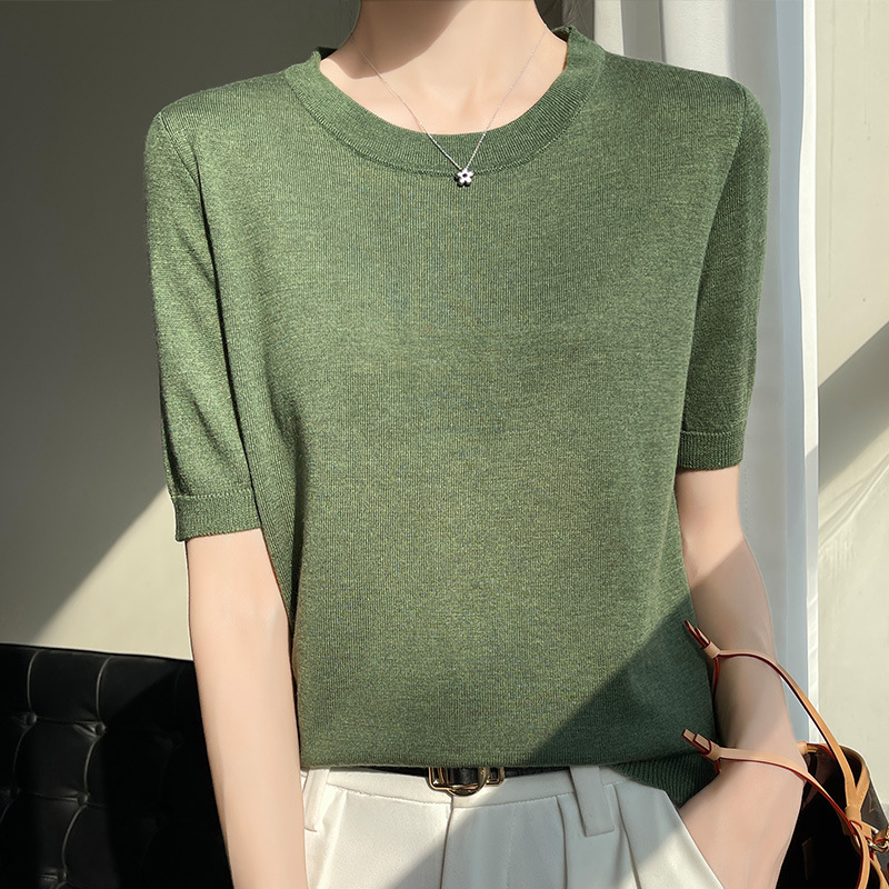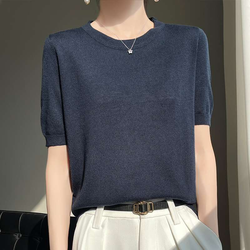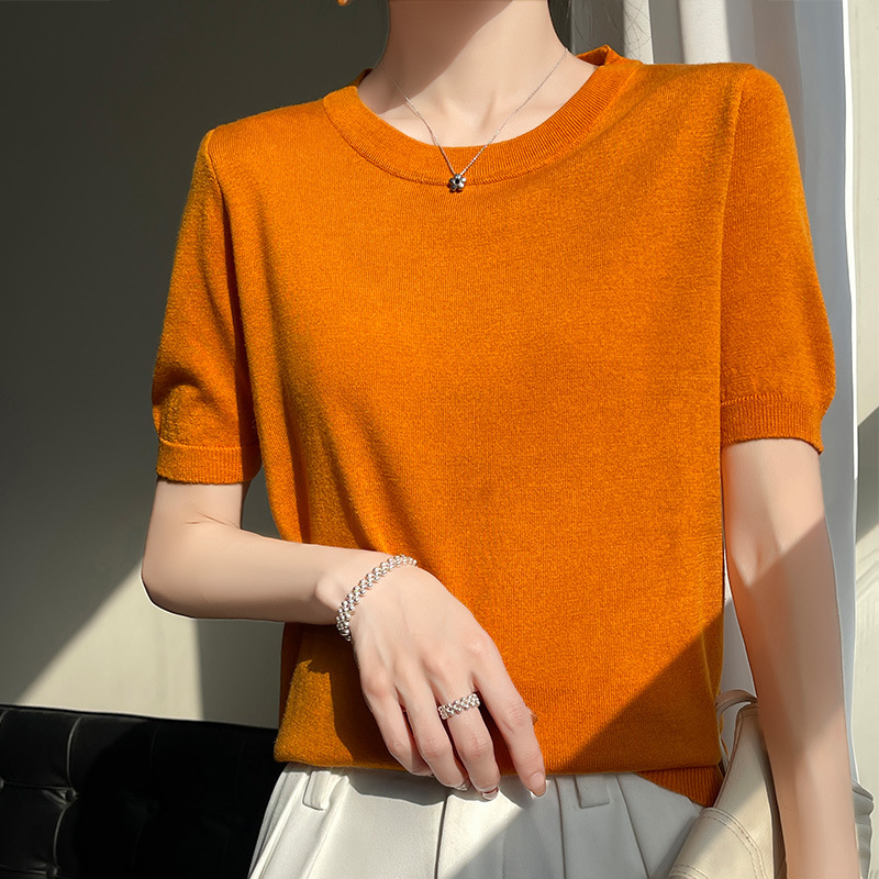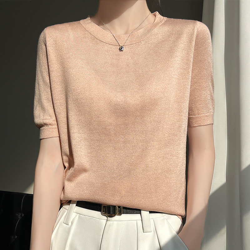 2024 년 봄과 여름 최악의 얇은 텐셀 울 반팔 여성용 루즈 라운드 넥 티셔츠 솔리드 컬러 플러스 사이즈 니트 스웨터 반팔