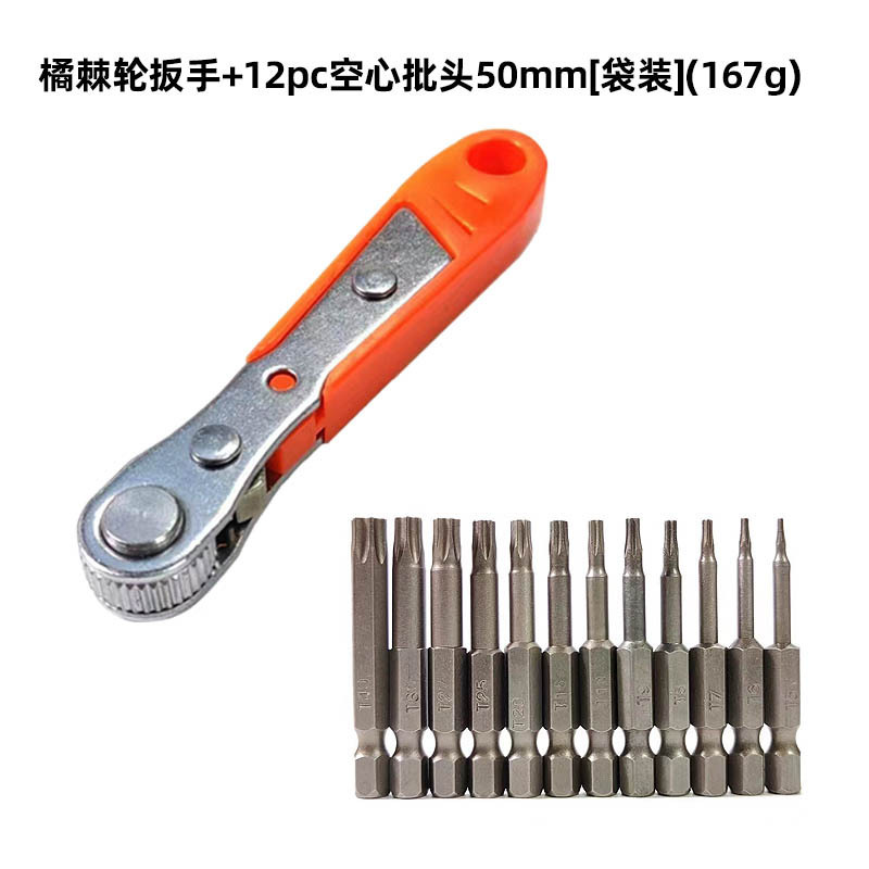 产品名称:   套装:棘轮扳手+12pcs空心批头50mm 包装方式:   塑袋装
