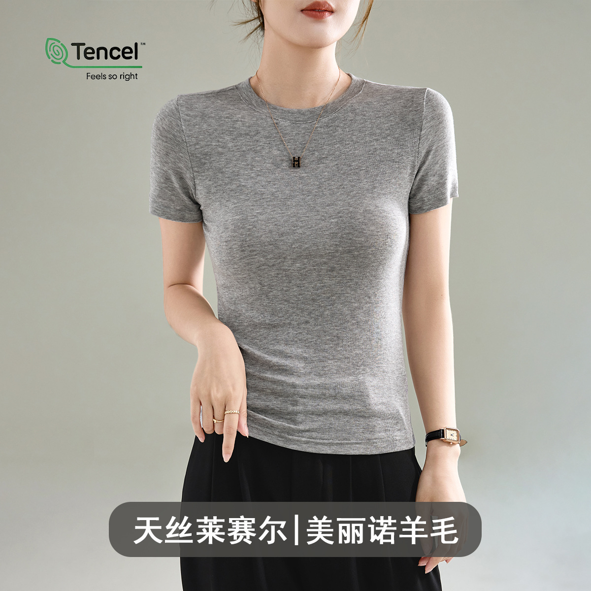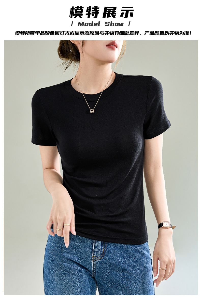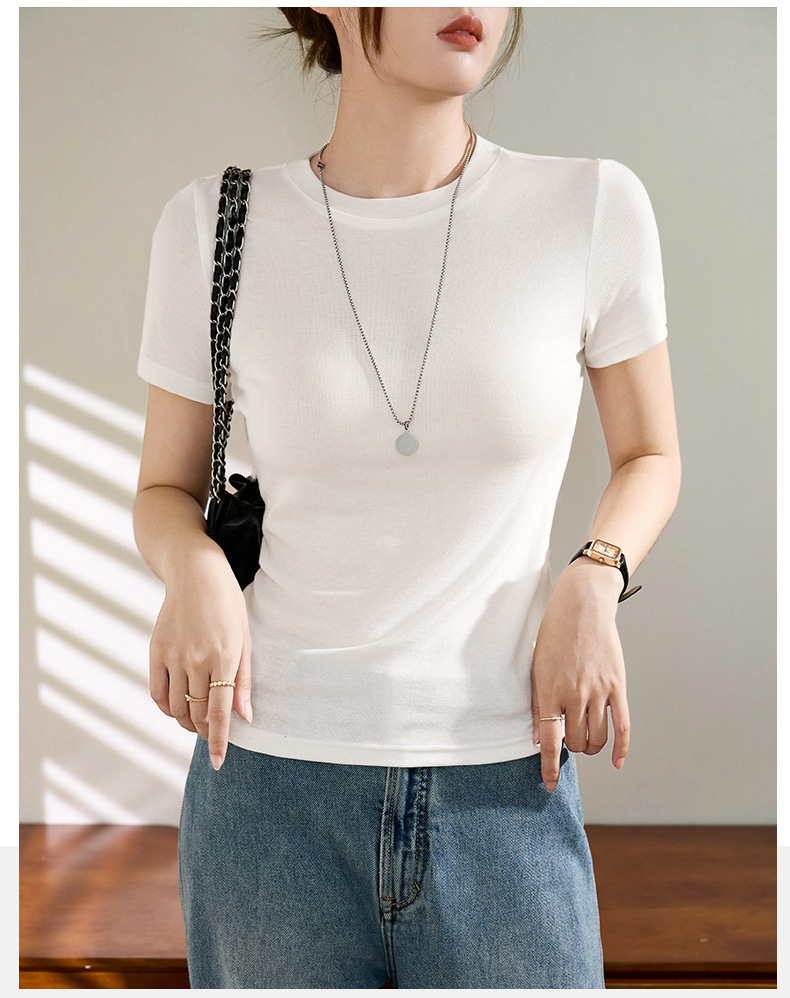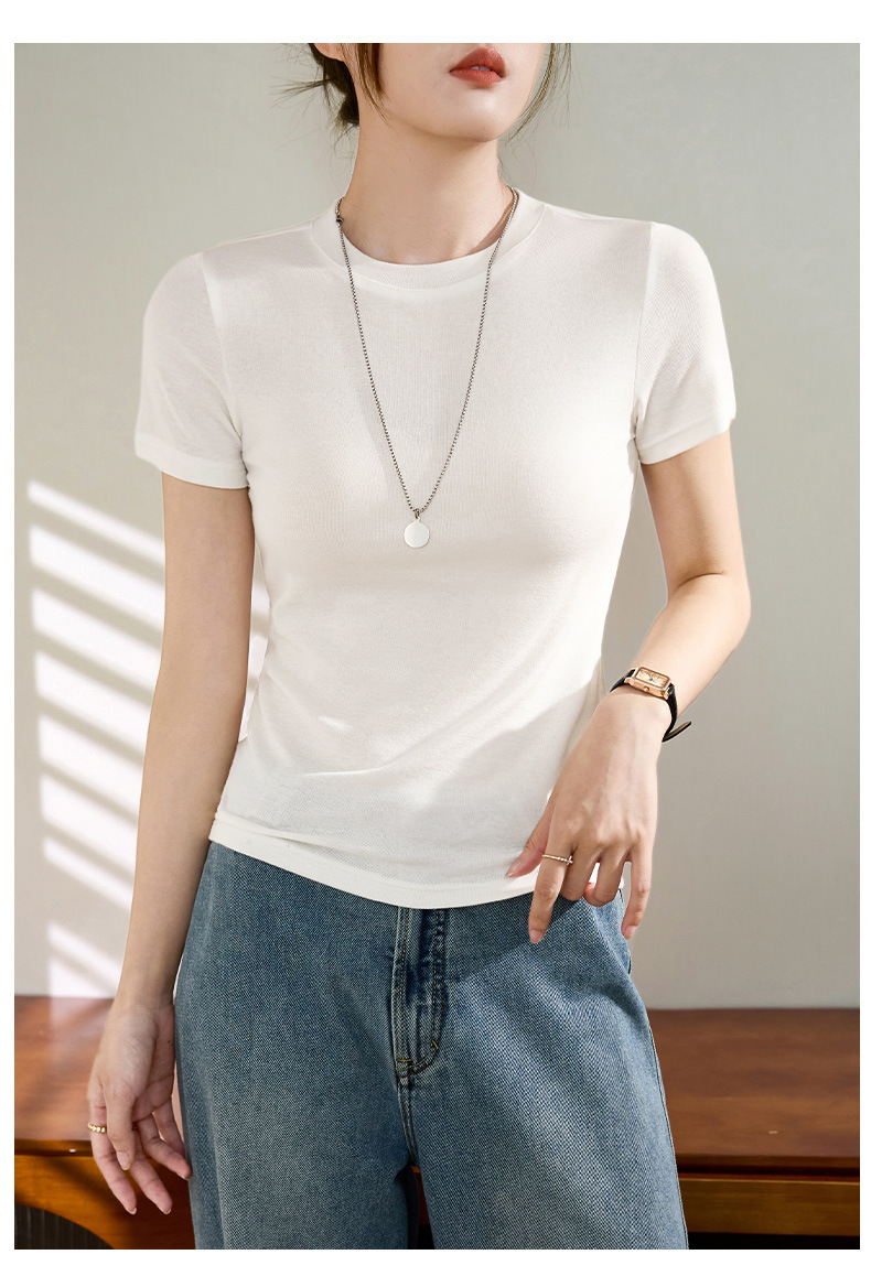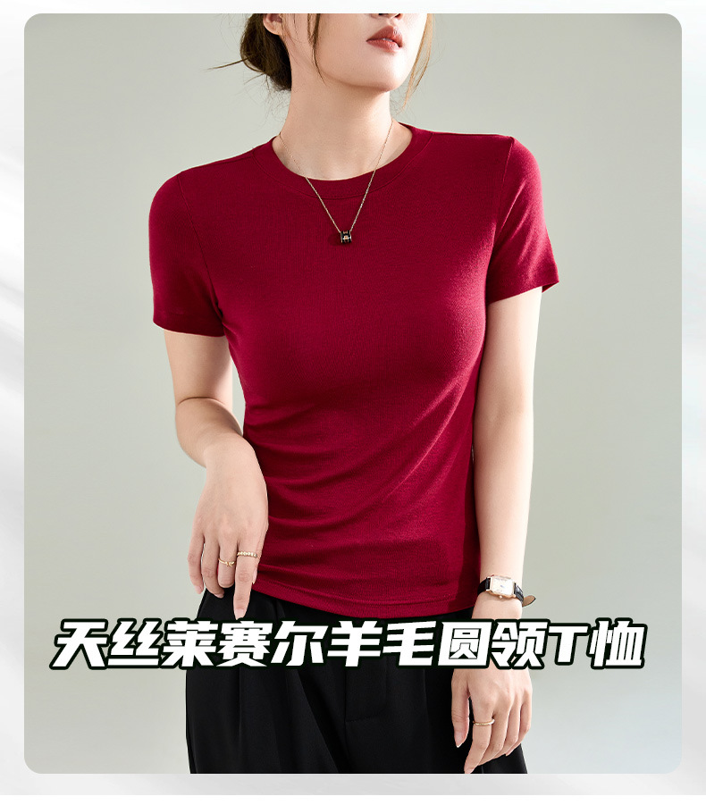 Wool Tencel Lyocell Crewneck Shoulder 티셔츠 여성 하이 퀄리티 여름 새로운 슬림 핏 부드러운 분위기 탑스토어 가기