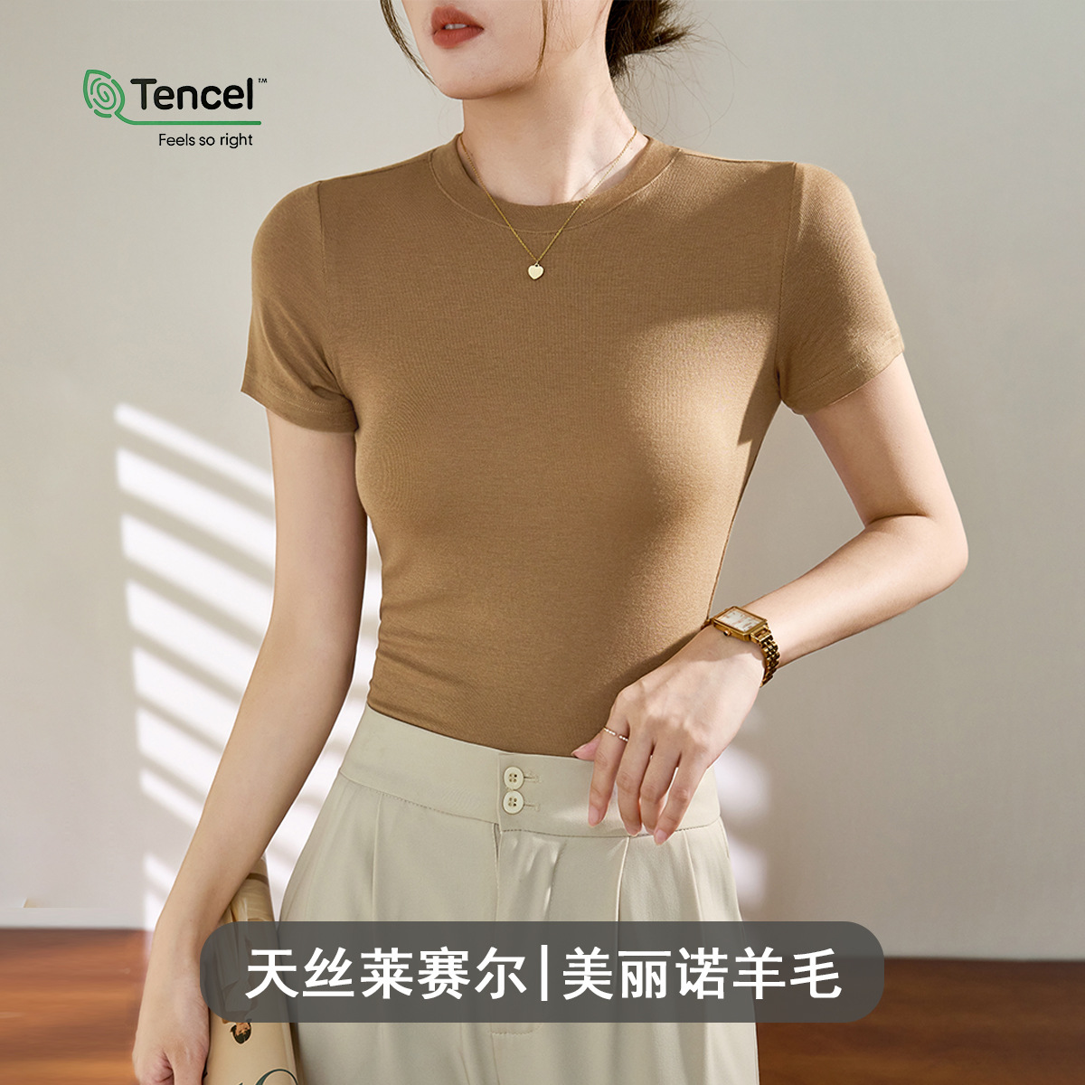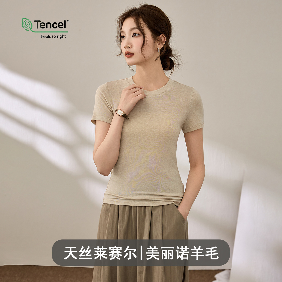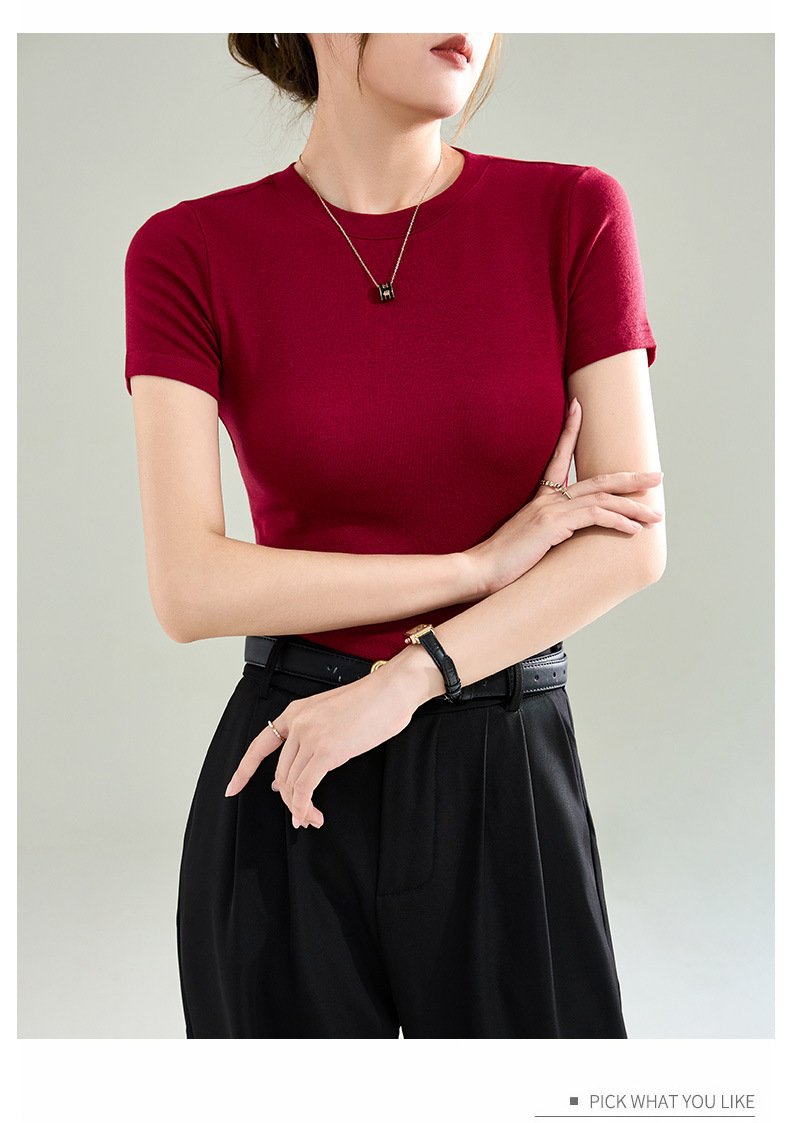 Wool Tencel Lyocell Crewneck Shoulder 티셔츠 여성 하이 퀄리티 여름 새로운 슬림 핏 부드러운 분위기 탑