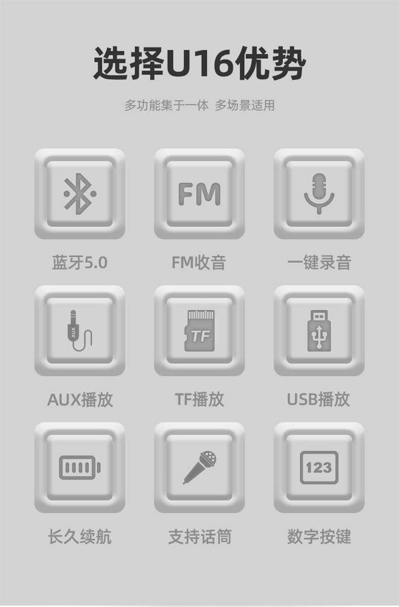 U16 무선 휴대용 블루투스 스피커, 강력한 베이스와 노래방 기능 탑재