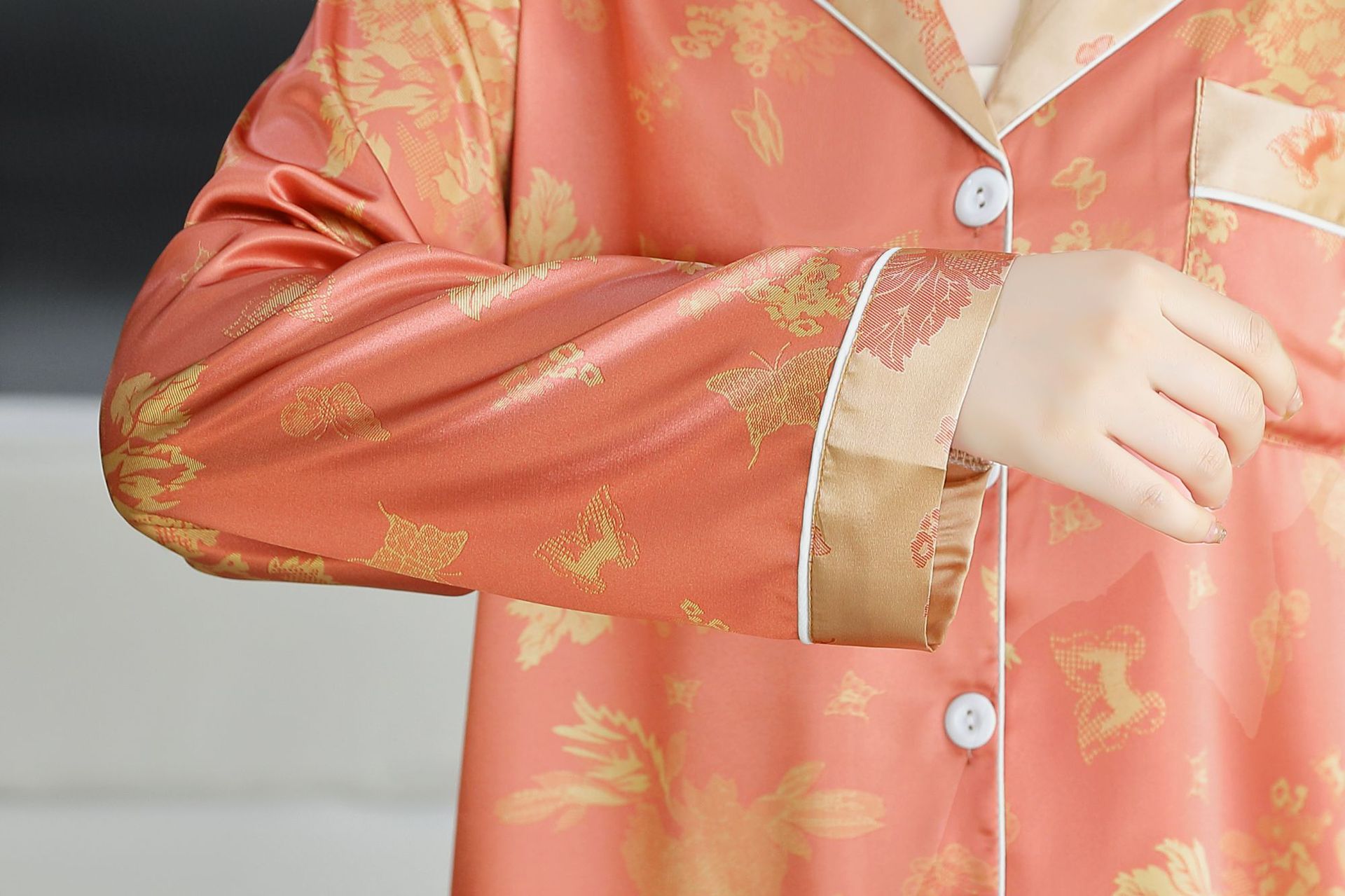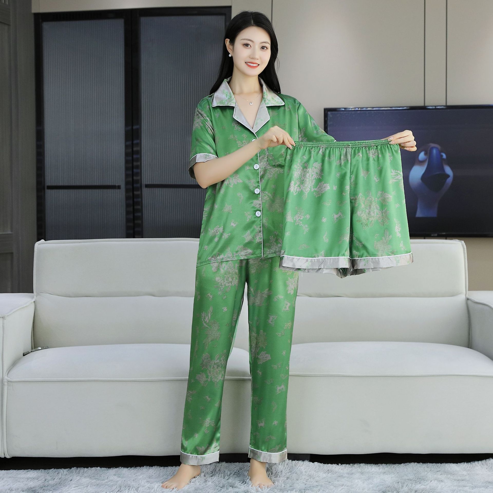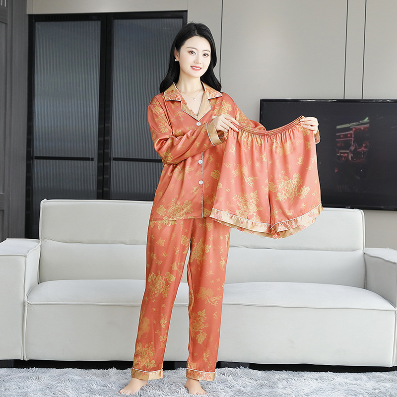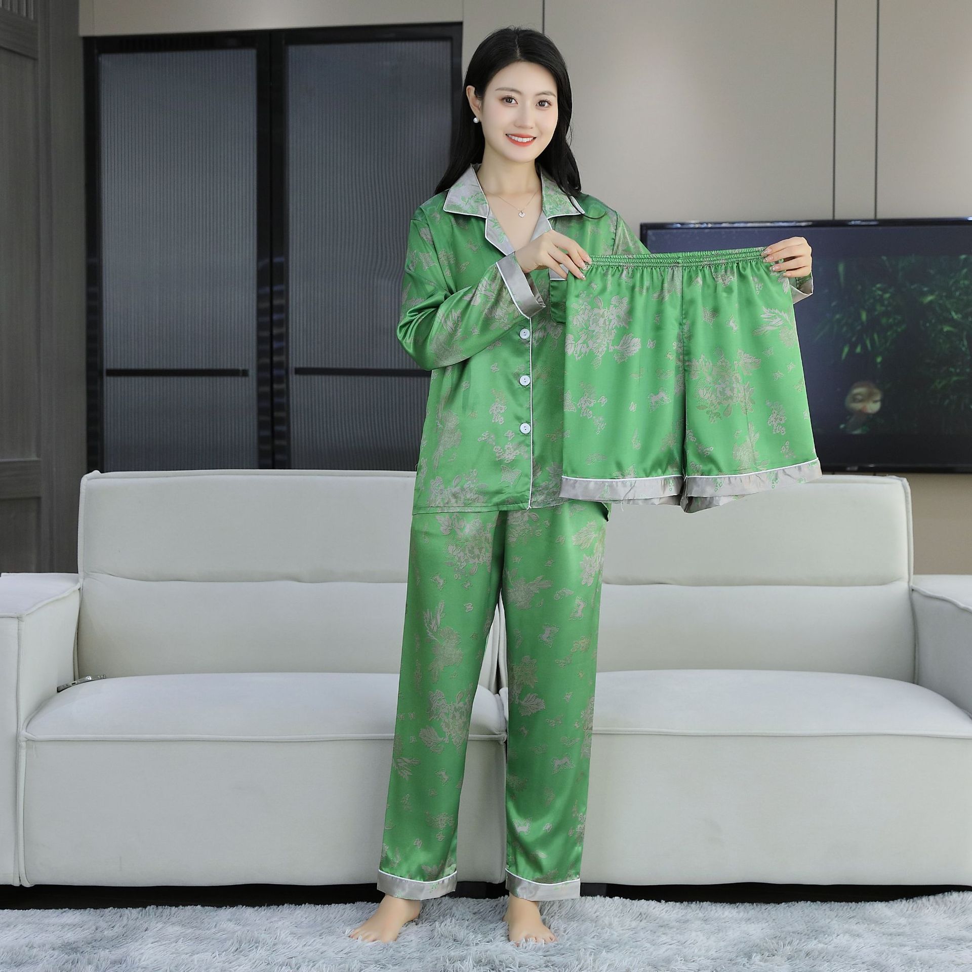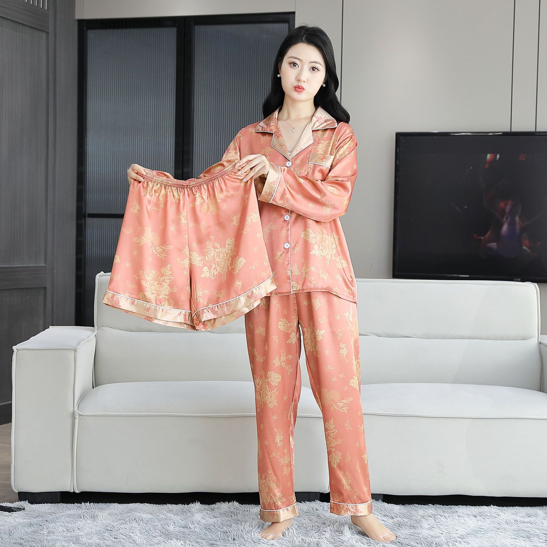 여성용 모조 실크 잠옷, 봄, 가을 3피스 세트, 나비 루즈 스노우 잠옷, 고급스럽고 가벼운 럭셔리 스타일, 집 밖에서 착용 가능스토어 가기
