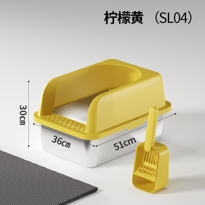 • 밝은 노란색의 두꺼운 스테인레스 스틸 고양이 배변 상자 + 이중층 모래 차단 패드 + 다기능 고양이 배변 삽
