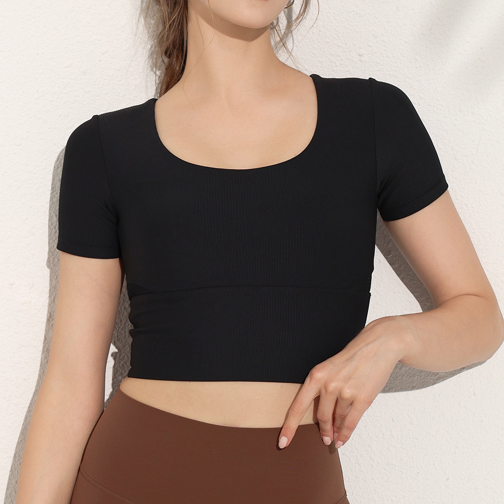 가슴 패드와 플러스 사이즈 원피스 요가 세트 여성의 아름다운 등 바느질 반팔 스포츠 티셔츠 짧은 피트니스 탑 슬리밍