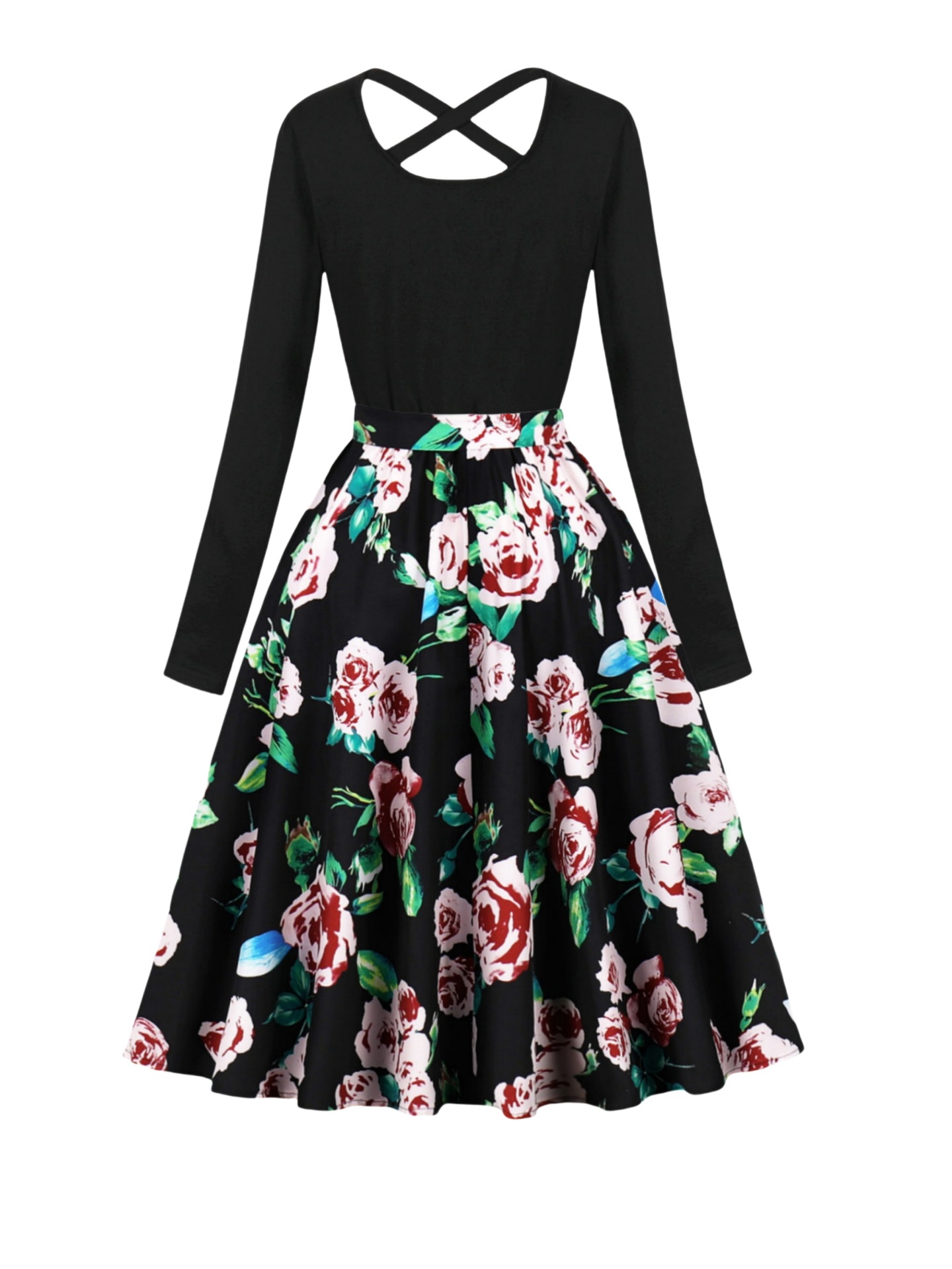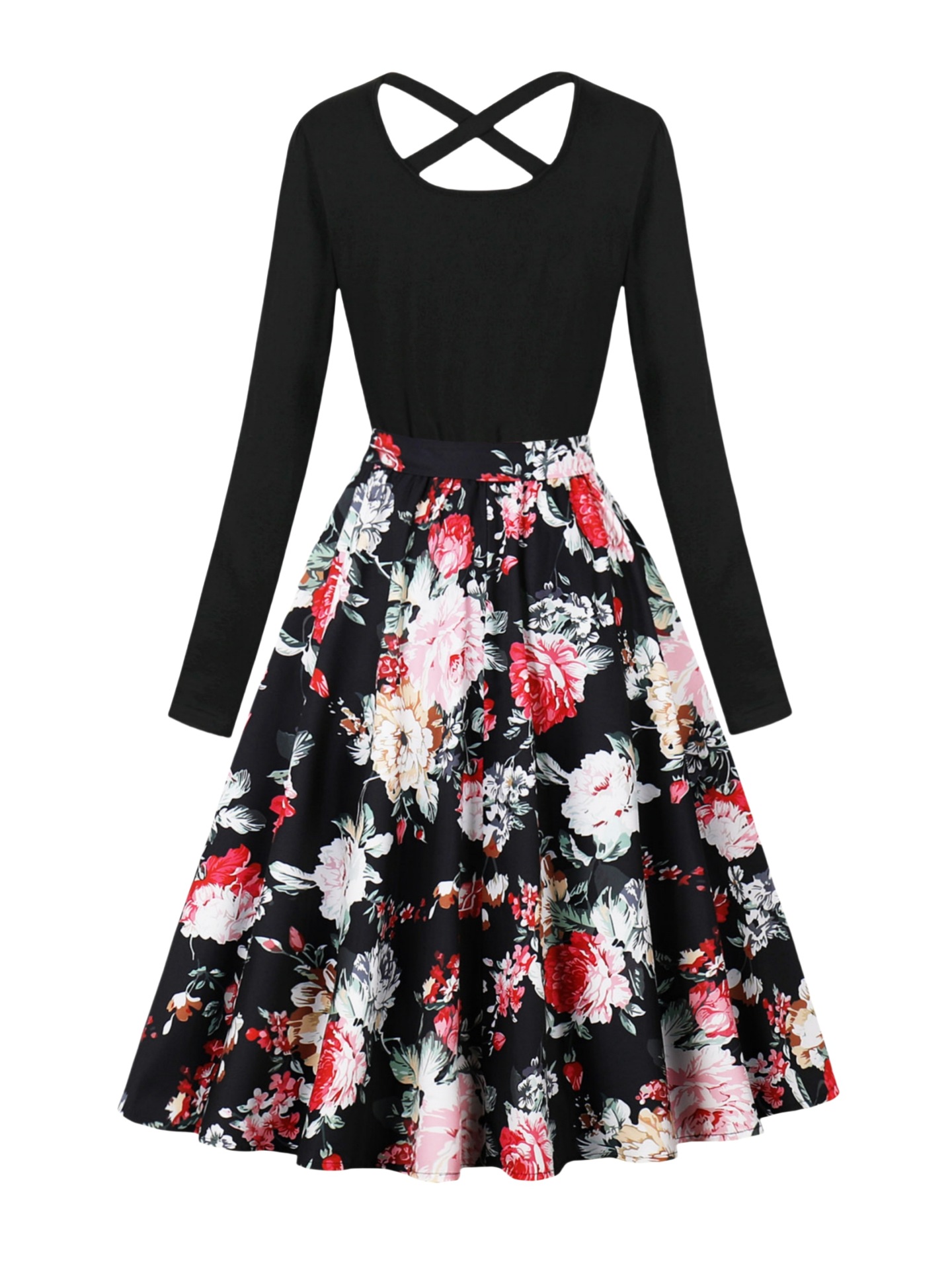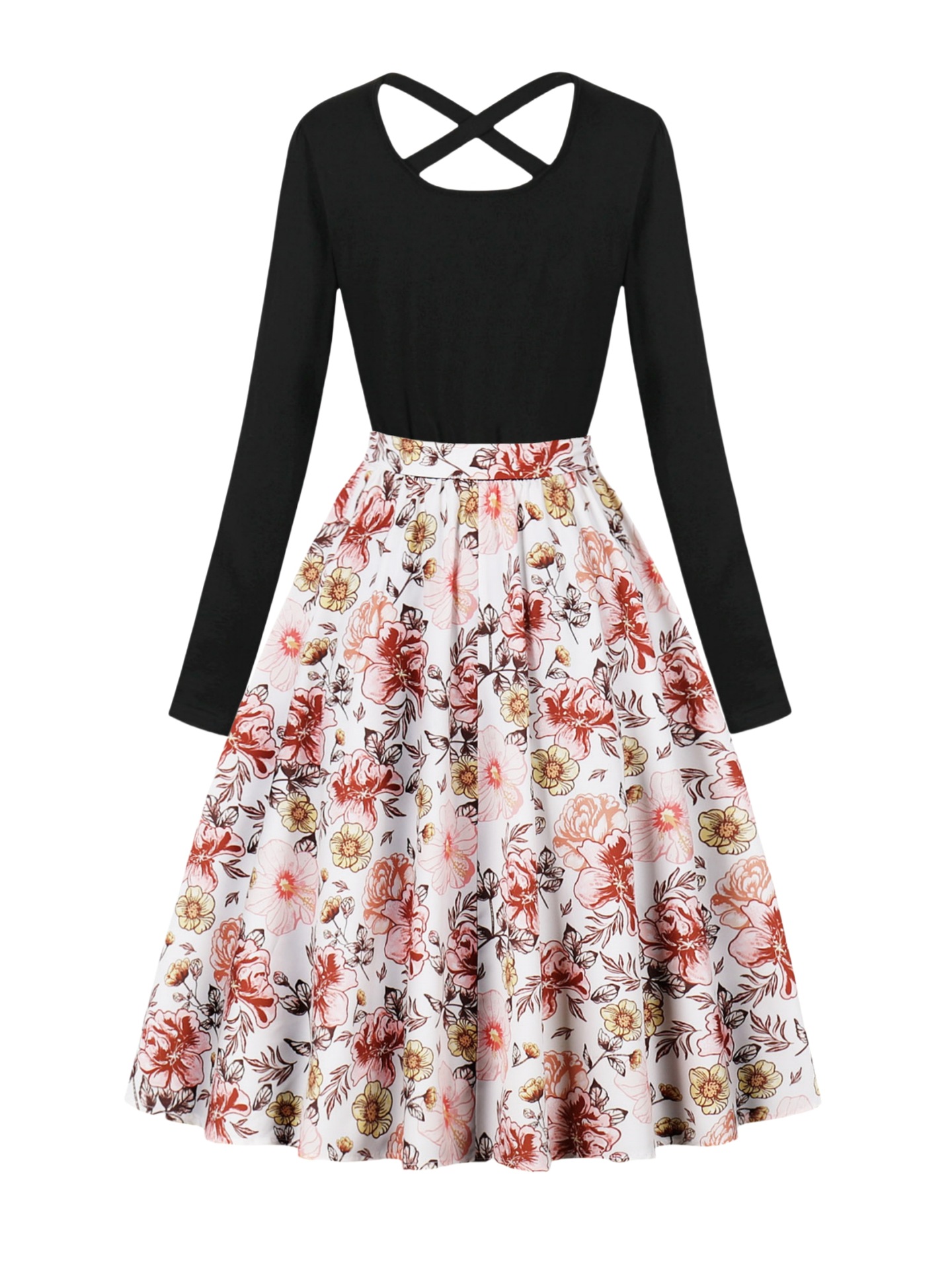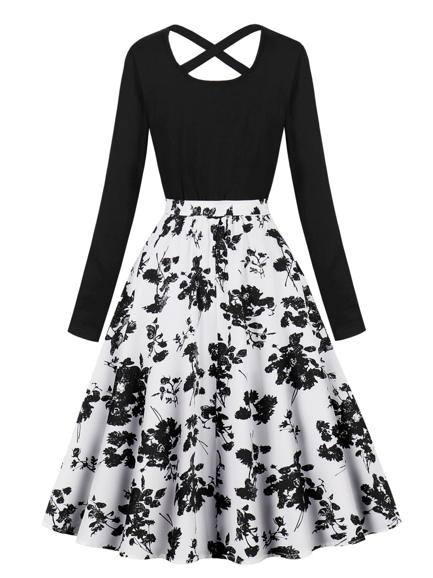 국경 핫 세일 파티 라운드 목 긴 소매 인쇄 원피스