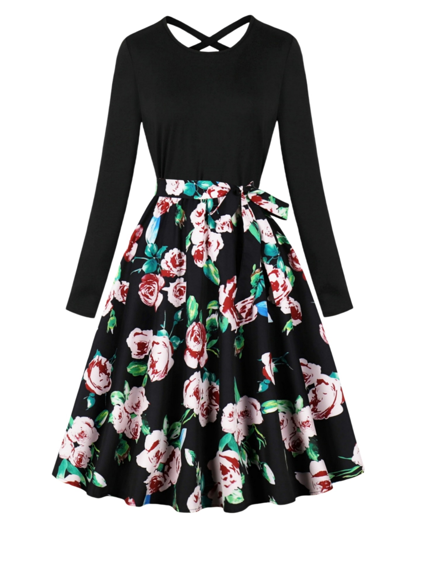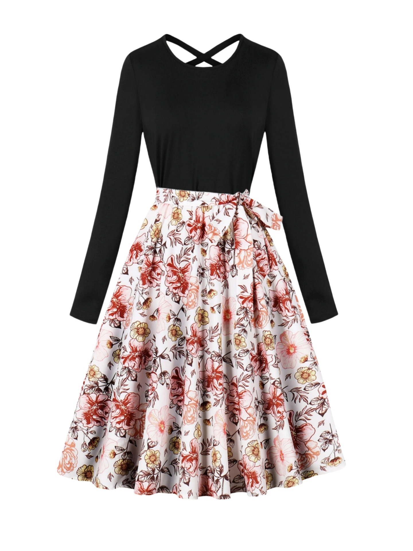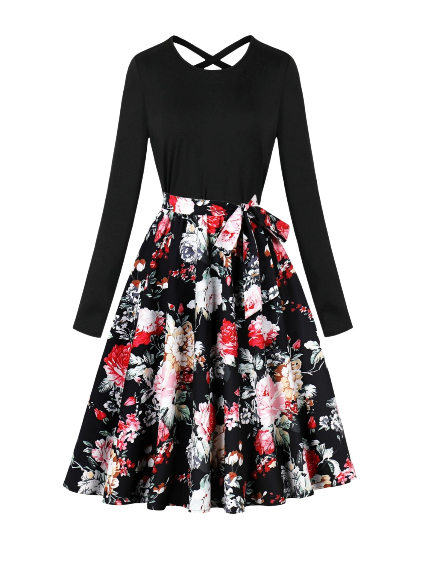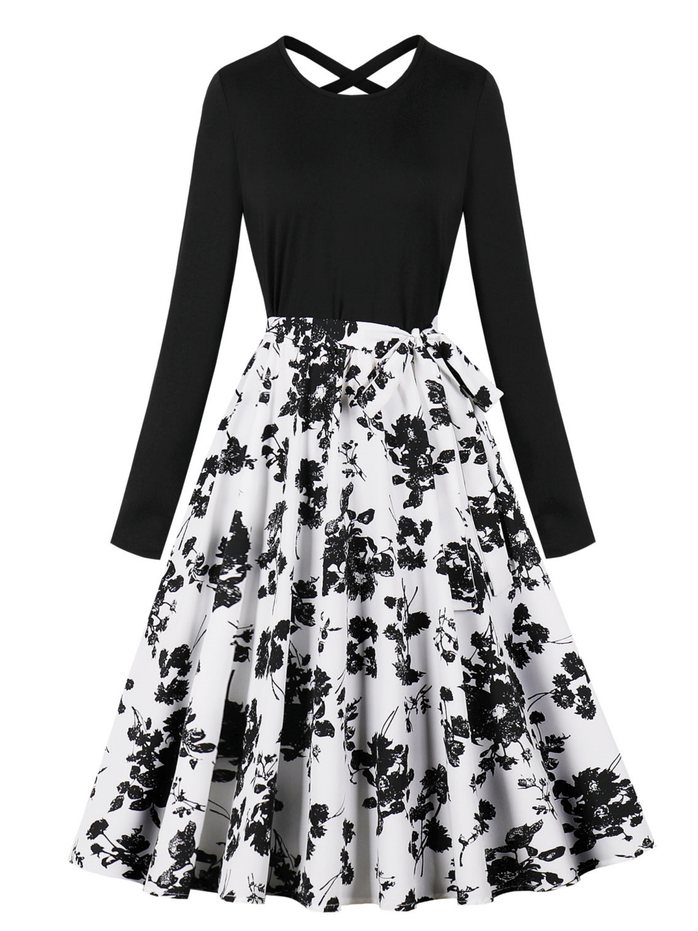 국경 핫 세일 파티 라운드 목 긴 소매 인쇄 원피스